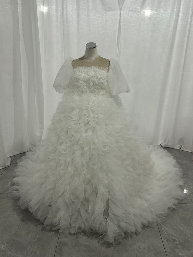 実例写真 !ホワイト 上質オーガンジー もこもこ ベアトップ カラードレス チュールドレス フリルオフショルダー お色直しふわふわ アシメドレス