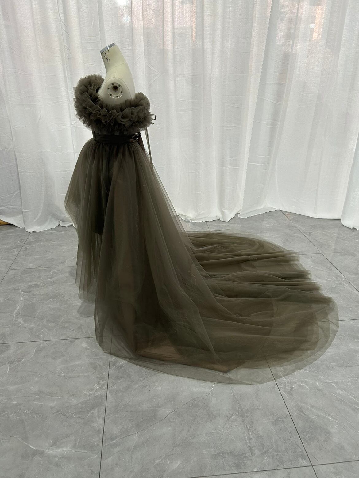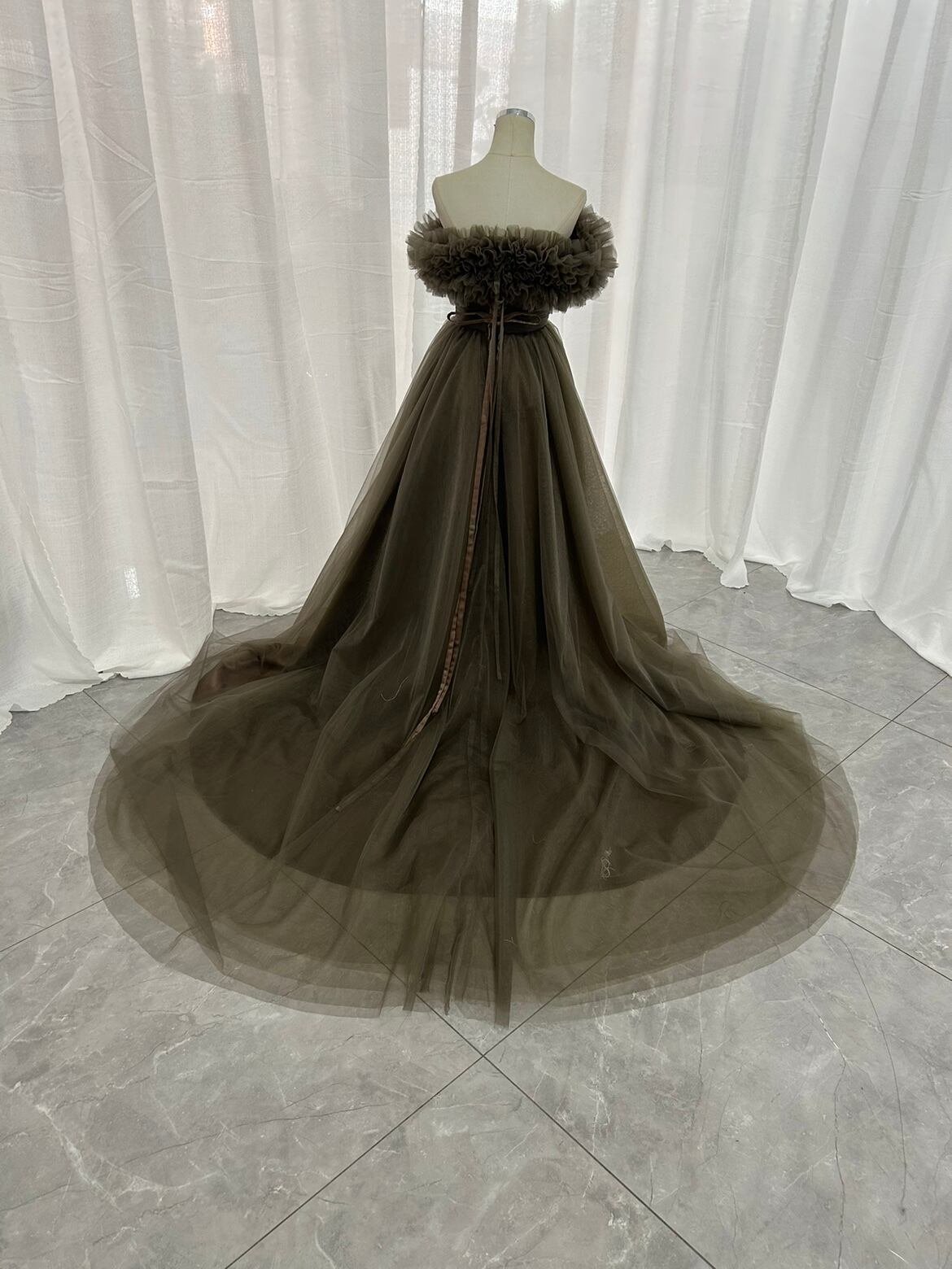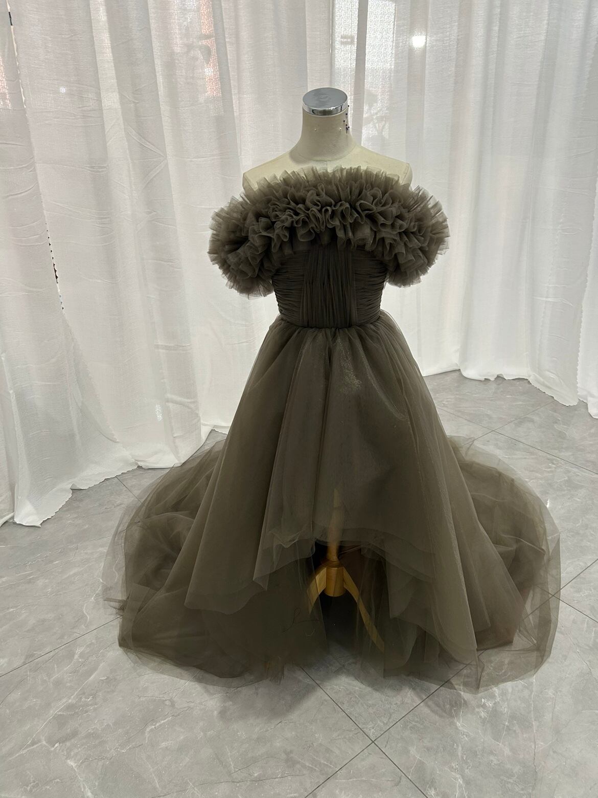 輝きな光彩を放つ 薄 コーヒーの色 取り外しオフショルダー カラードレス ショートインロングド/挙式/前撮り/花嫁
