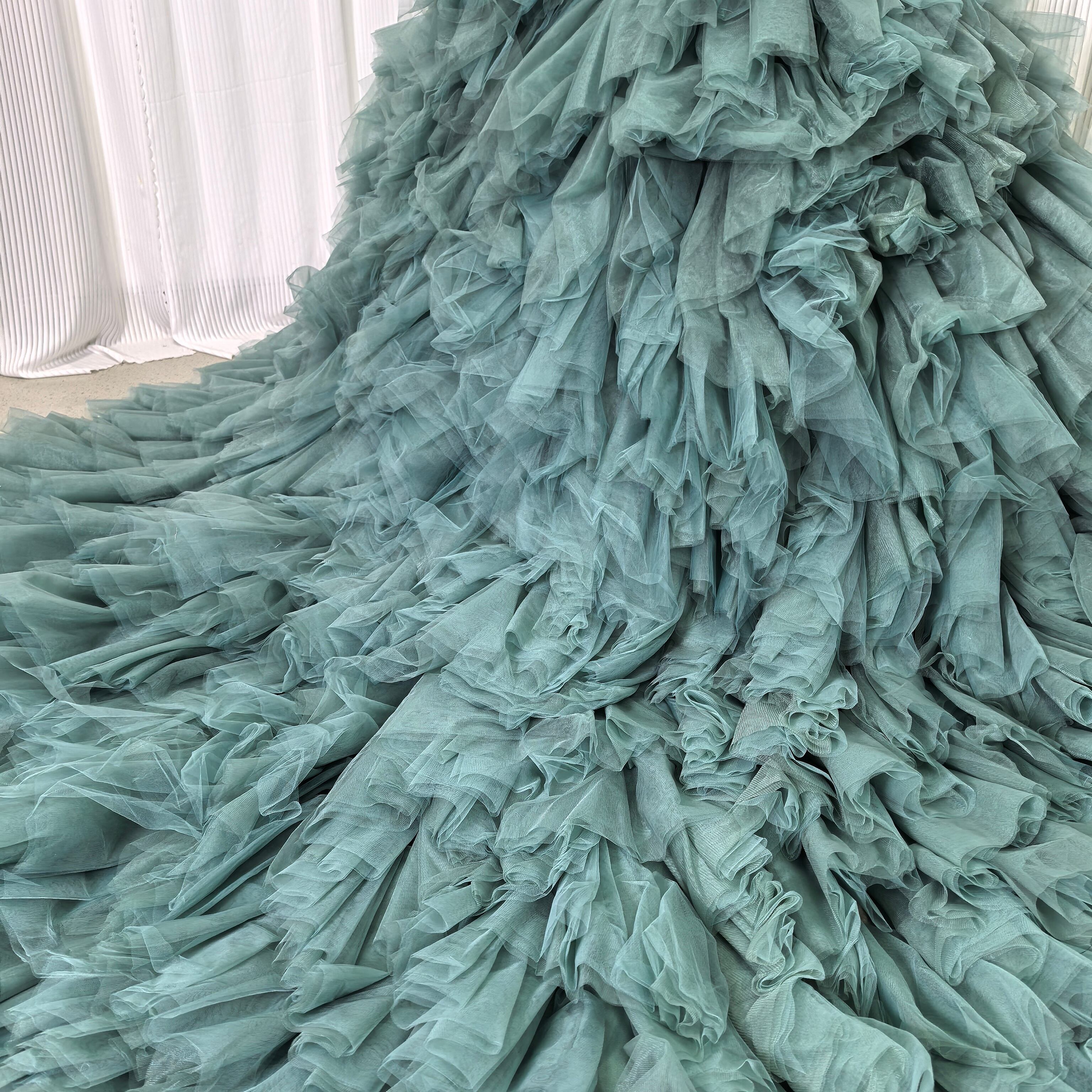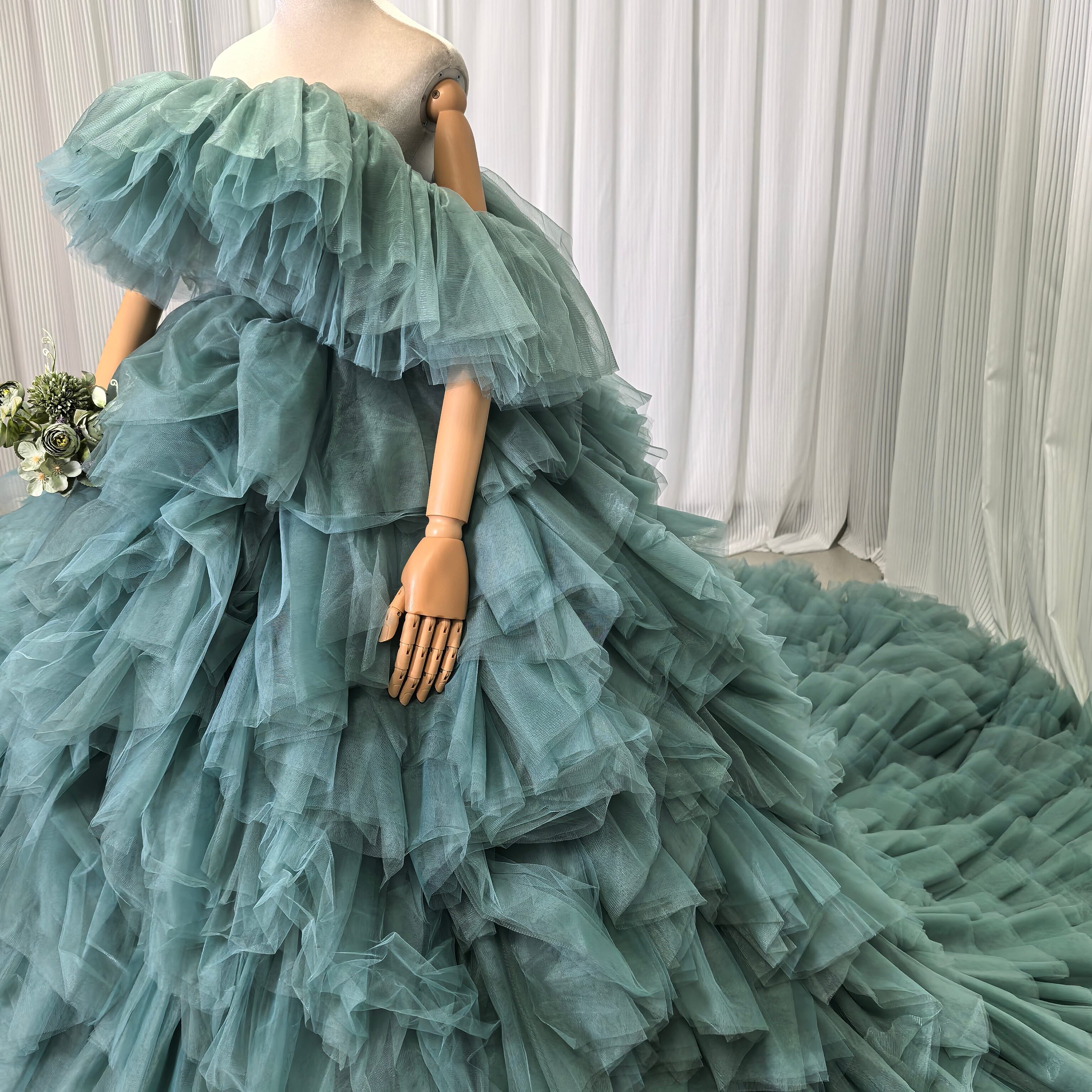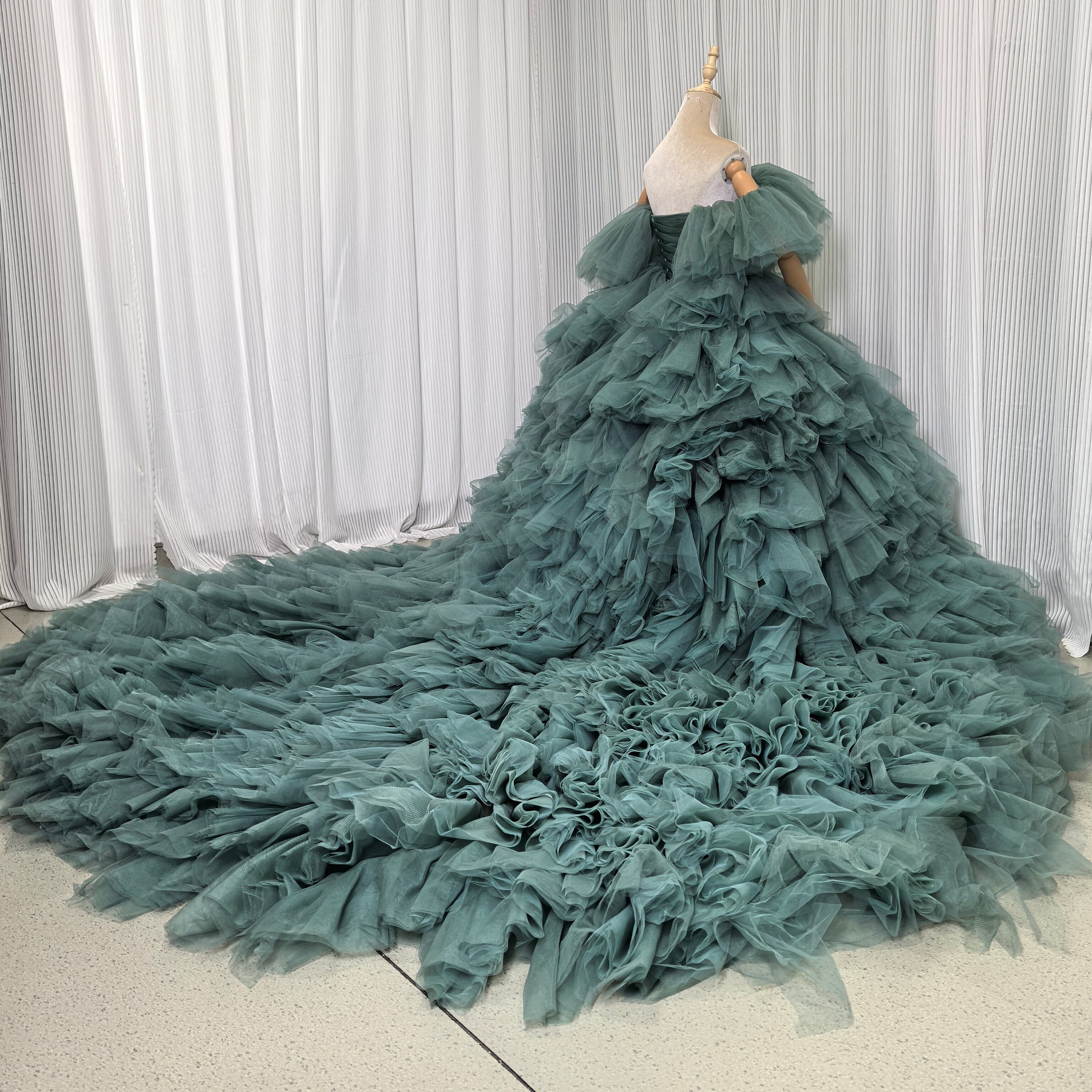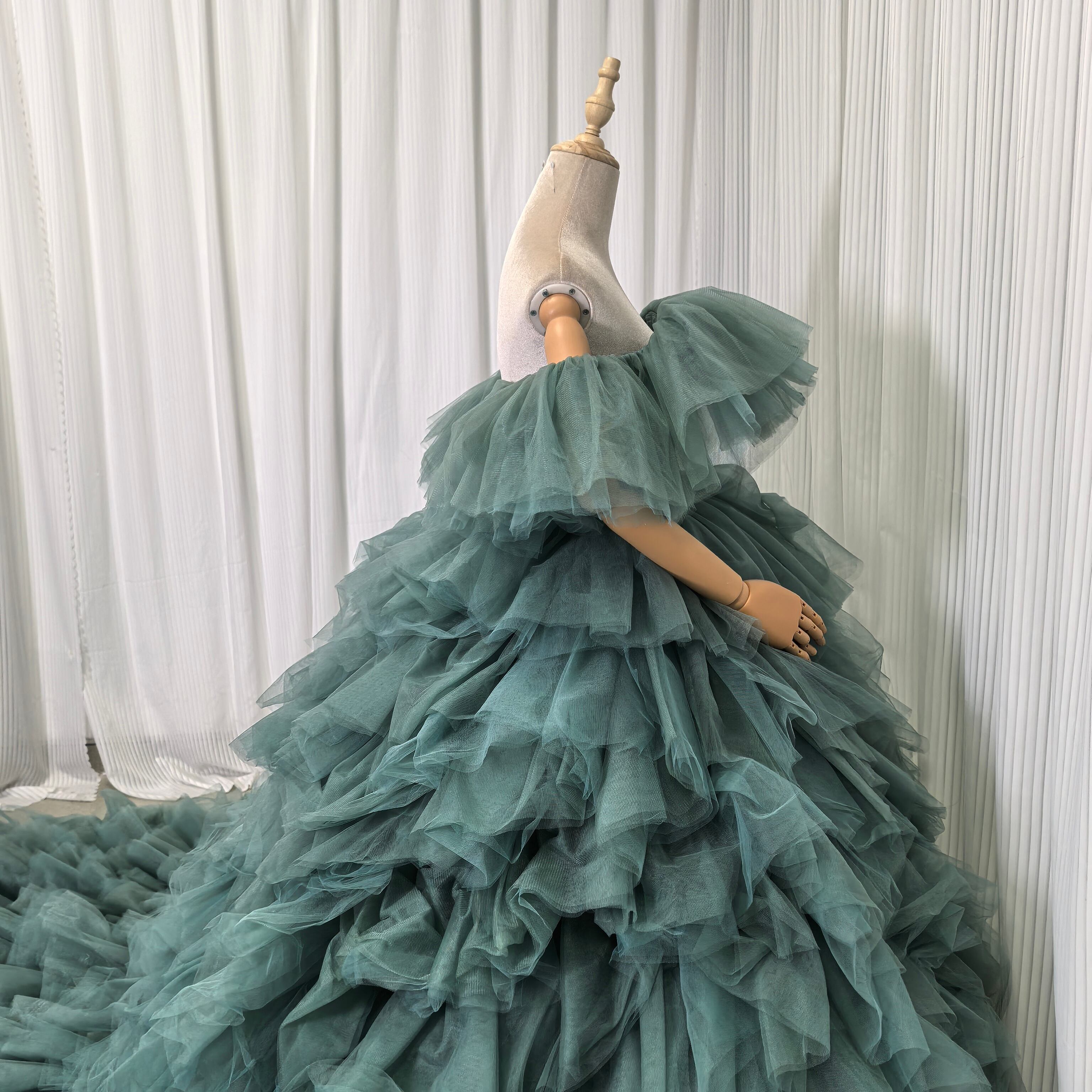 韓国風もこもこグリーン カラードレス パフスリーブ チュールドレス リボン ふわふわ ボリュームドレス 華やかなトレーン