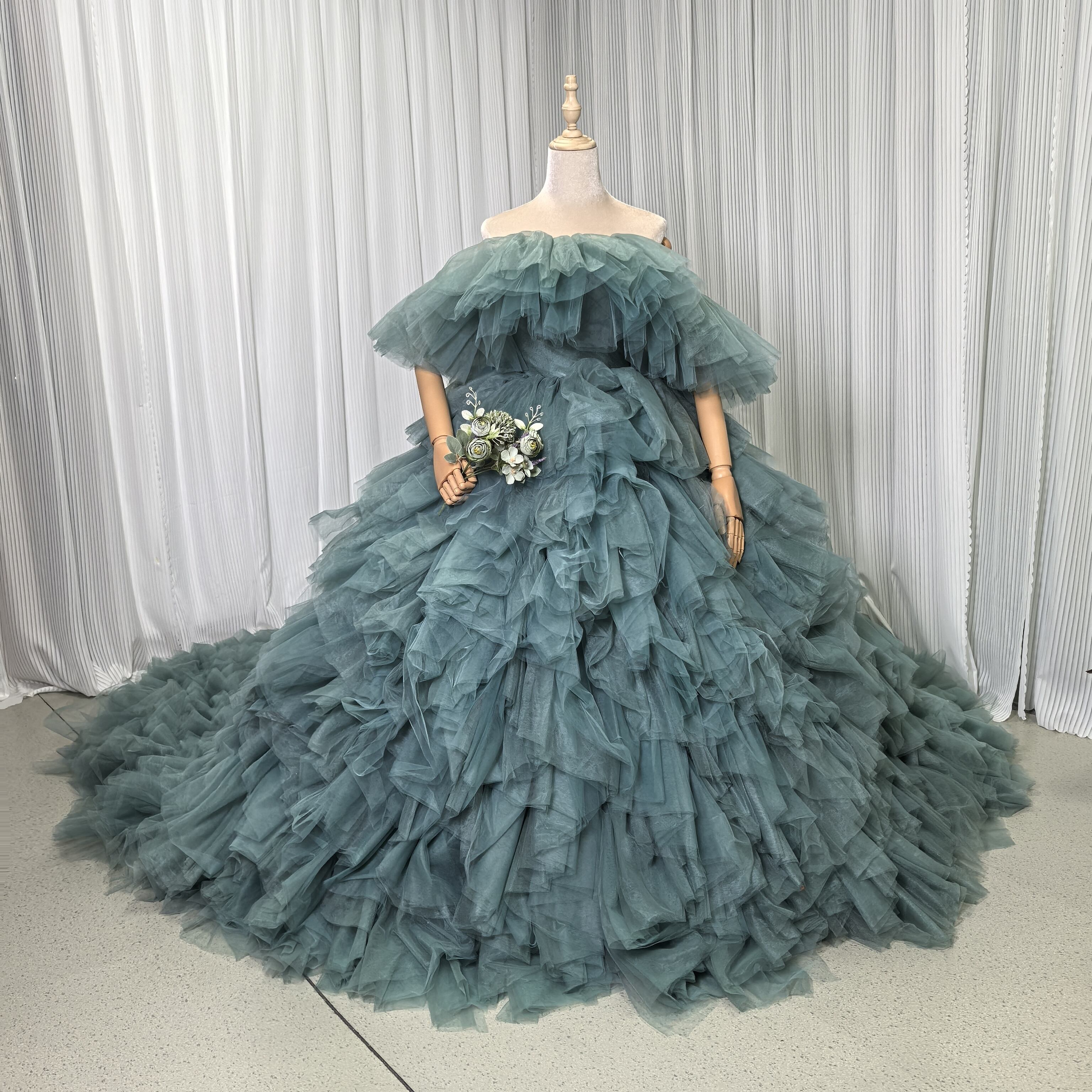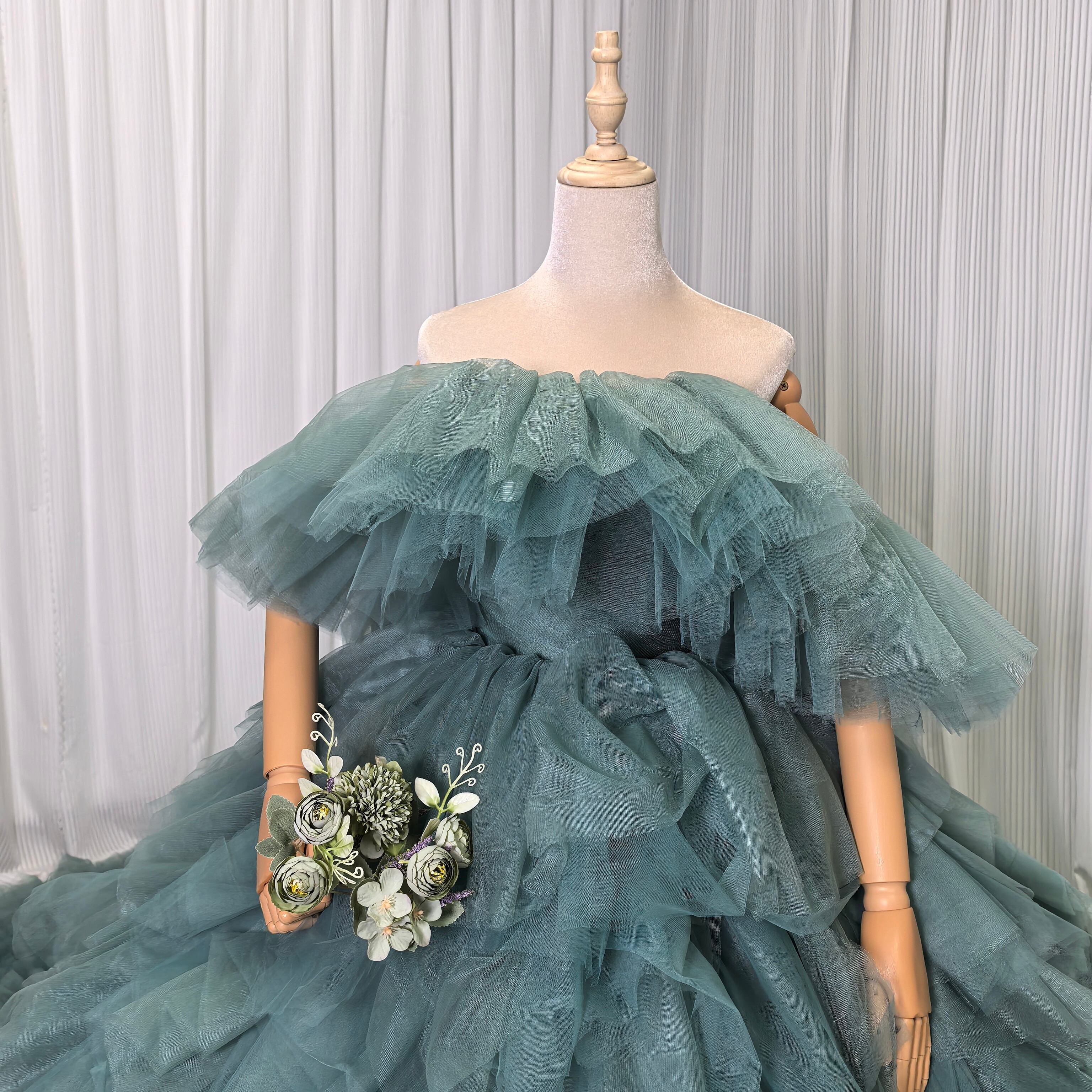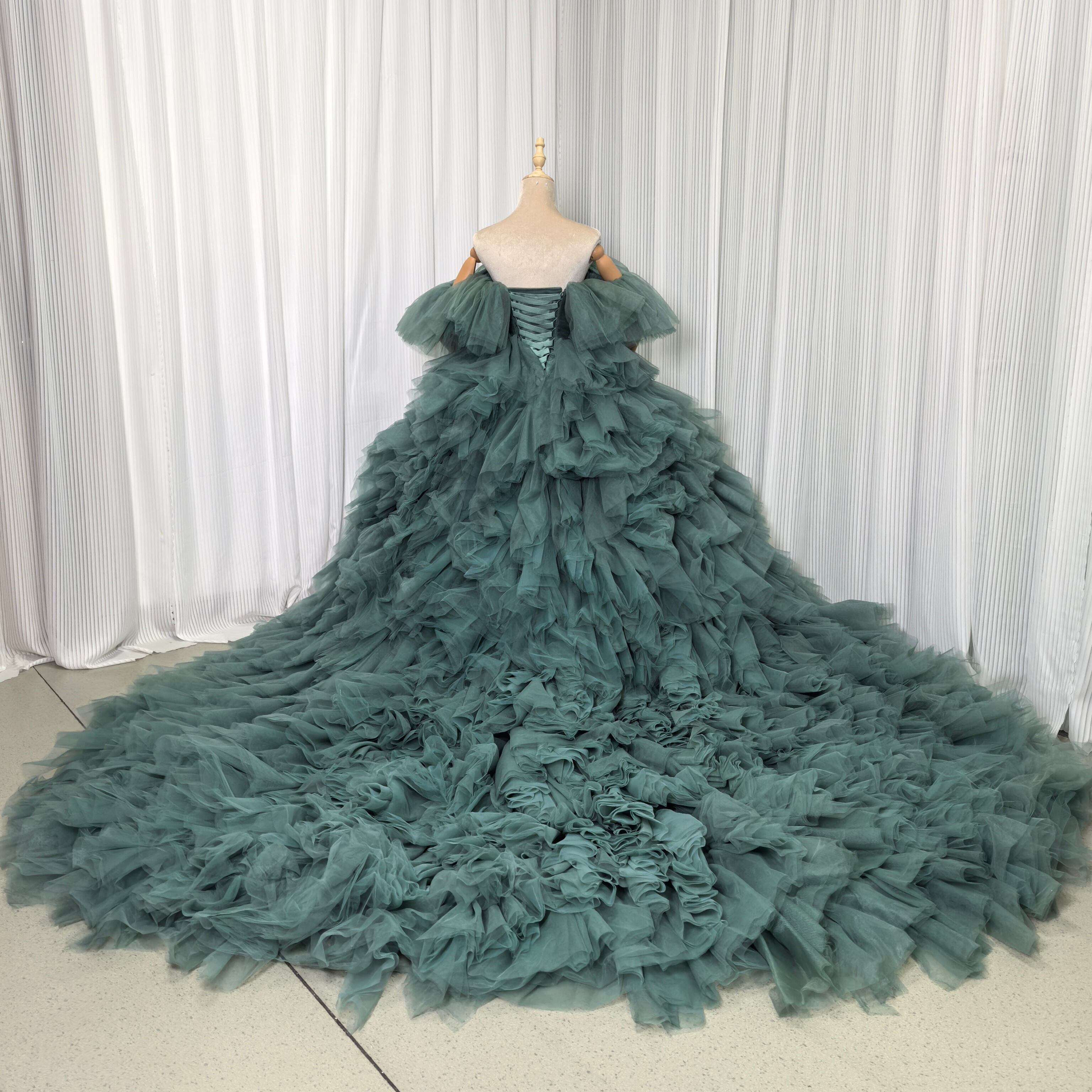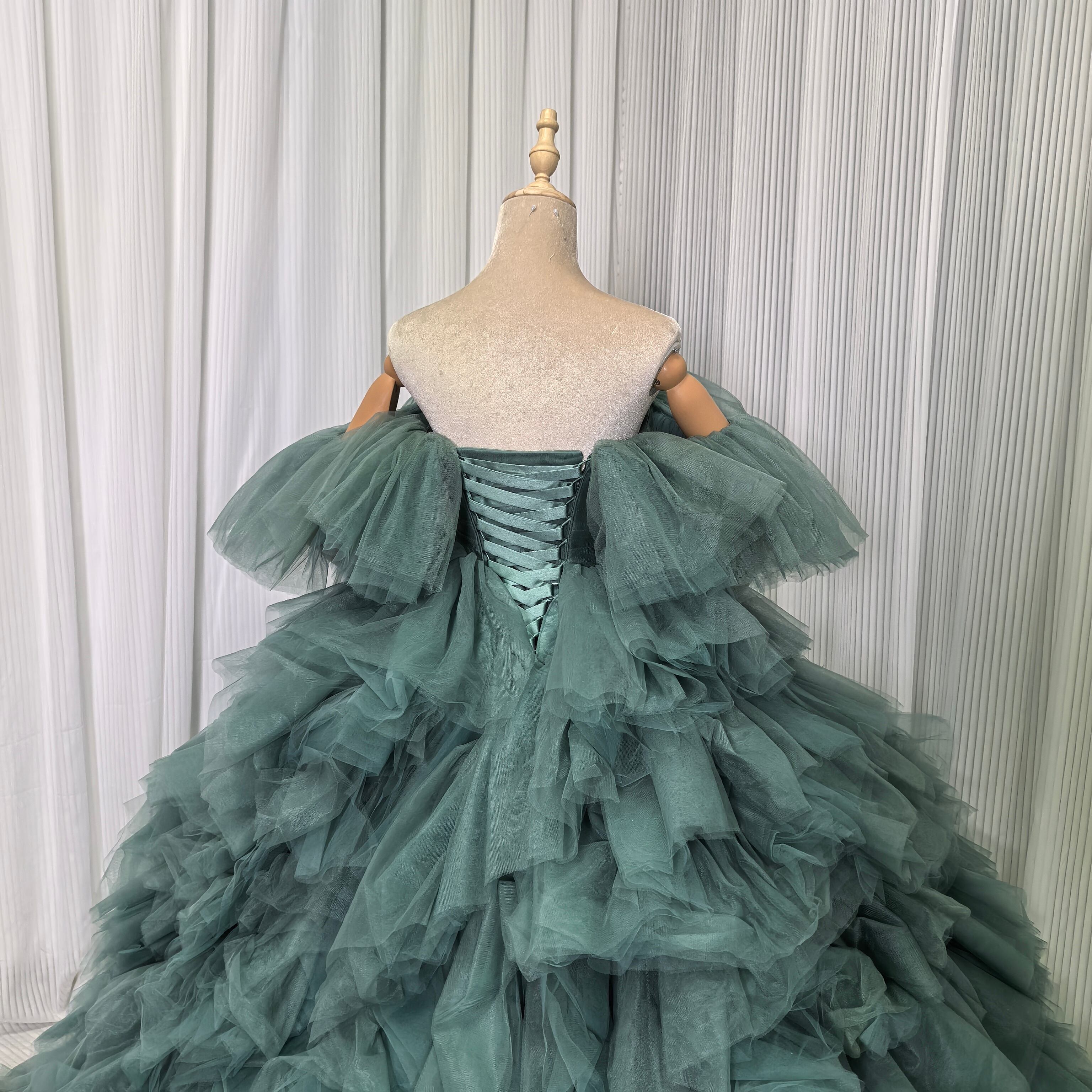韓国風もこもこグリーン カラードレス パフスリーブ チュールドレス リボン ふわふわ ボリュームドレス 華やかなトレーン