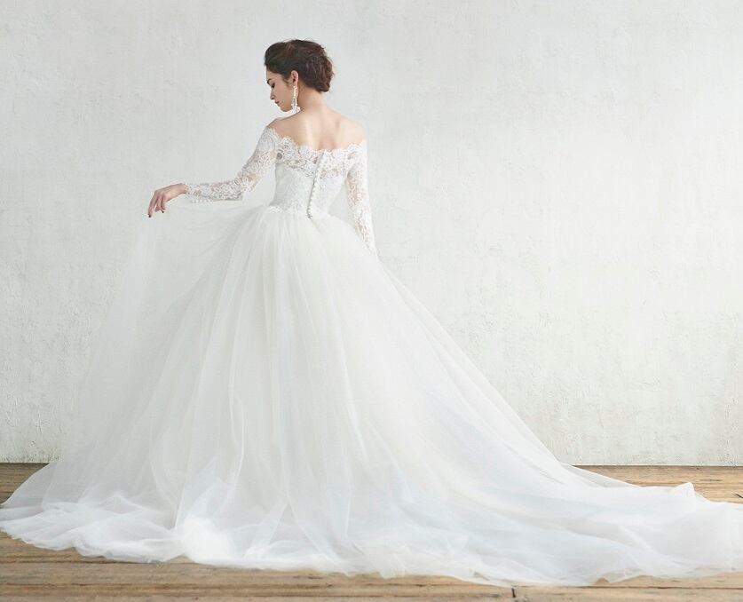 美品!ウエディングドレス 上品レースボレロ オフショルダー ロングスリーブ ふんわりチュールドレス ボリュームドレス フェミニン【オーダーメイド】