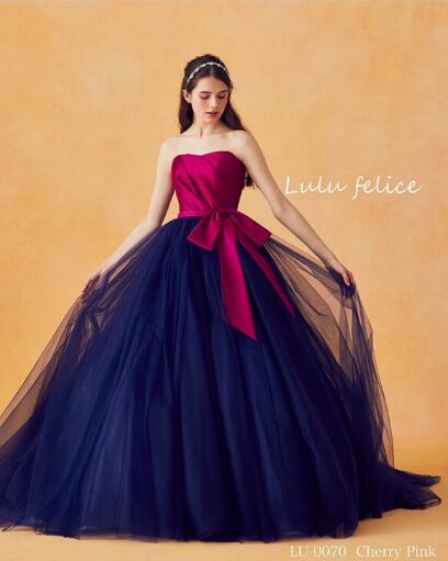 美品!ピンク紫 ネイビーブルー カラードレス ベアトップビスチェ チュールスカート バイカラー イブニングドレス パーティードレス【色変更可能】