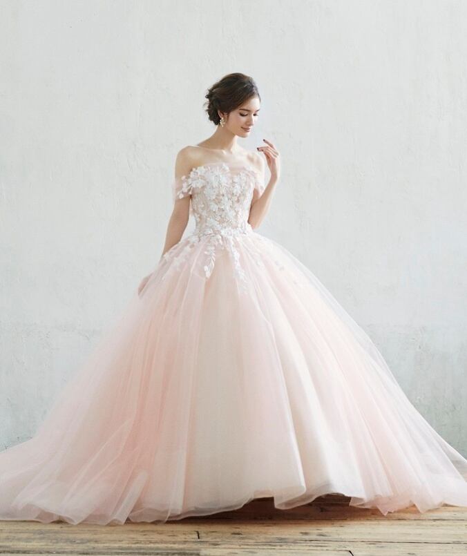 美品!薄ピンク カラードレス オフショルダー チュールスカート ボリューミー レースアップリケ パーティードレス【色変更可能】