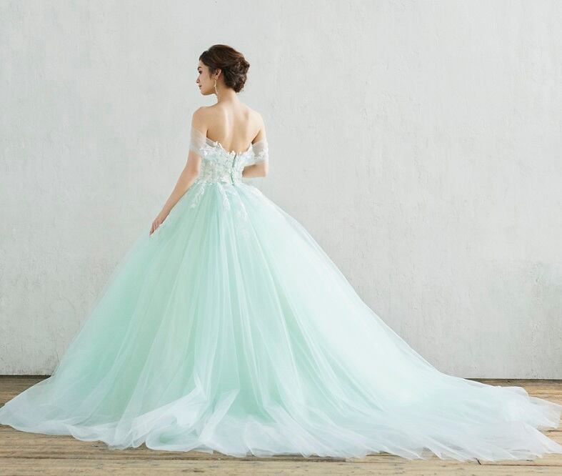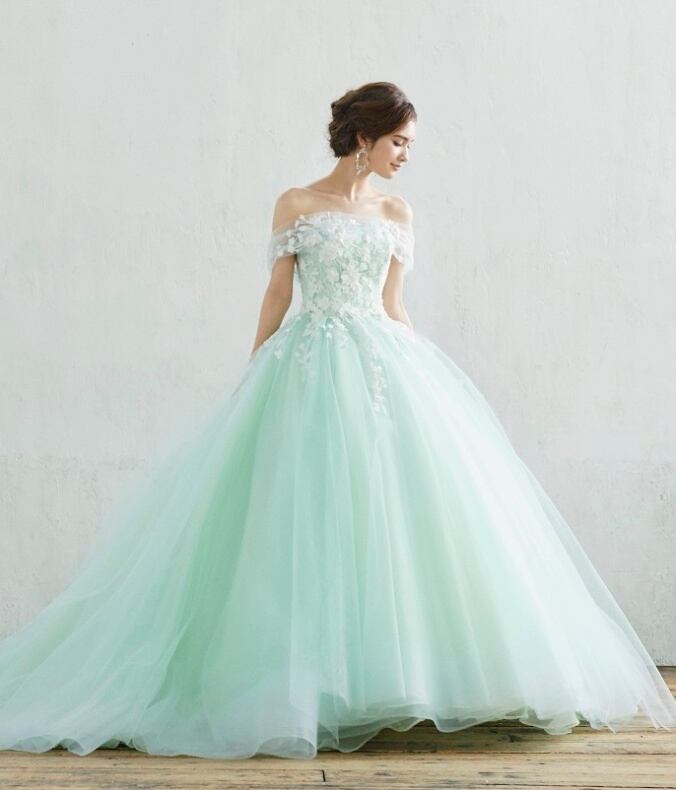 美品!薄グリーン カラードレス オフショルダー チュールスカート ボリューミー レースアップリケ パーティードレス【色変更可能】