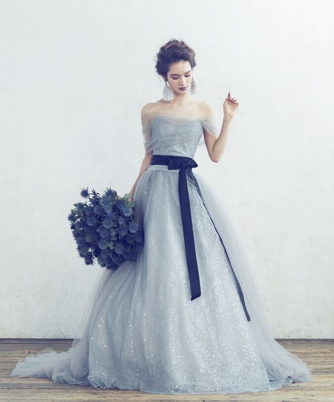 美品!ミスティブルー カラードレス キラキラグリッターチュール 取り外しロールカラー イブニングドレス パーティードレス【色変更可能】