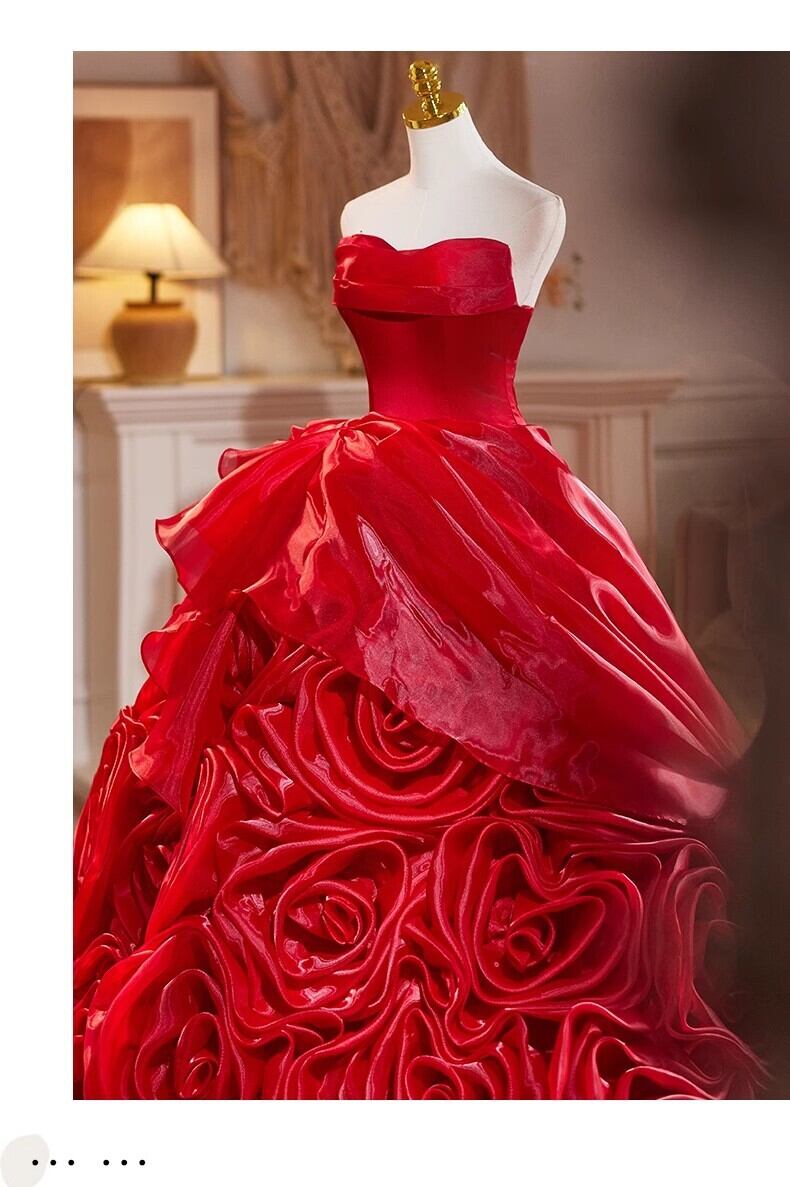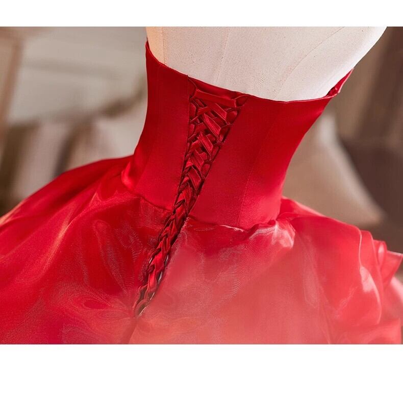 韓国風カラードレス バラ ベアトップ パフスリーブ チュールドレス リボン ふわふわ ボリュームドレス