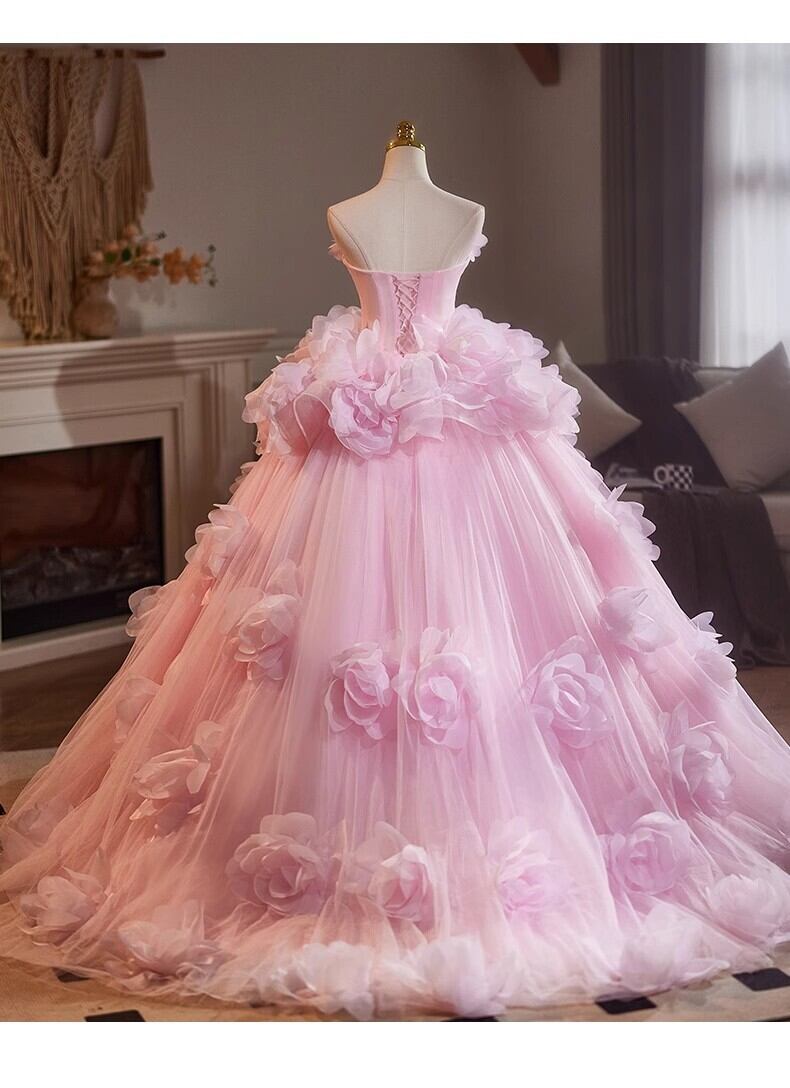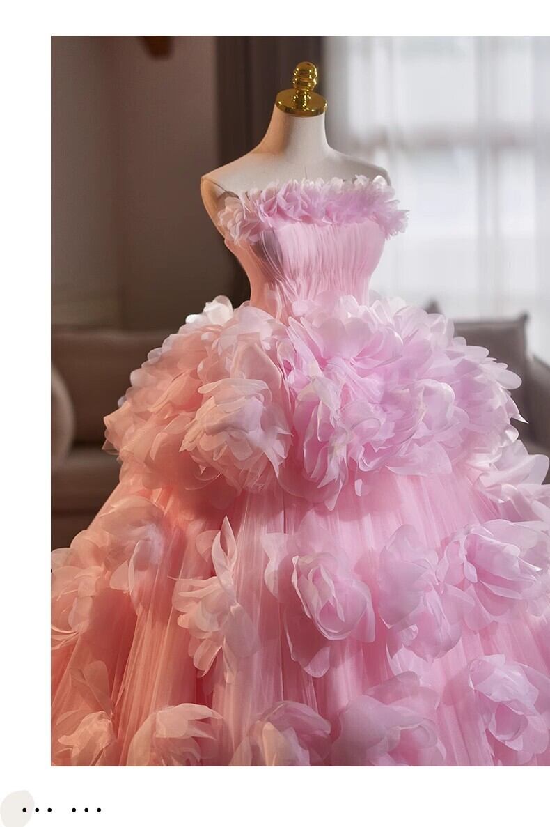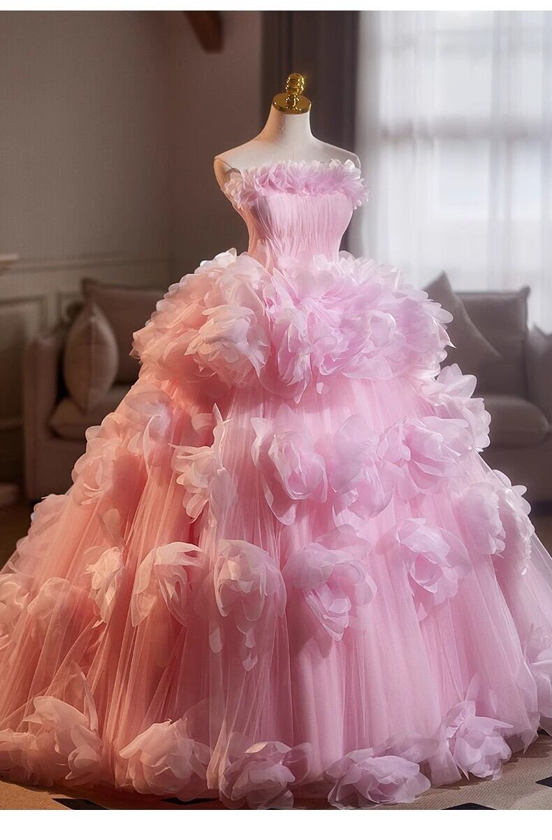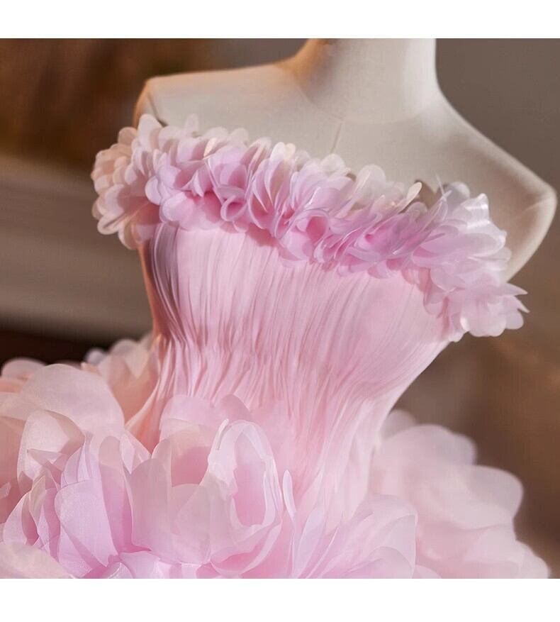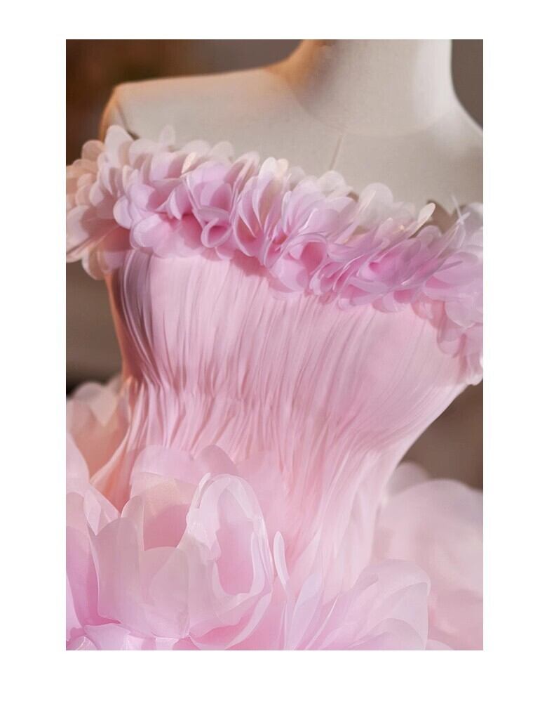 韓国風ピンク カラードレス バラ ベアトップ パフスリーブ チュールドレス リボン ふわふわ ボリュームドレス