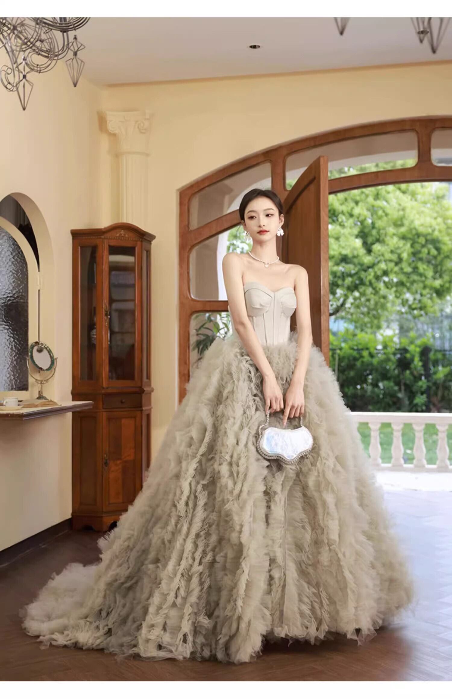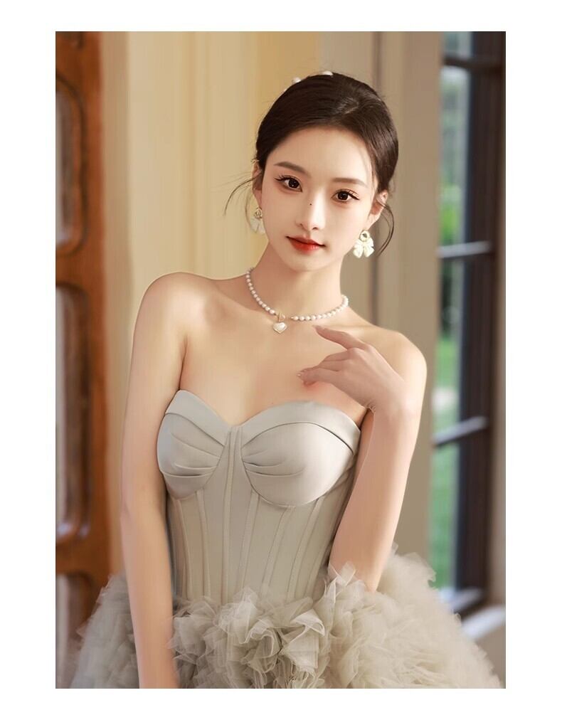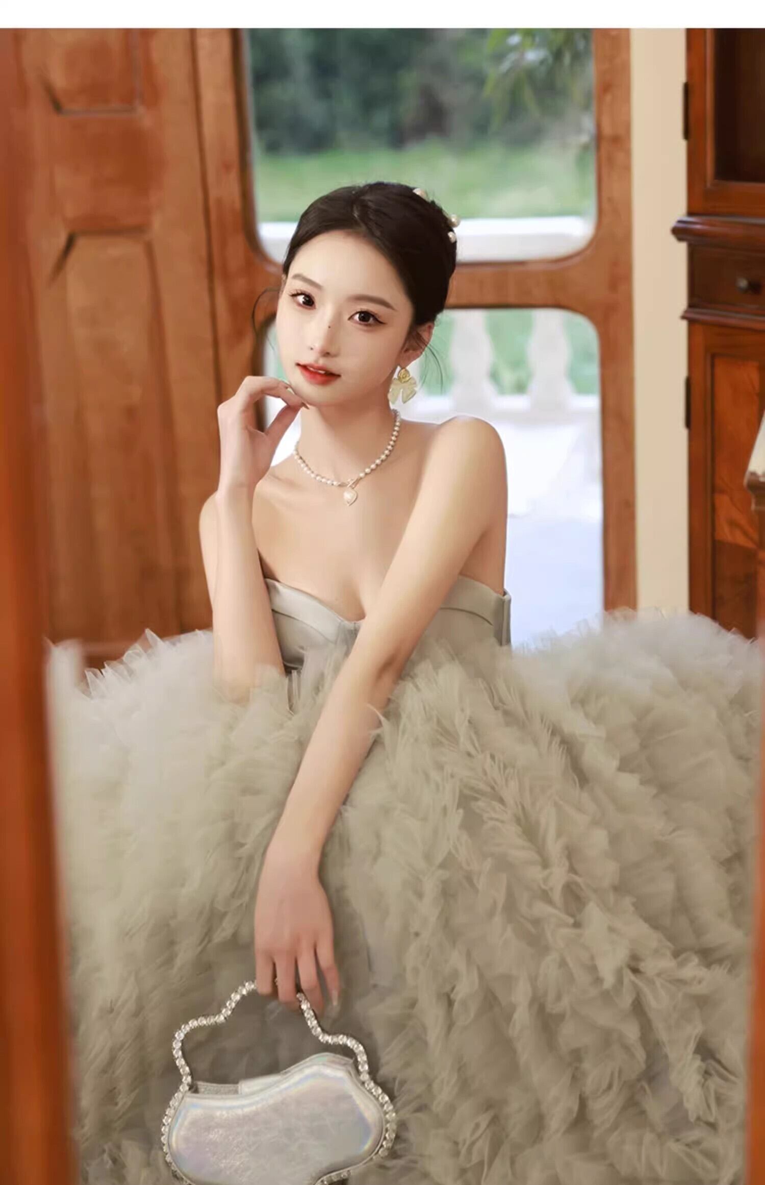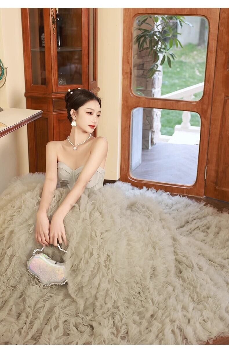 薄 グリーン カラードレス バラ ベアトップ パフスリーブ チュールドレス リボン ふわふわ ボリュームドレス