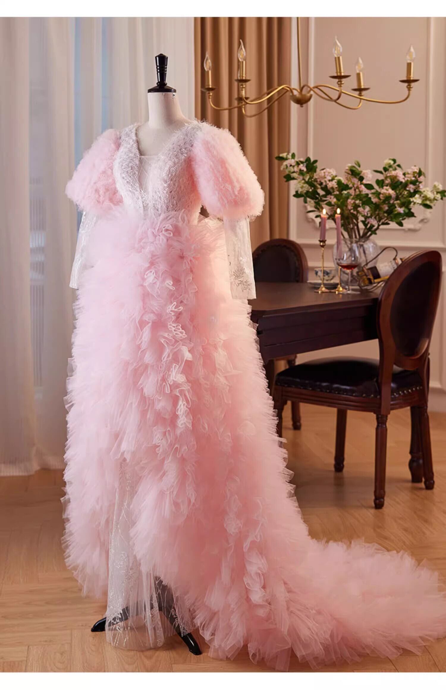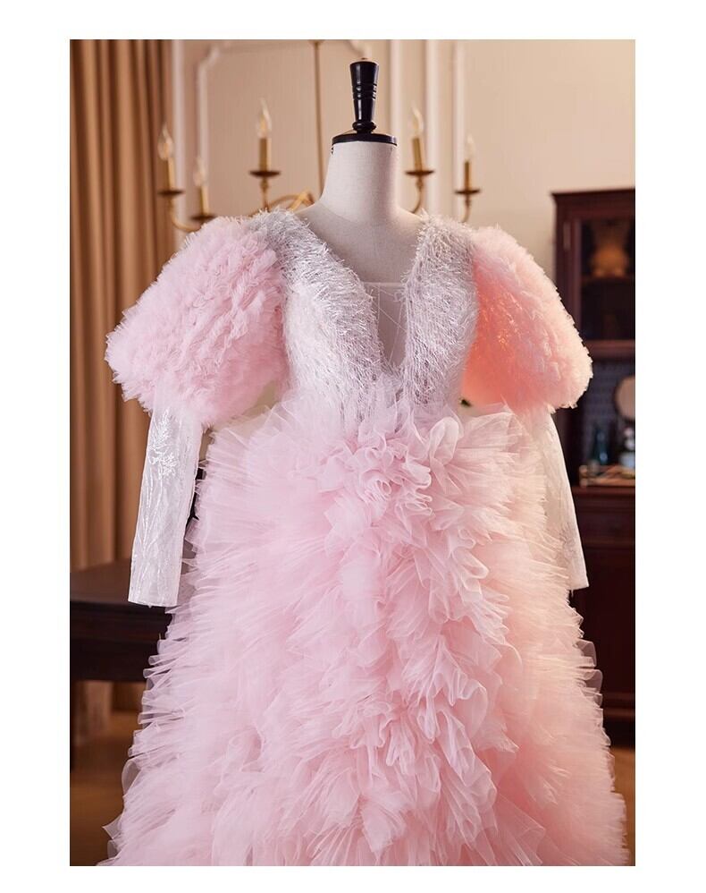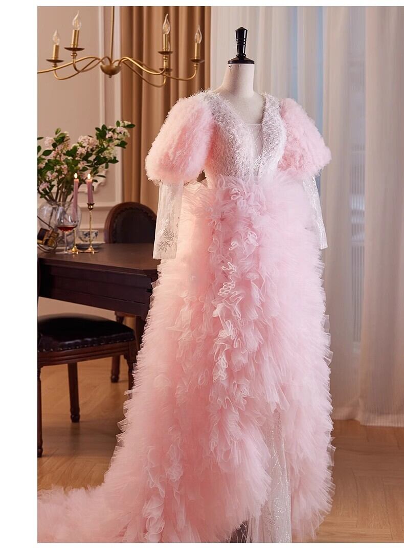 韓国風ピンク カラードレス バラ ベアトップ パフスリーブ チュールドレス リボン ふわふわ ボリュームドレスショートインロングドレス