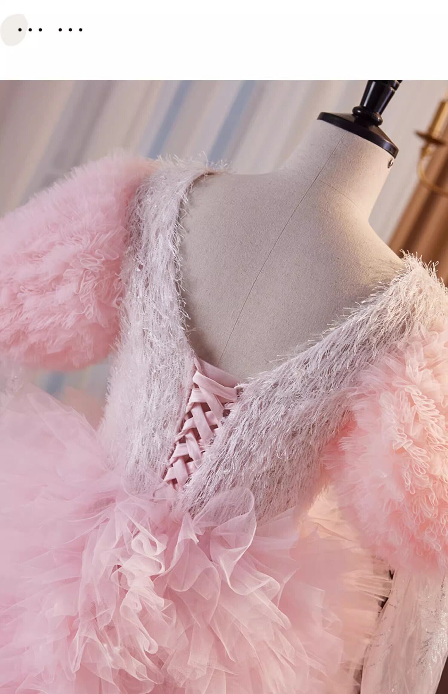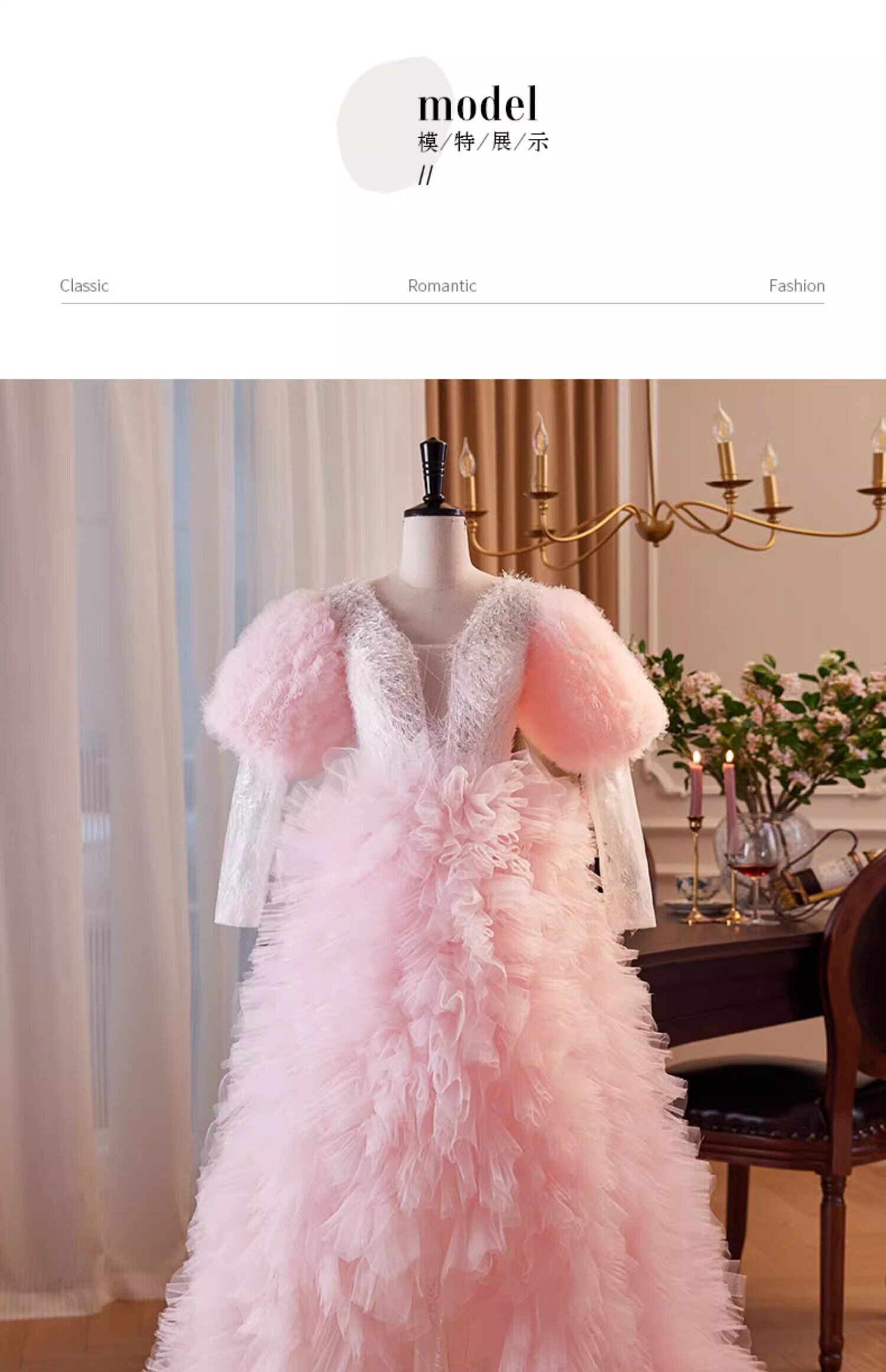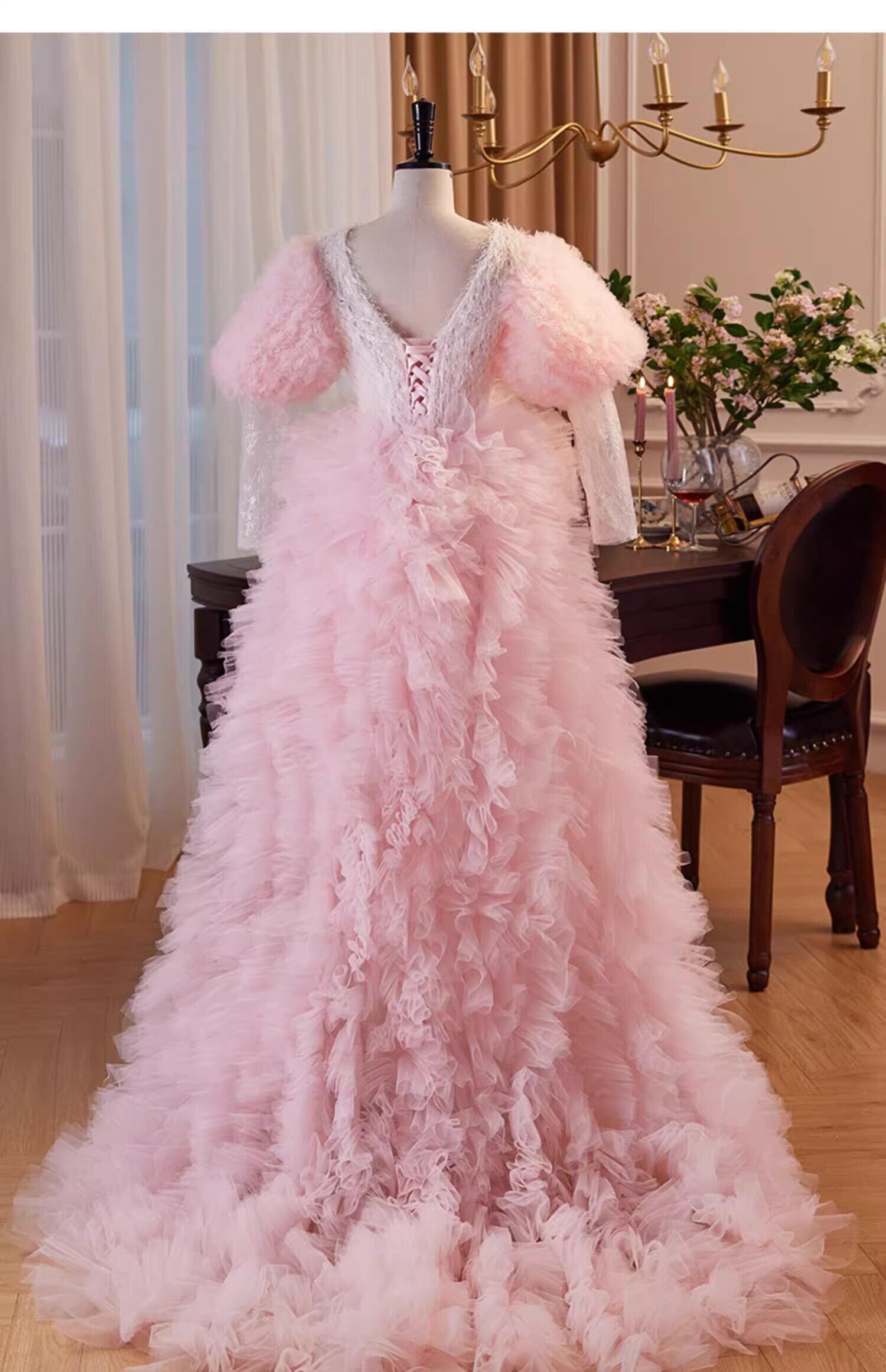 韓国風ピンク カラードレス バラ ベアトップ パフスリーブ チュールドレス リボン ふわふわ ボリュームドレスショートインロングドレス
