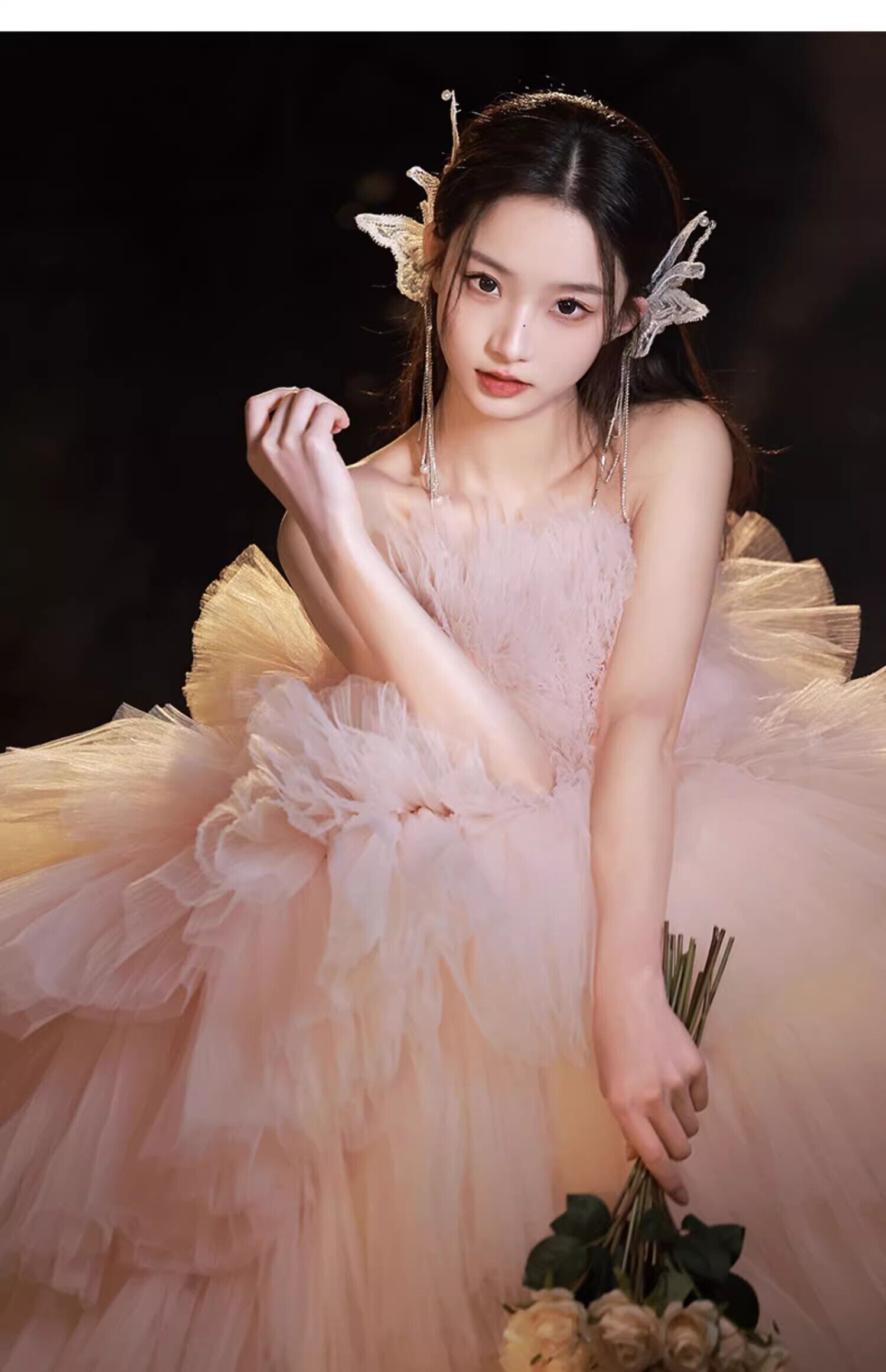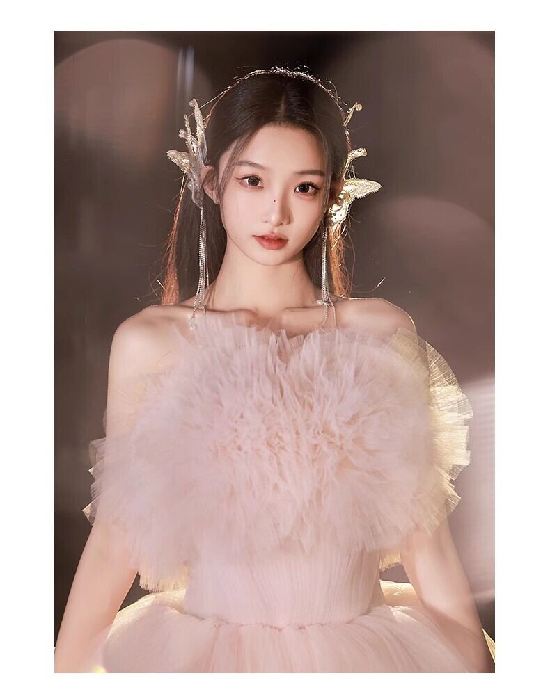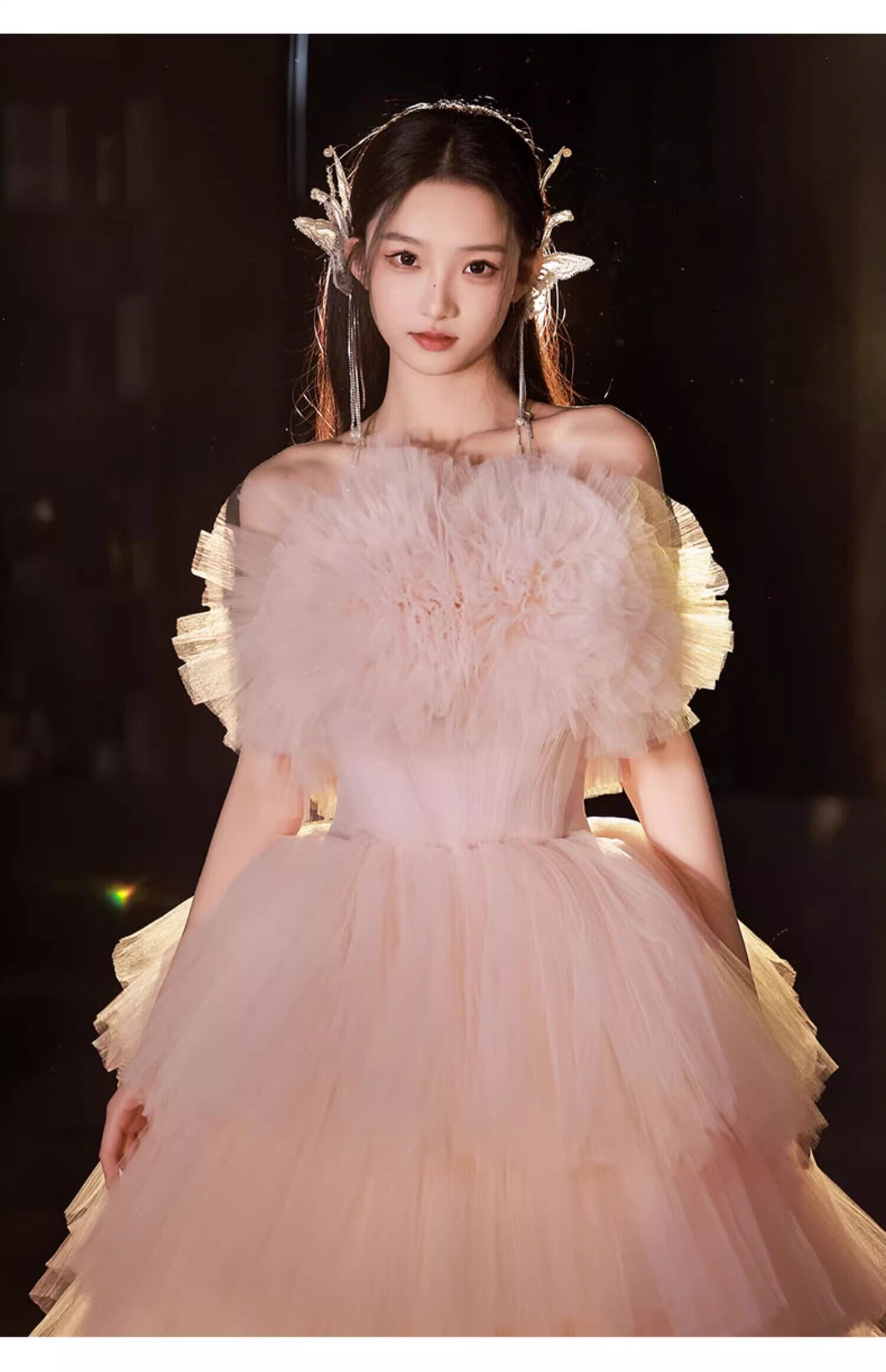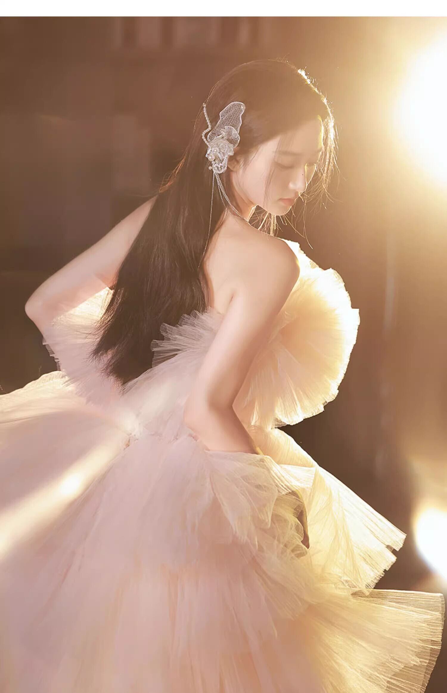 カラードレス バラ ベアトップ パフスリーブ チュールドレス リボン ふわふわ ボリュームドレス
