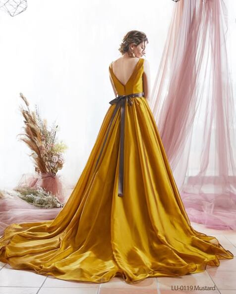 美品!ゴールド カラードレス ノースリーブ 高みせ 光沢サテン 細見えシルエット イブニングドレス パーティードレス【色変更可能】