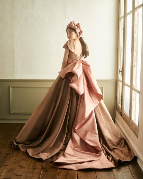 美品!ピンク ブラウン カラードレス Aラインドレス バックリボン バイカラー 付け袖 イブニングドレス パーティードレス【色変更可能】