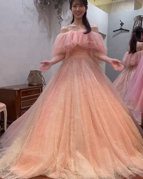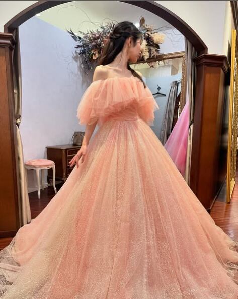 美品!薄ピンク カラードレス オフショルダー キラキララメチュール イブニングドレス パーティードレス【色変更可能】