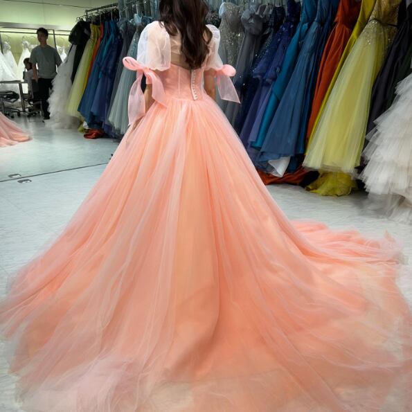美品!コーラルピンク/コーラルオレンジ カラードレス チュールトップス パフスリーブ イブニングドレス パーティードレス【色変更可能】