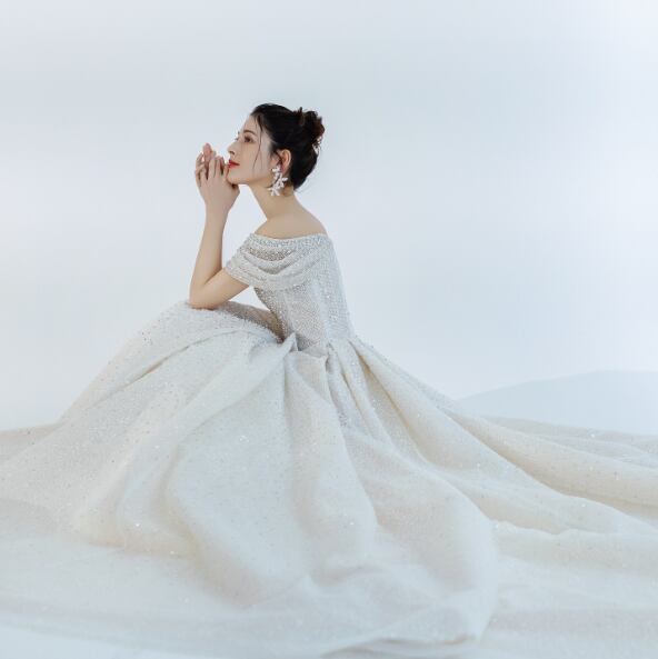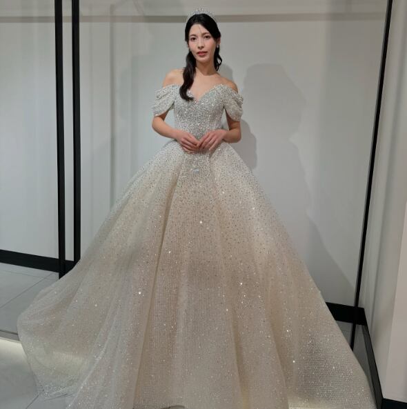美品!韓国風ドレス ビジュードレス オフショルダー ウエディングドレス Aラインドレス イブニングドレス パーティードレス【オーダーメイド】