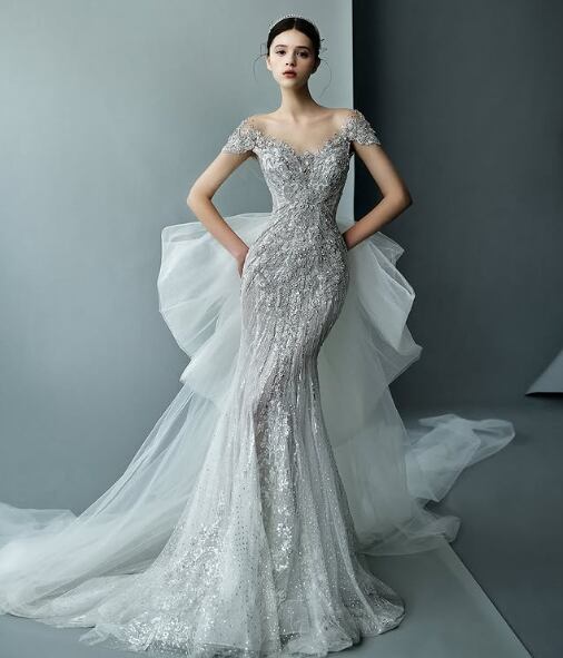 高品質!韓国風ドレス ビジュードレス 半袖 ウエディングドレス バックリボントレーン マーメイドドレス パーティードレス【オーダーメイド】