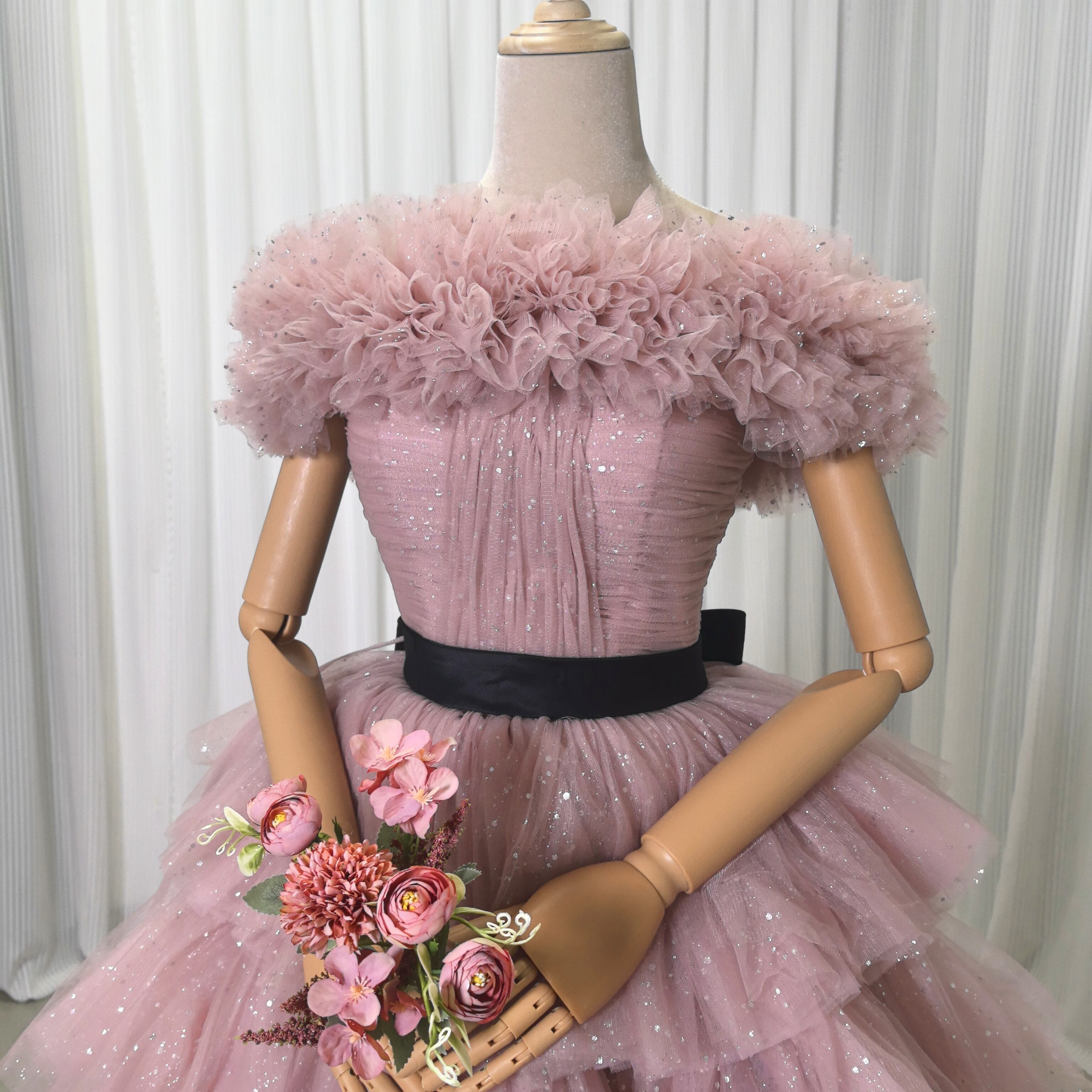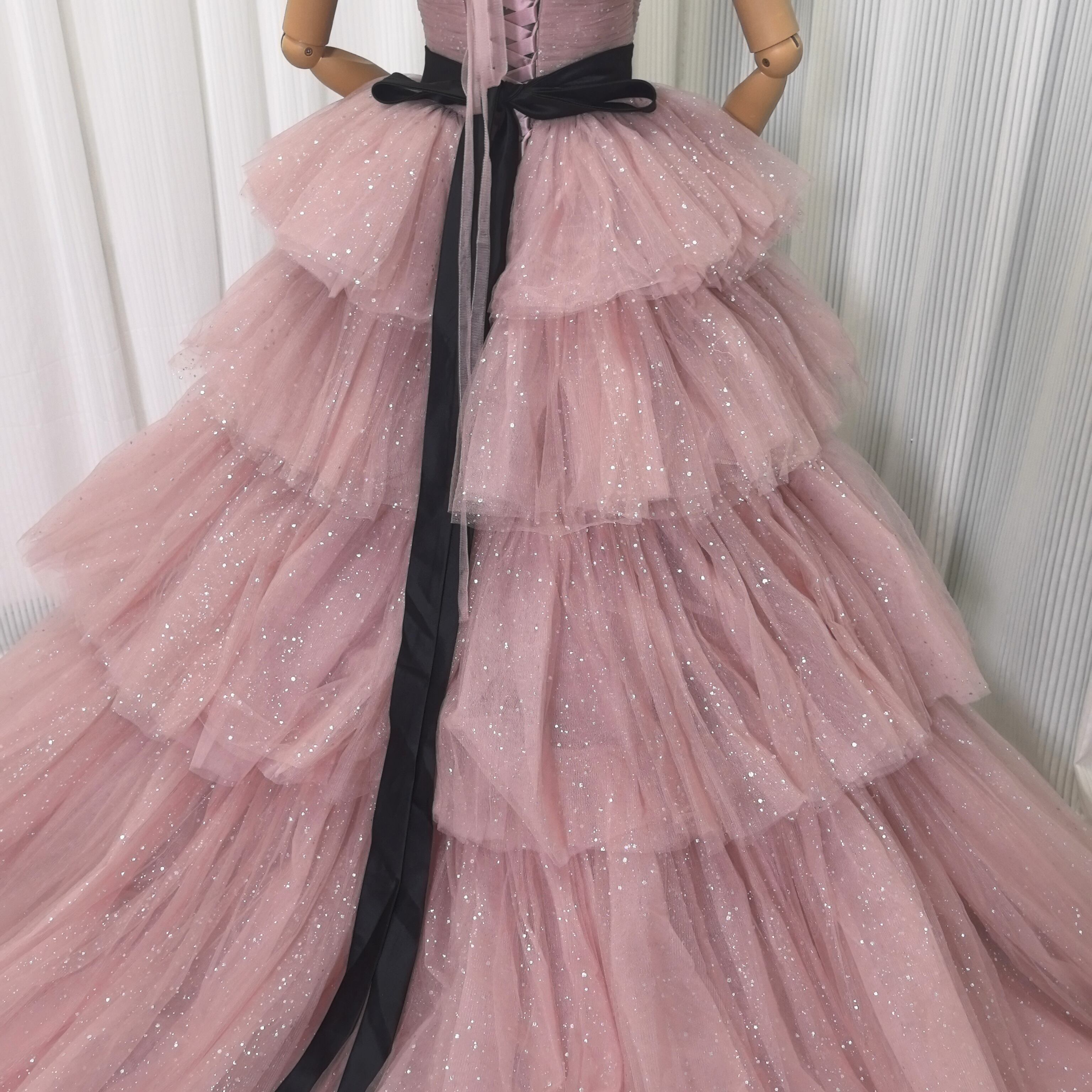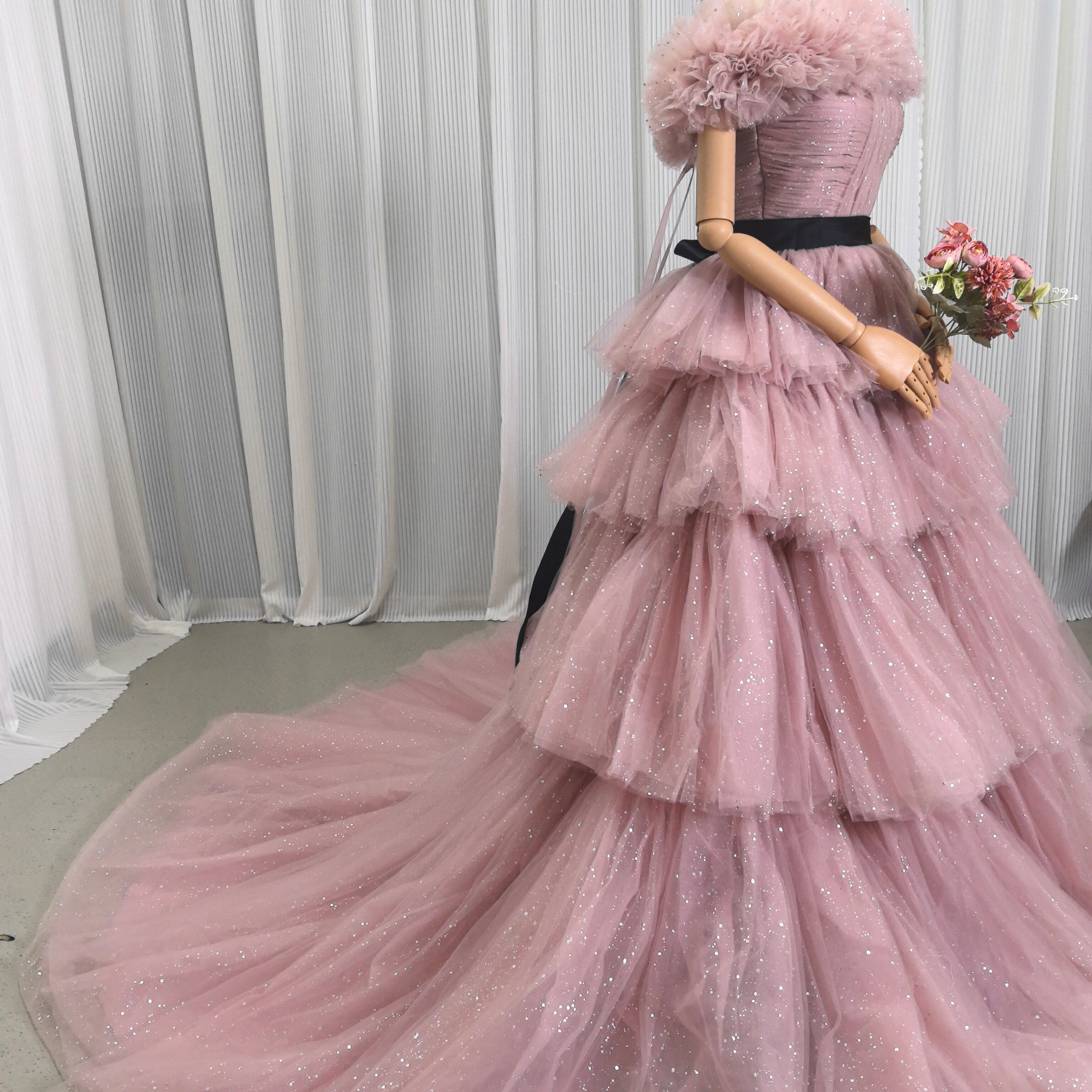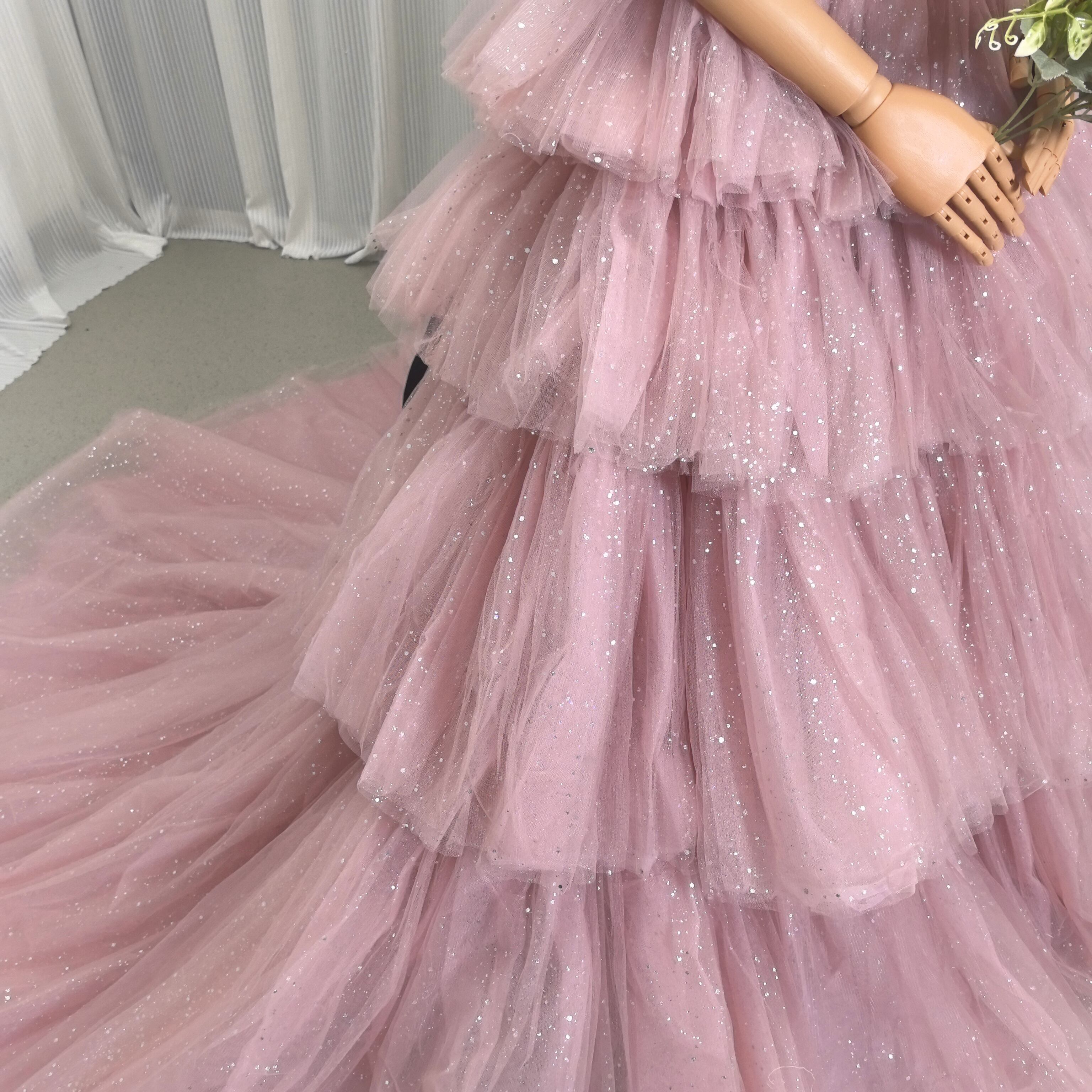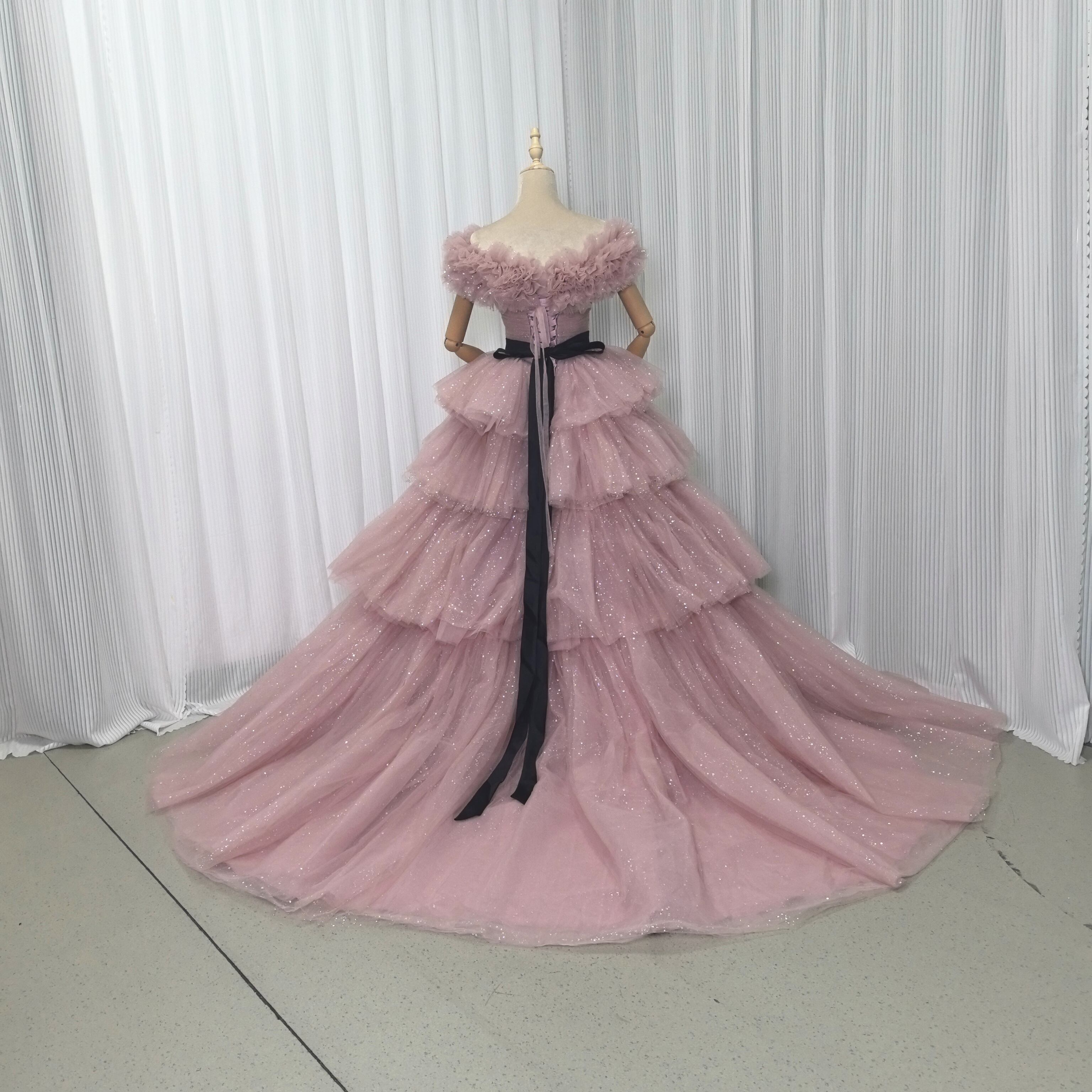 ピンク カラードレス ソフトチュール ロングトレーン 取り外しオフショルダー柔らかく重ねたチュールスカート 結婚式