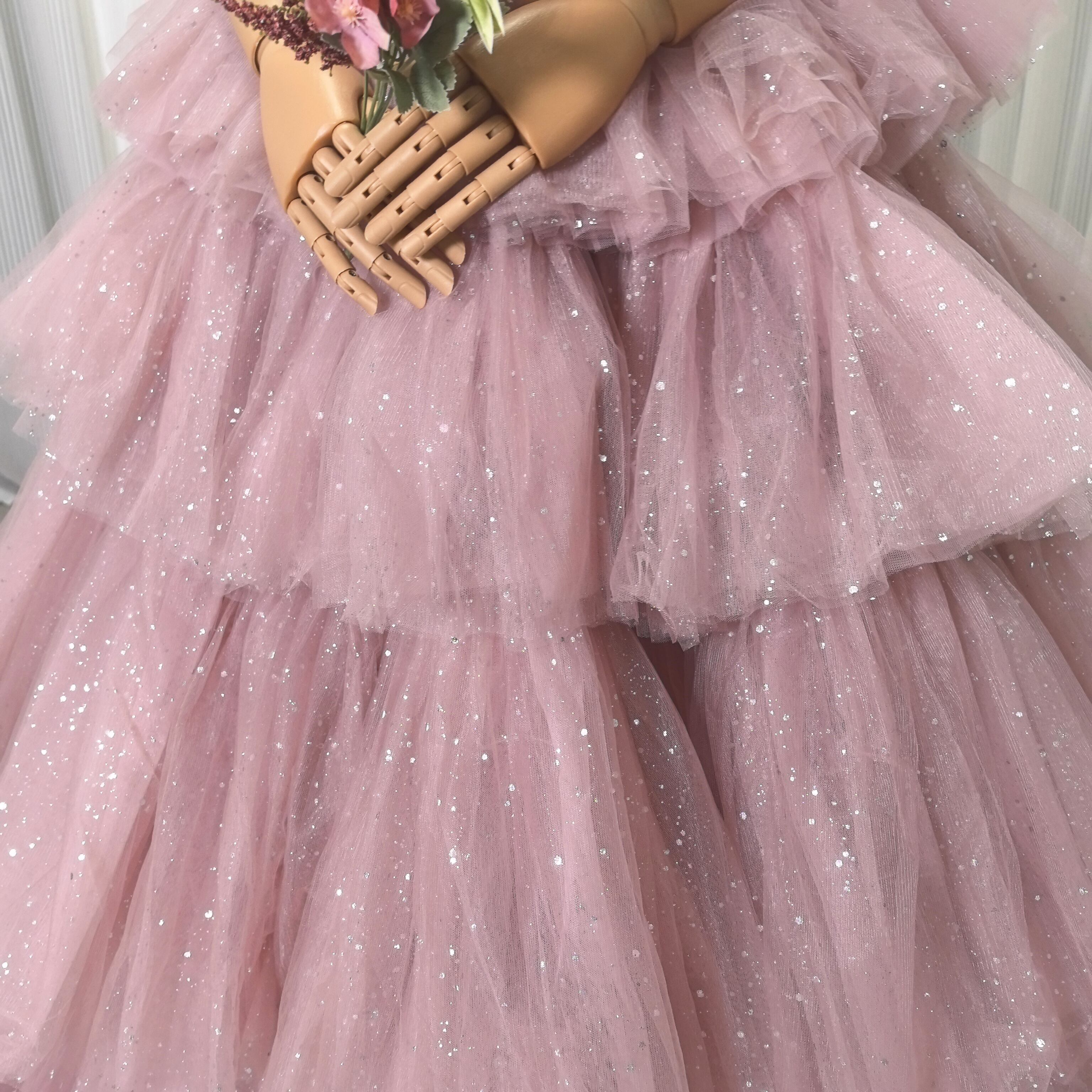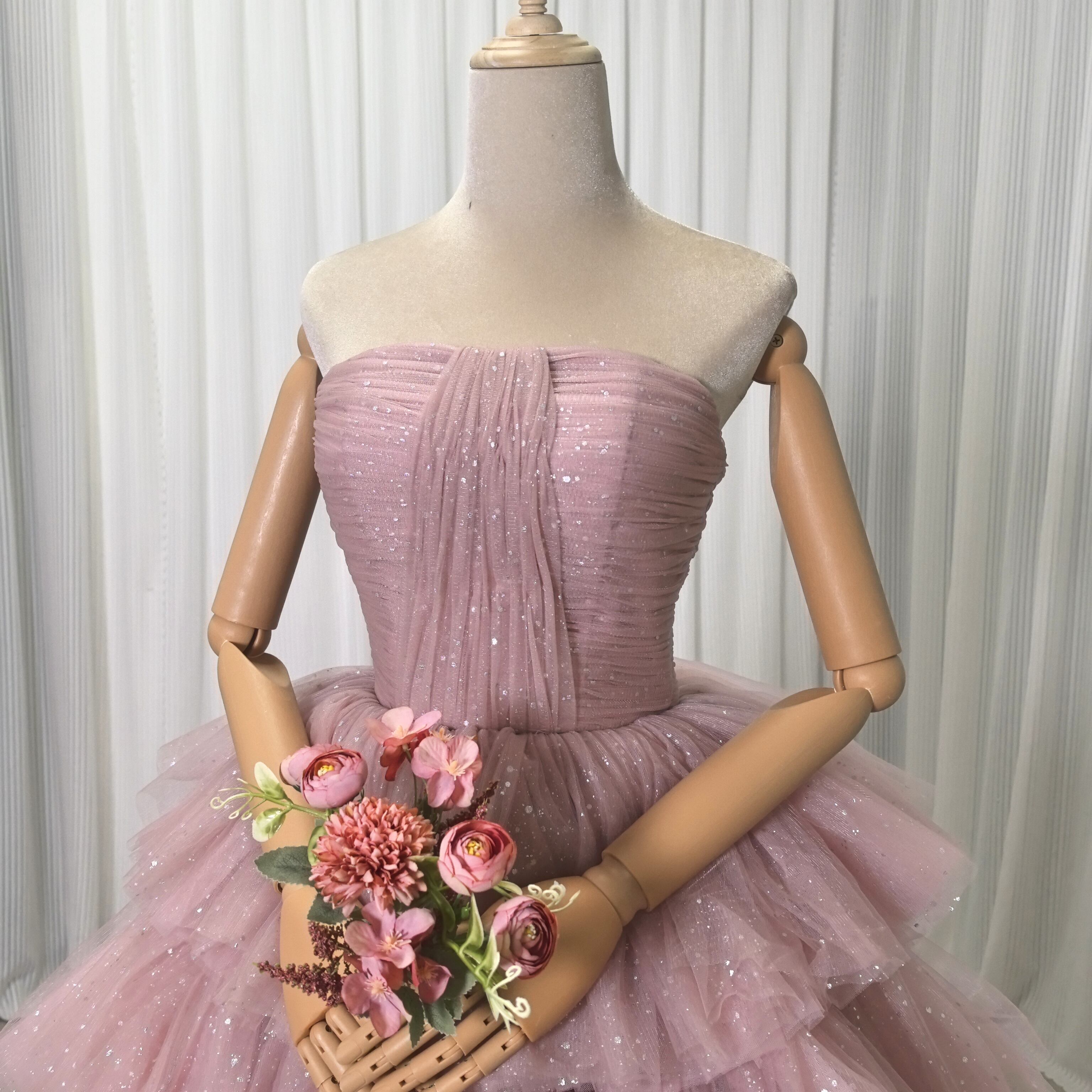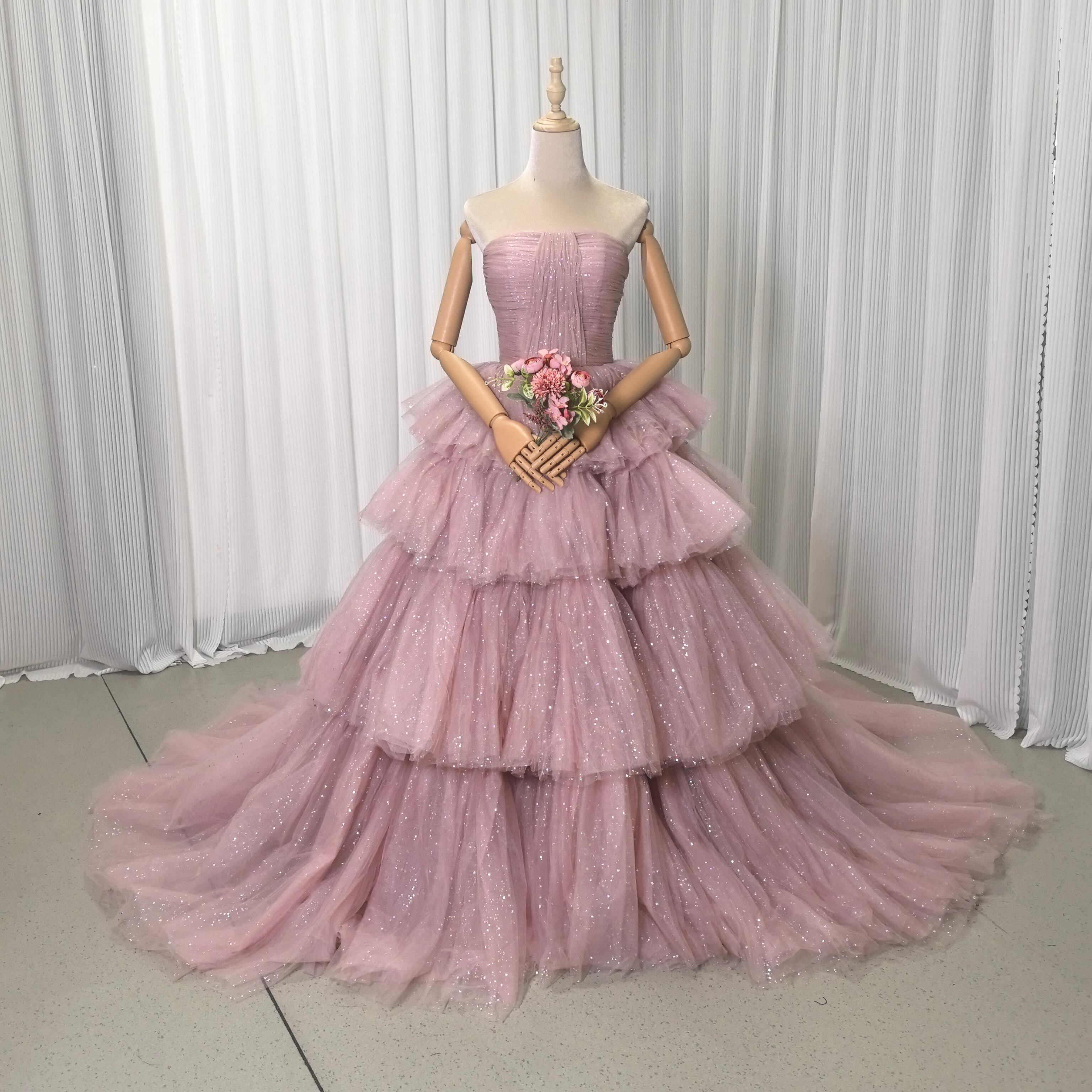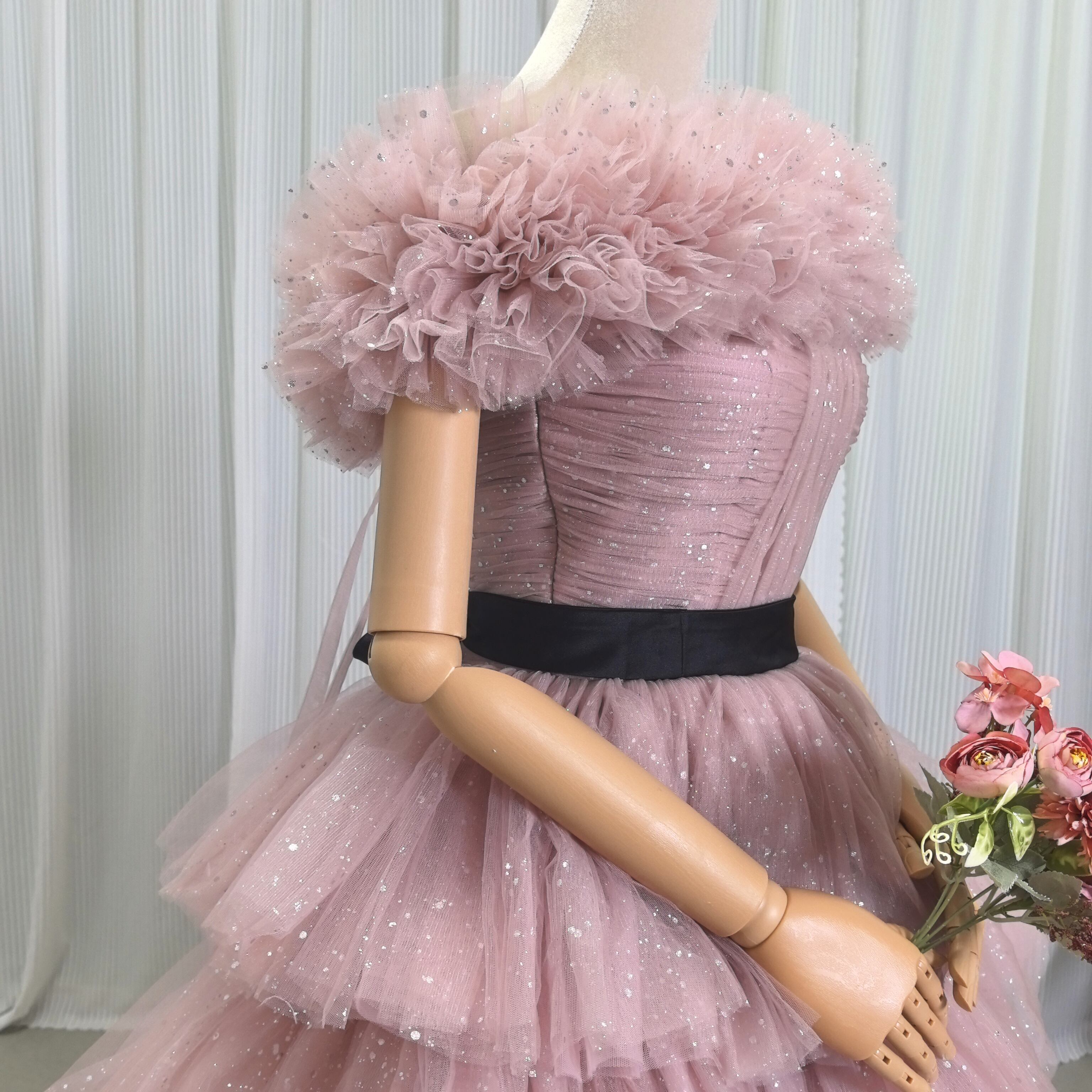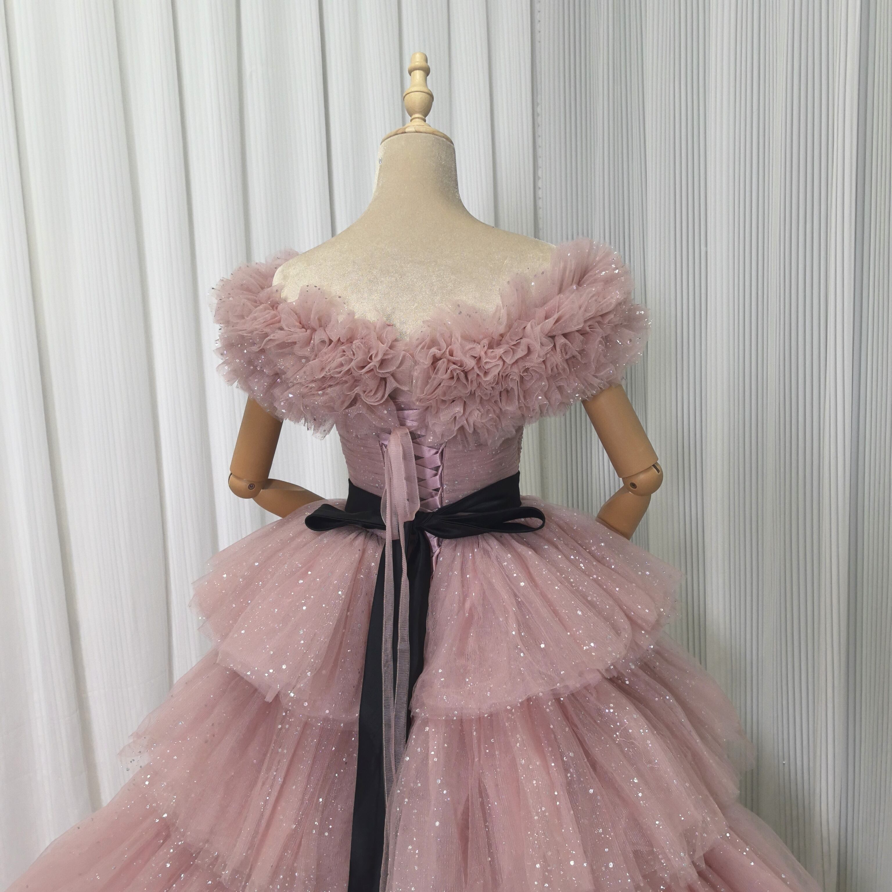 ピンク カラードレス ソフトチュール ロングトレーン 取り外しオフショルダー柔らかく重ねたチュールスカート 結婚式
