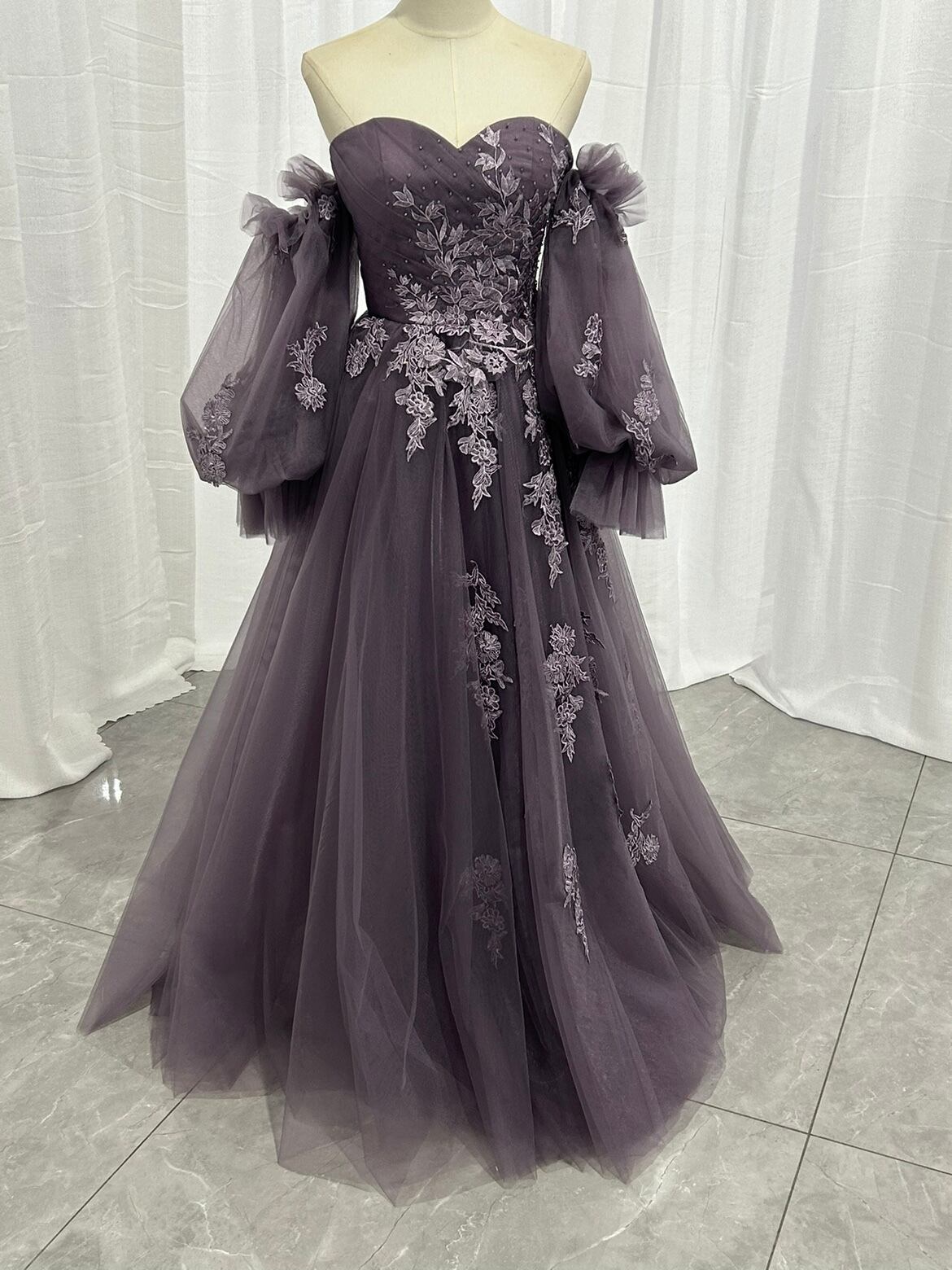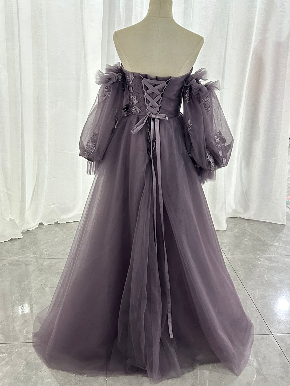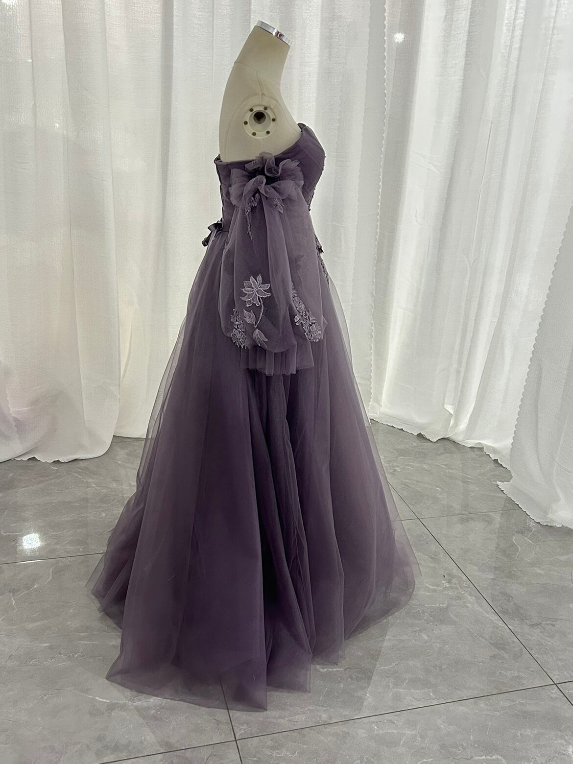 送料無料!紫 カラードレス 3D立体レース刺繍 ソフトチュール パーティードレス 花嫁/前撮り/演奏会/音楽