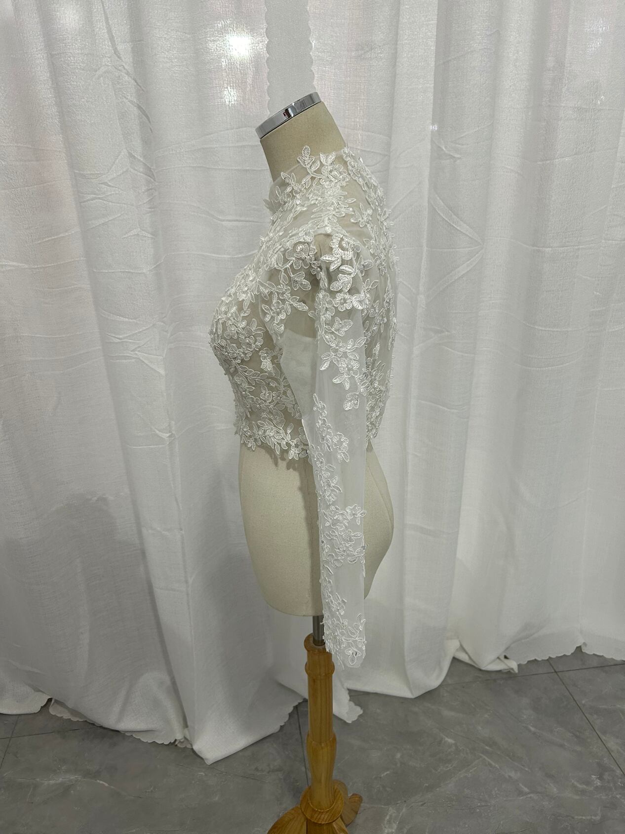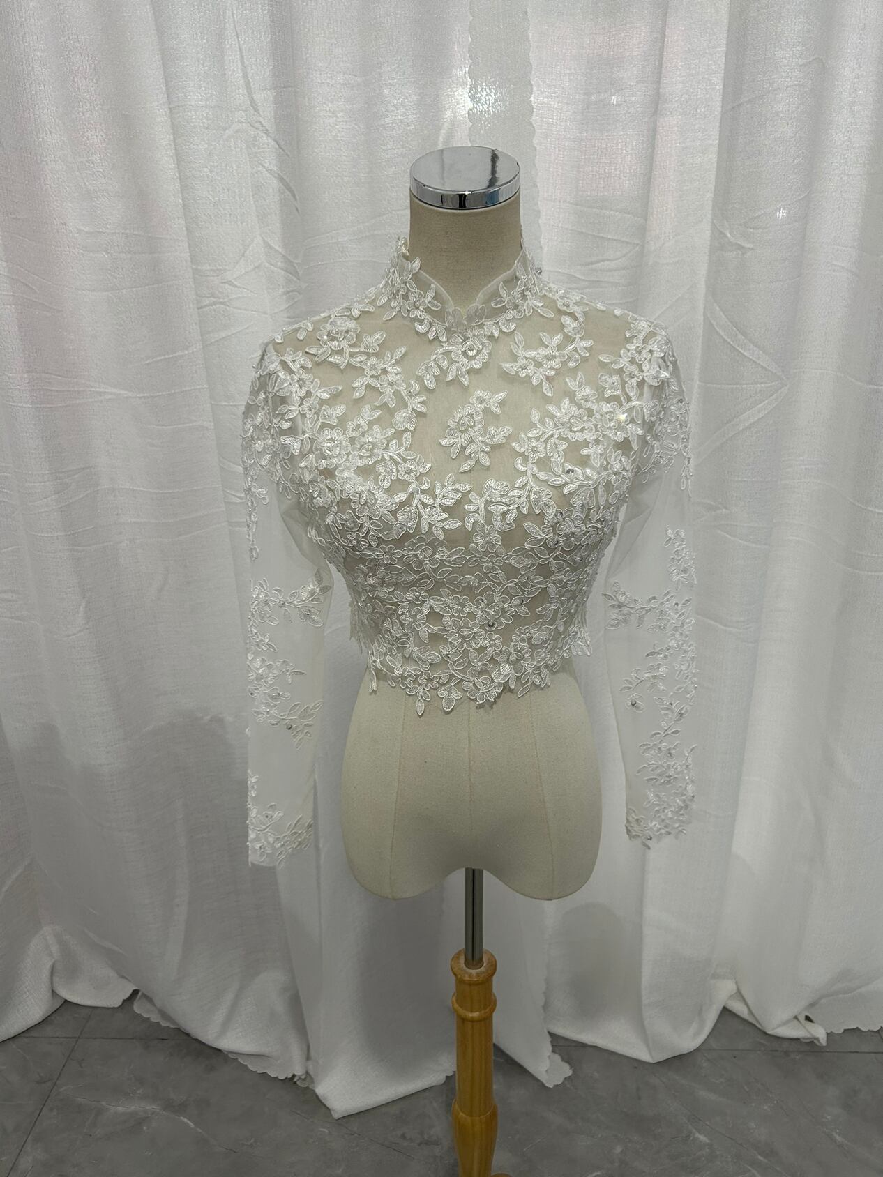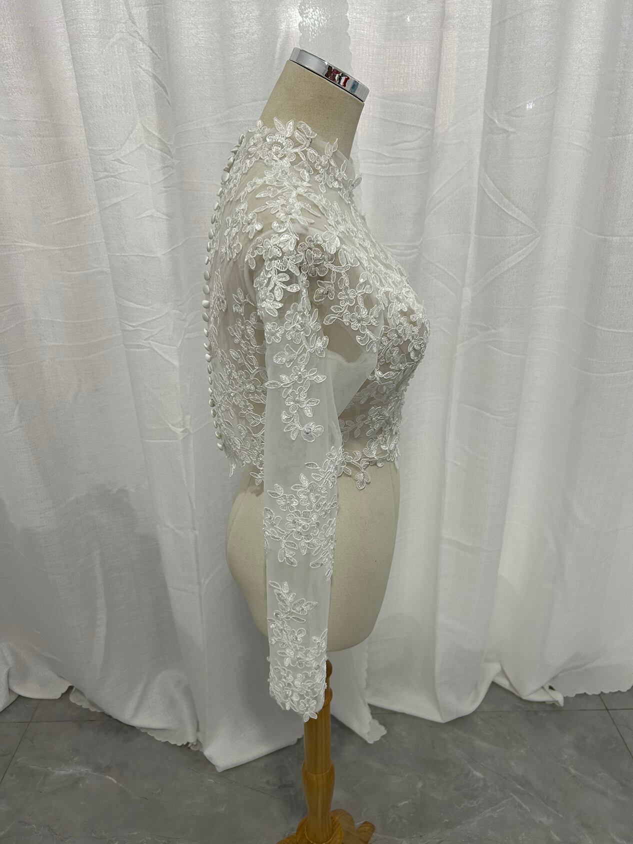 Vハイネックボレロ トップス  ブラウス 上品透け袖 3D立体レース刺繍 くるみボタン 長袖