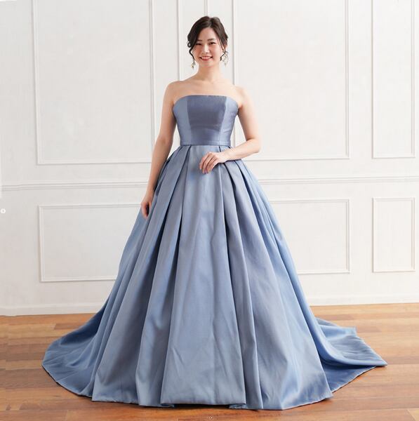 高品質!ライトブルー 薄いブルー カラードレス パフスリーブ サテンドレス Aラインドレス パーティードレス【色変更可能】