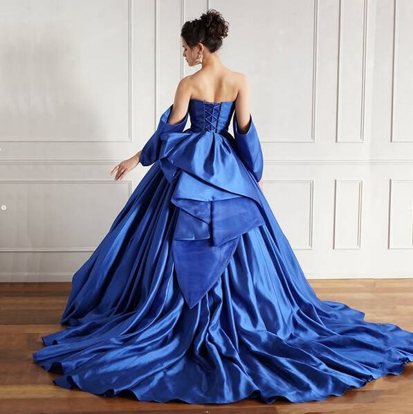 高品質!ロイヤルブルー カラードレス 付け袖 バックリボン サテンドレス Aラインドレス イブニングドレス パーティードレス【色変更可能】
