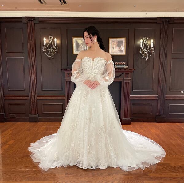高品質!ハートカット ウエディングドレス 付け袖 総レースドレス 花モチーフ刺繡 Aラインドレス 高みせ パーティードレス【オーダーメイド】