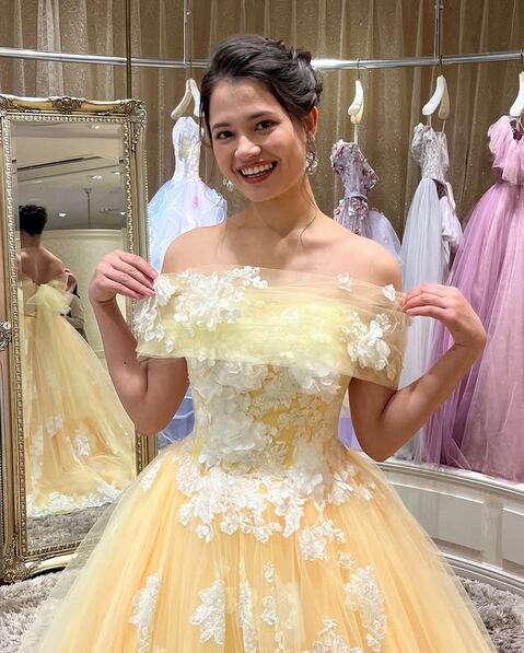 高品質!繊細レース ロールカラー パステルイエロー カラードレス 花モチーフ刺繡 Aラインドレス 高みせ パーティードレス【オーダーメイド】
