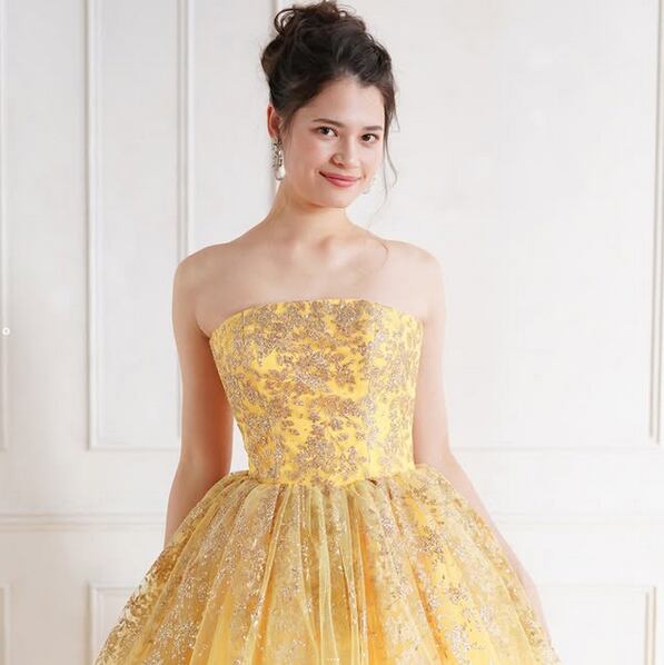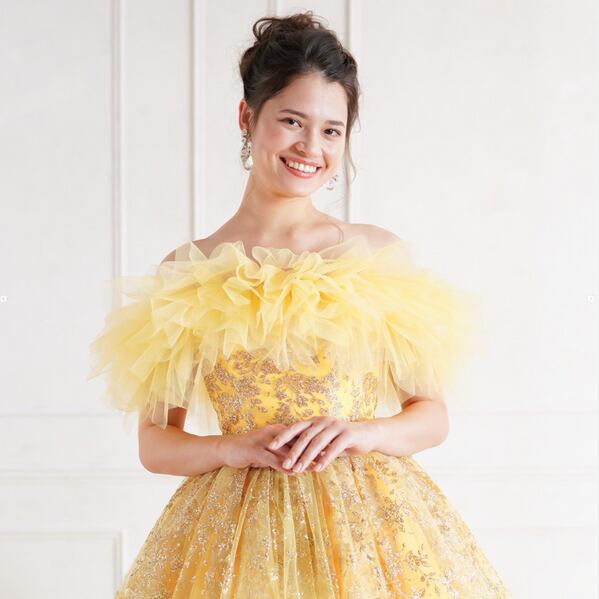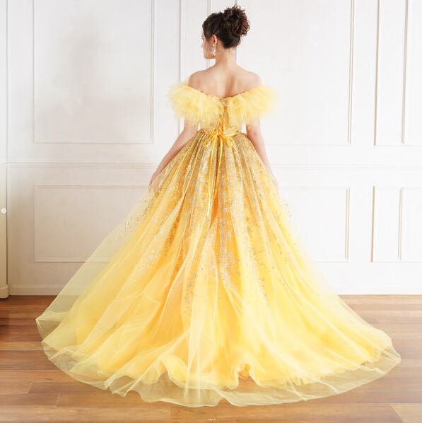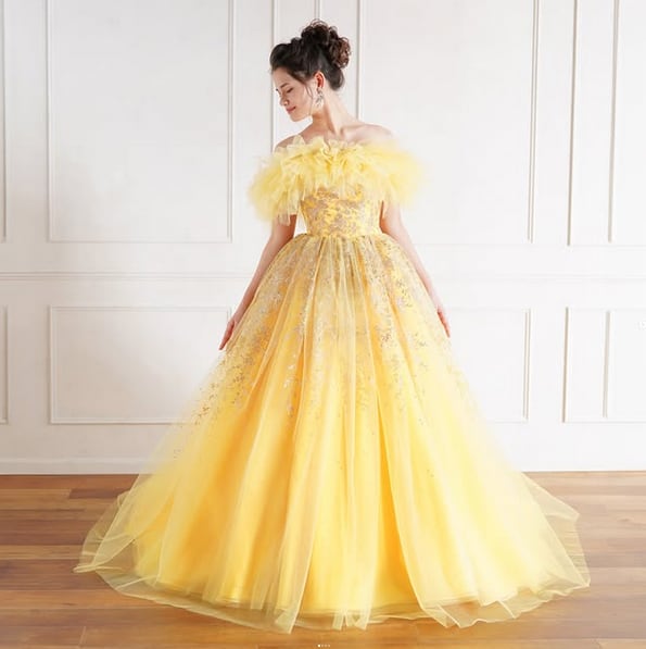高品質!キラキラレース ビビットイエロー カラードレス フリルオフショルダー Aラインドレス 高みせ パーティードレス【色変更可能】