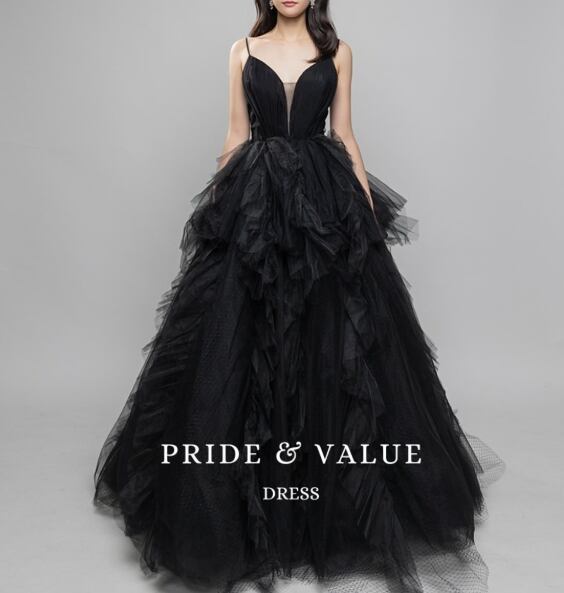 高品質!ブラック/黒 カラードレス キャミソール ボリュームドレス ラッフルフリル 高みせ パーティードレス【色変更可能】