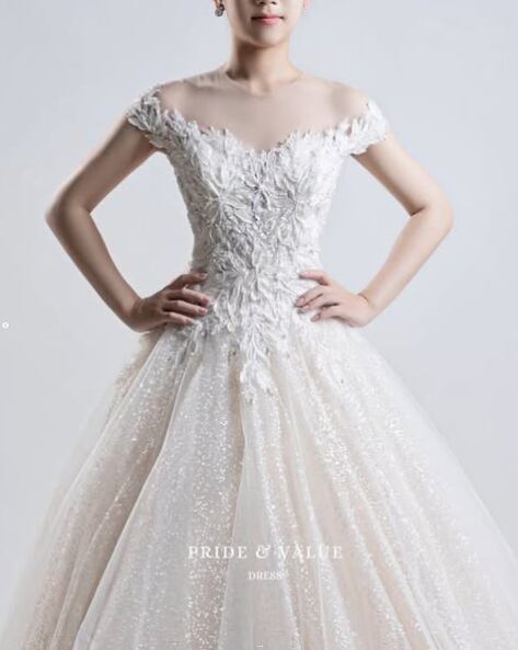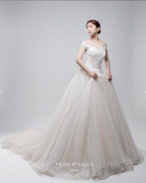 高品質!キラキラグリッターチュール ウエディングドレス 韓国風ドレス 刺繍レース Aラインドレス オフショルダー パーティードレス【オーダーメイド】