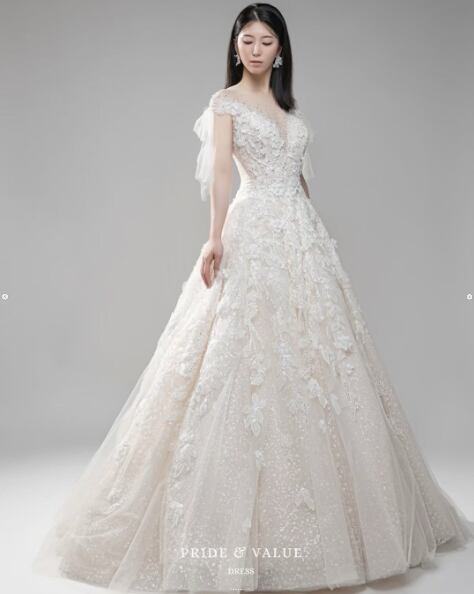 高品質!キラキラグリッターチュール ウエディングドレス 韓国風ドレス 3D立体レース刺繍 Aラインドレス パーティードレス【オーダーメイド】