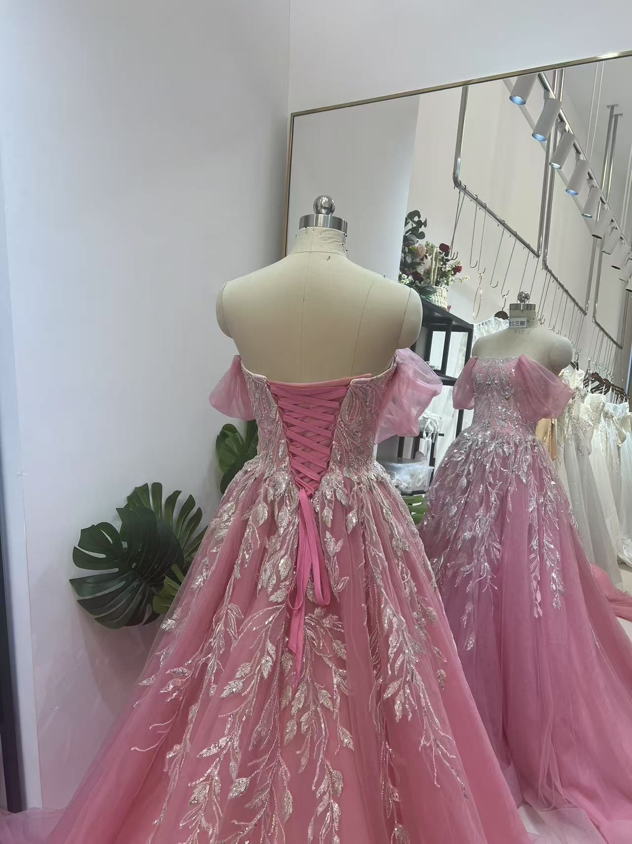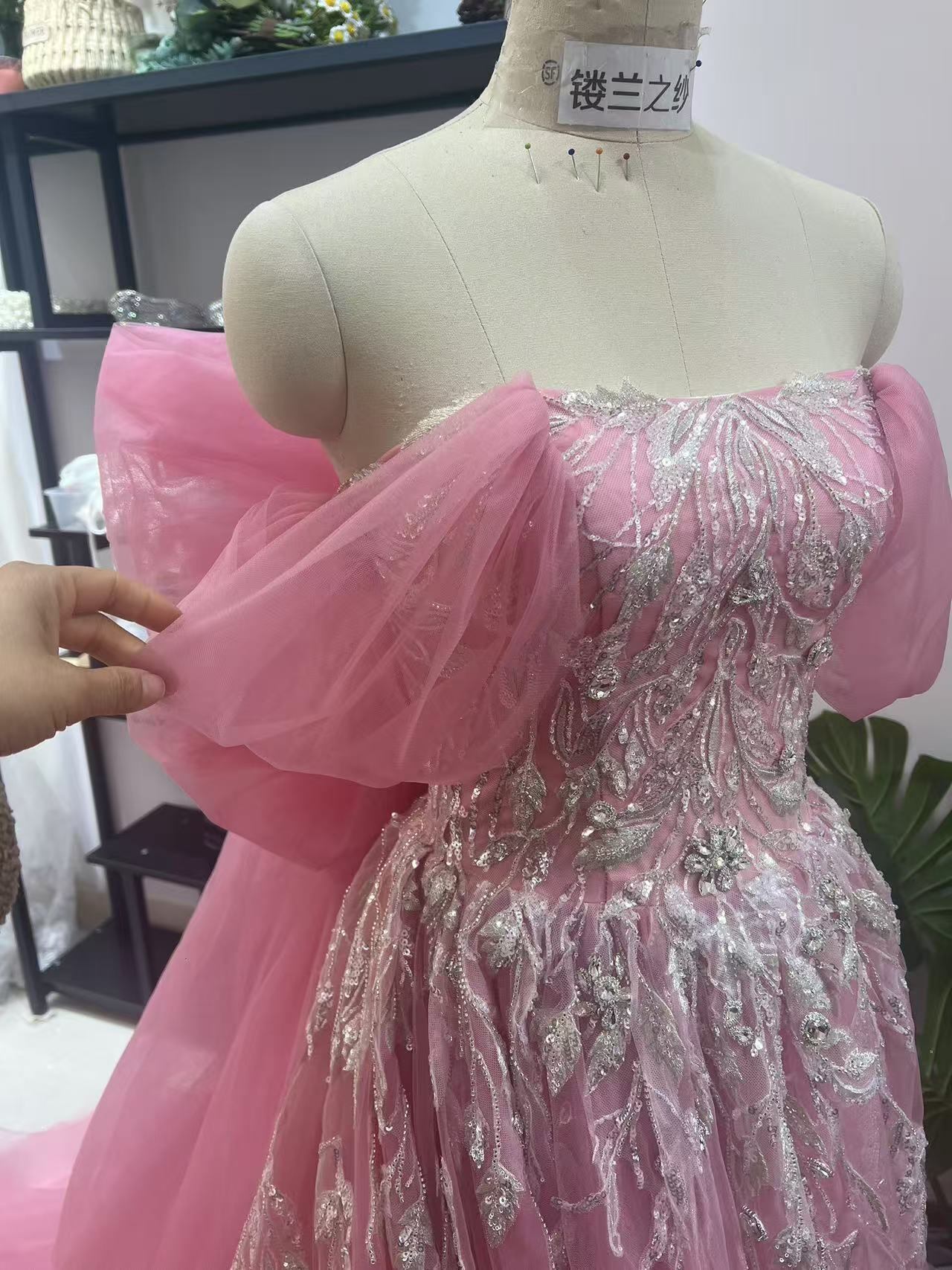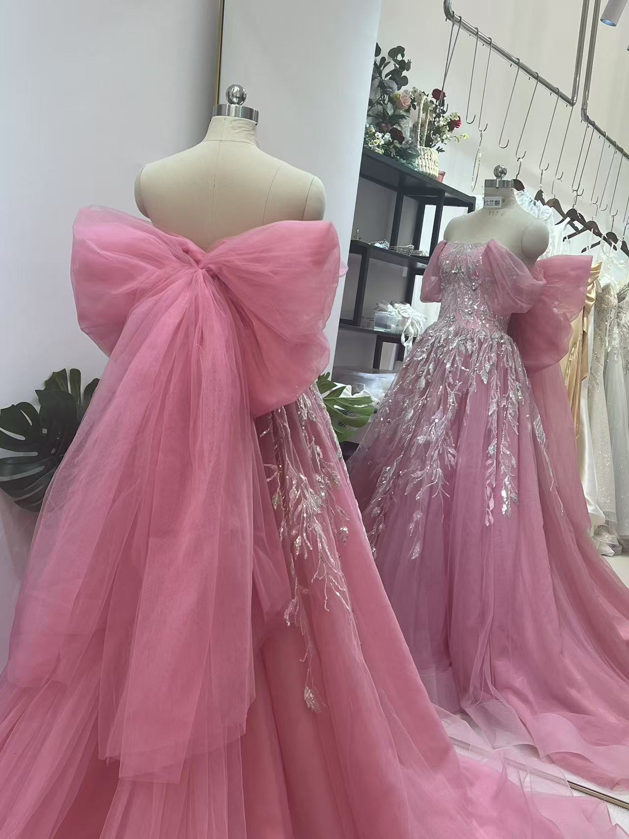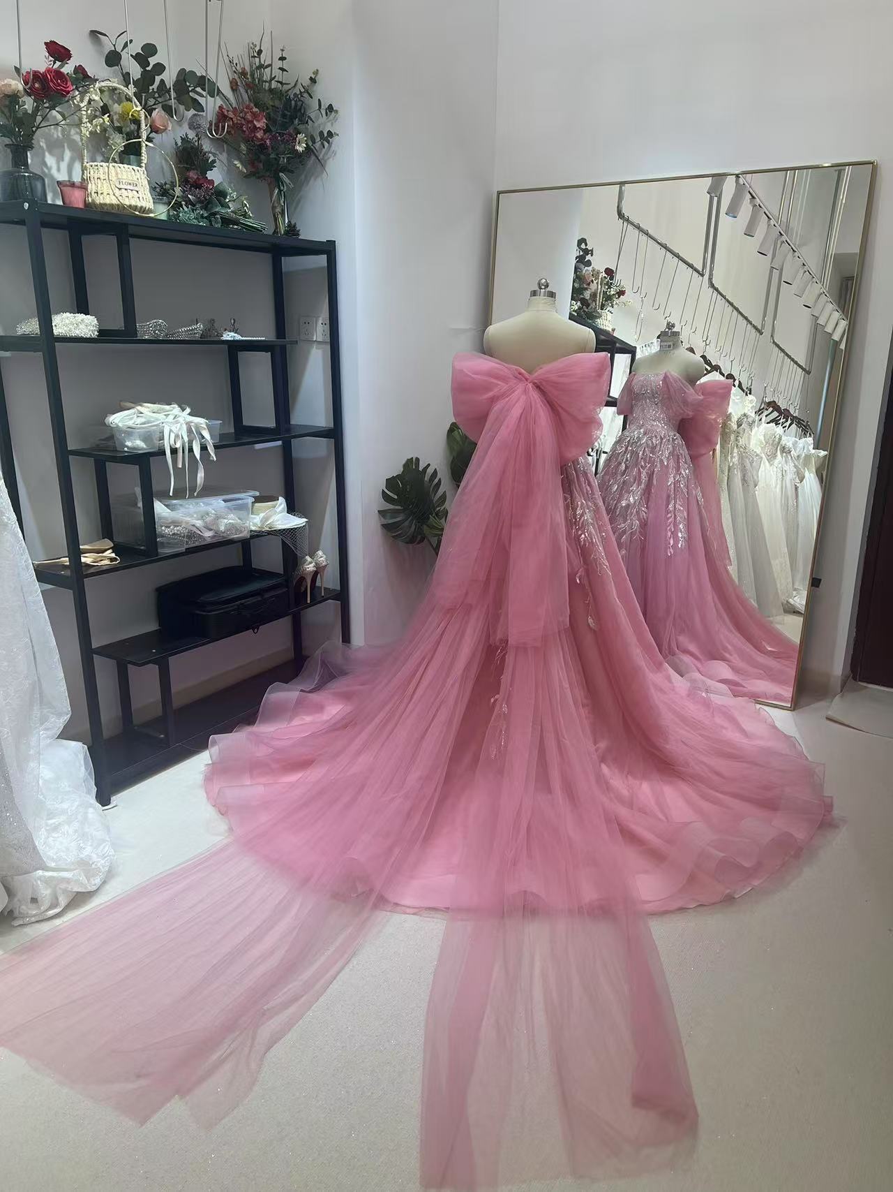 ピンク カラードレス ソフトチュール ロングトレーン オフショルダー 結婚式