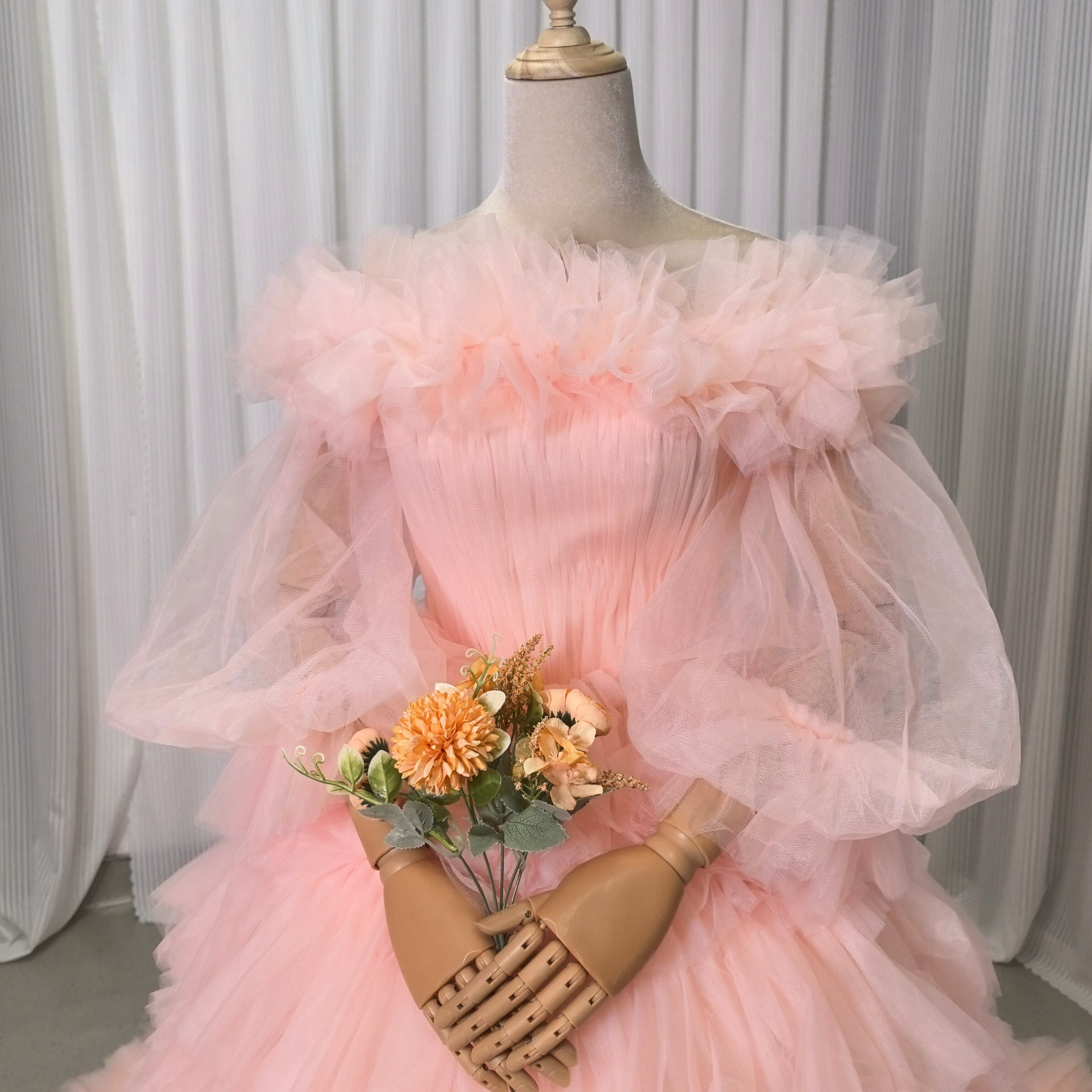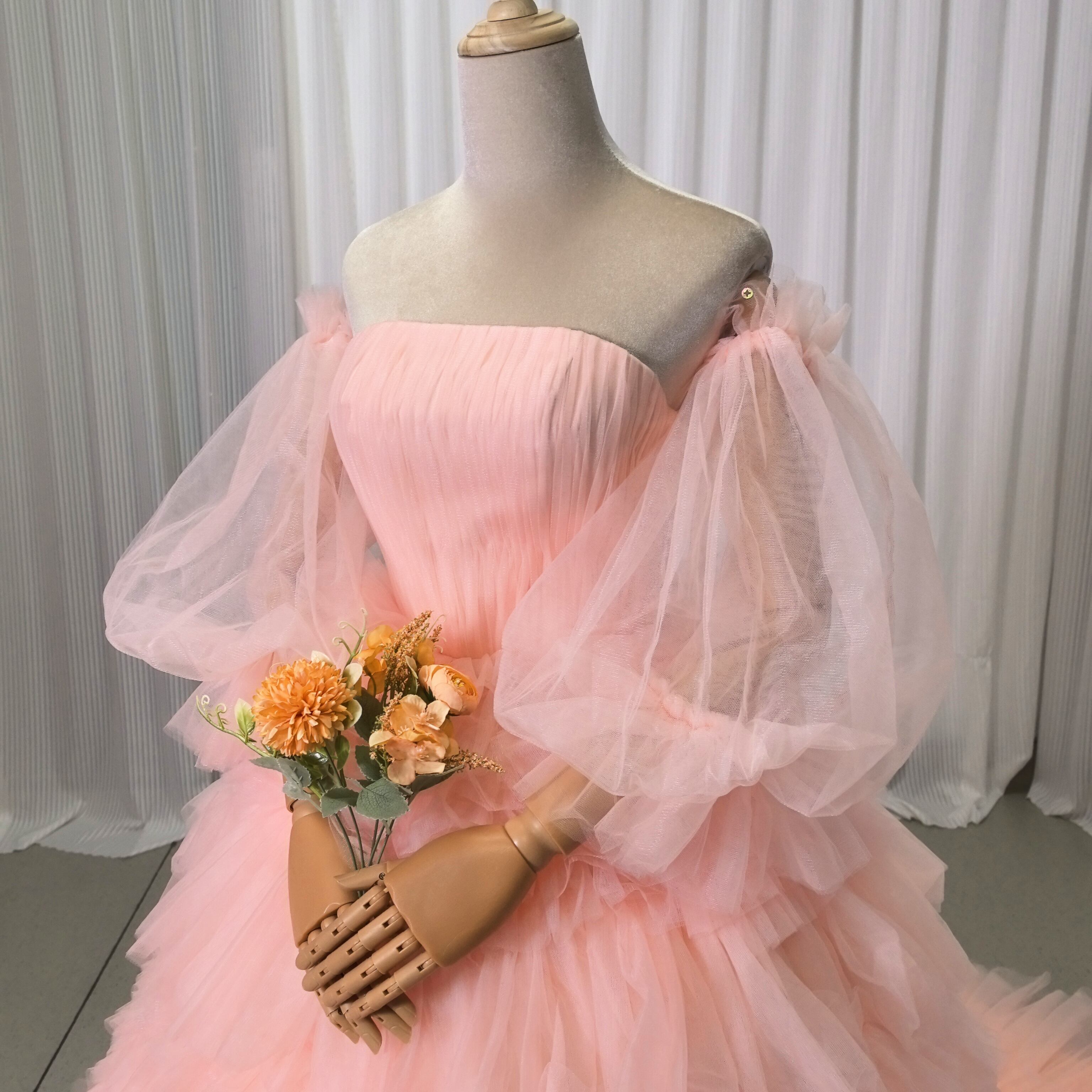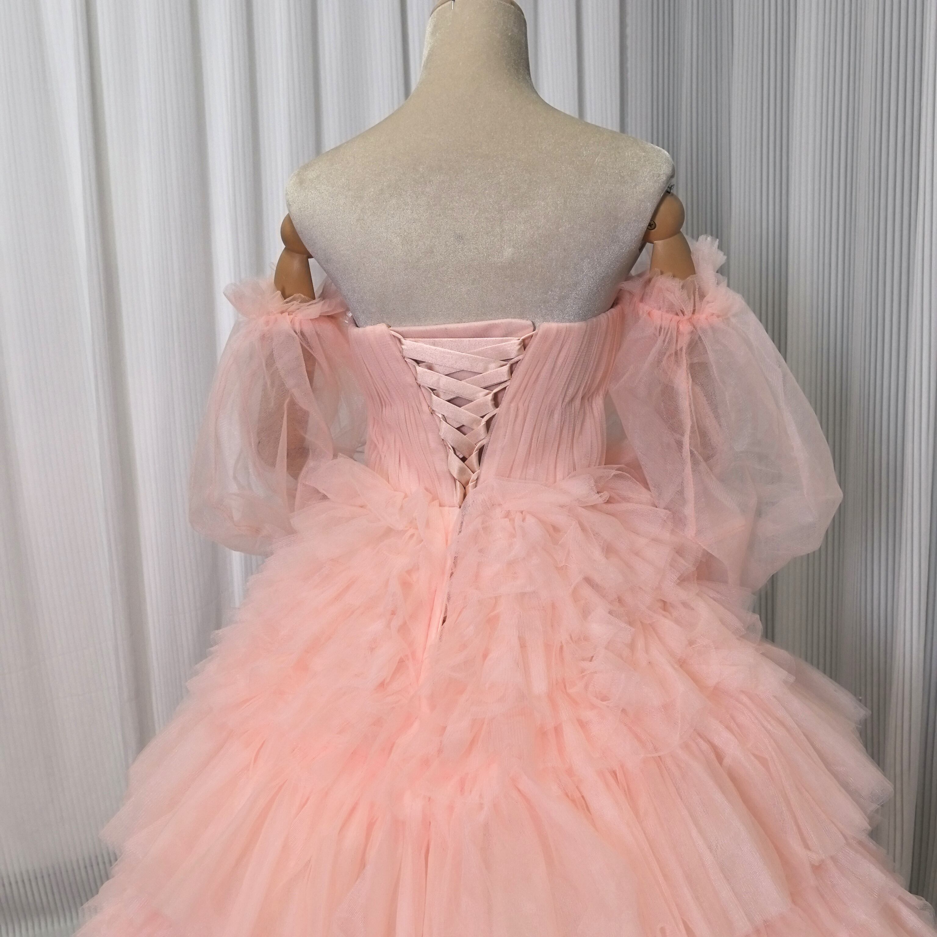 韓国風カラードレス パフスリーブ チュールドレス リボン ふわふわ ボリュームドレス +取り外し袖+ 取り外し襟
