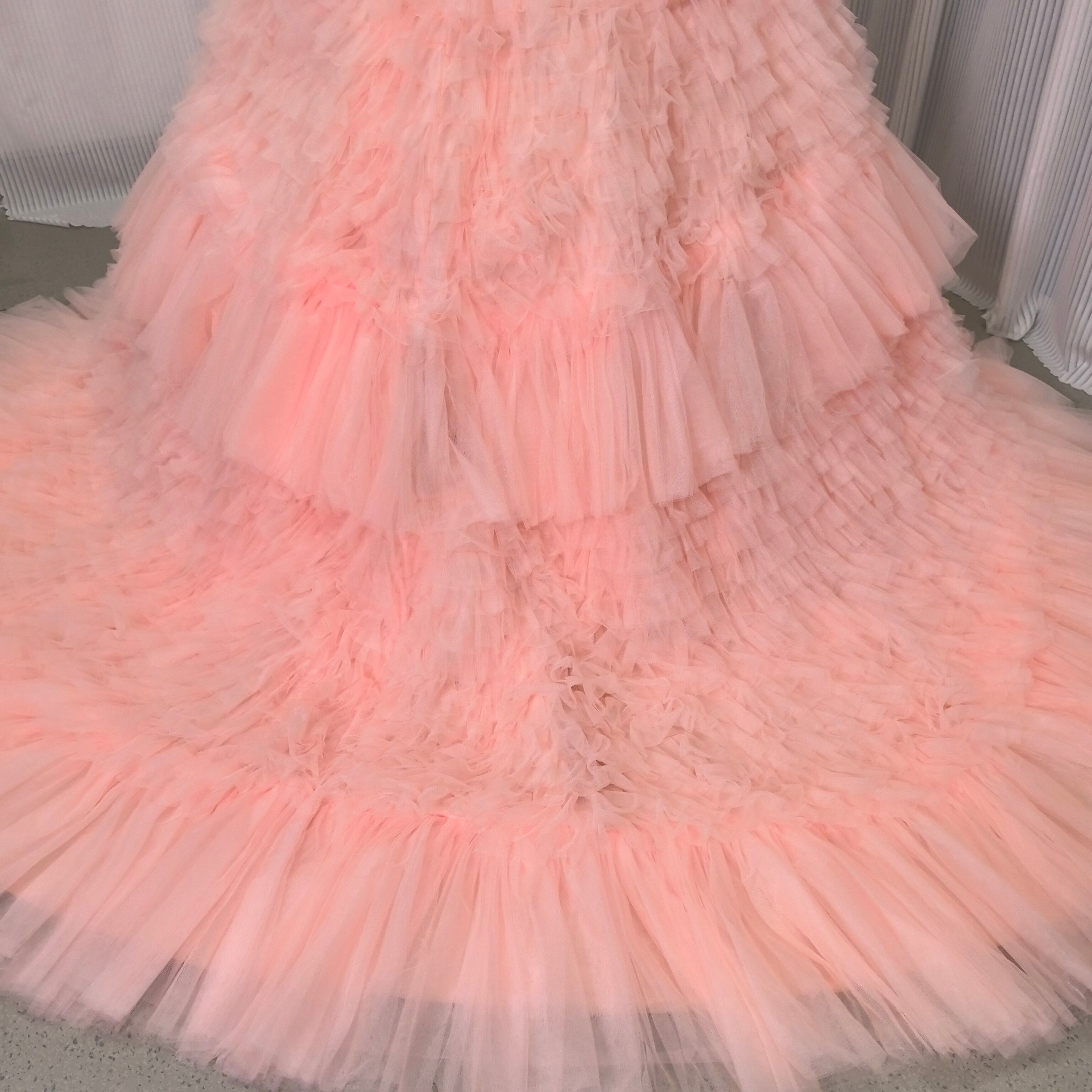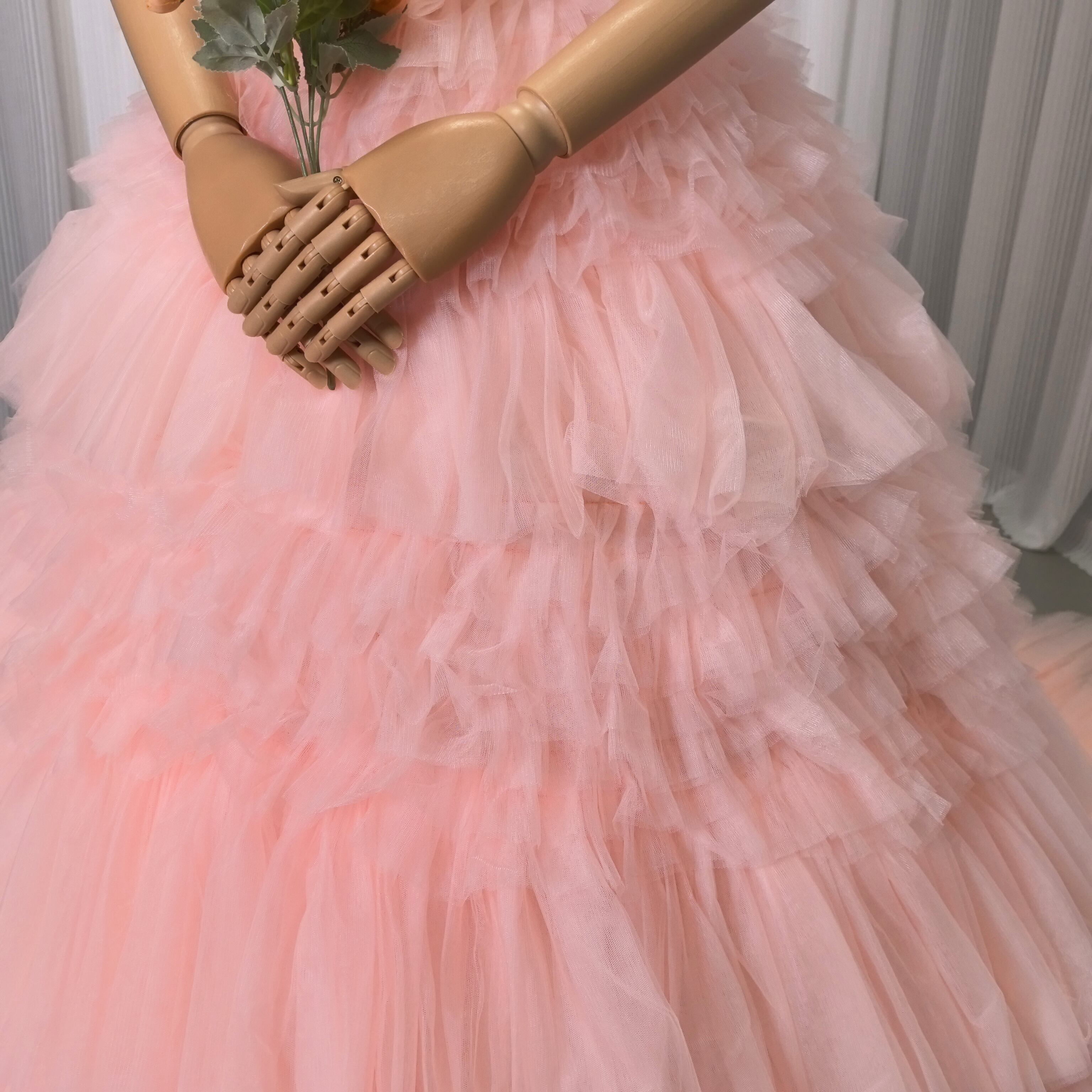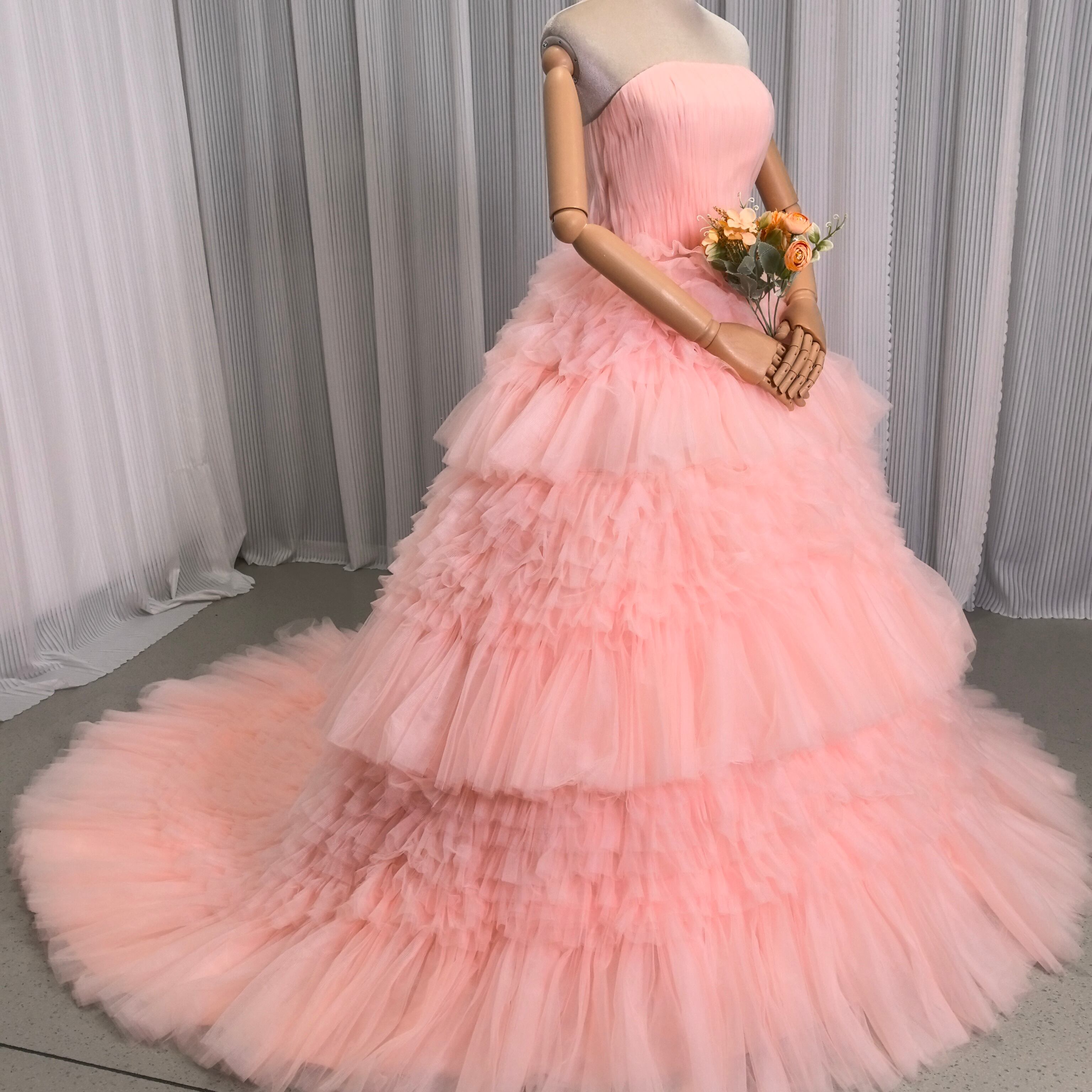 韓国風ベアトップ カラードレス パフスリーブ チュールドレス リボン ふわふわ ボリュームドレス