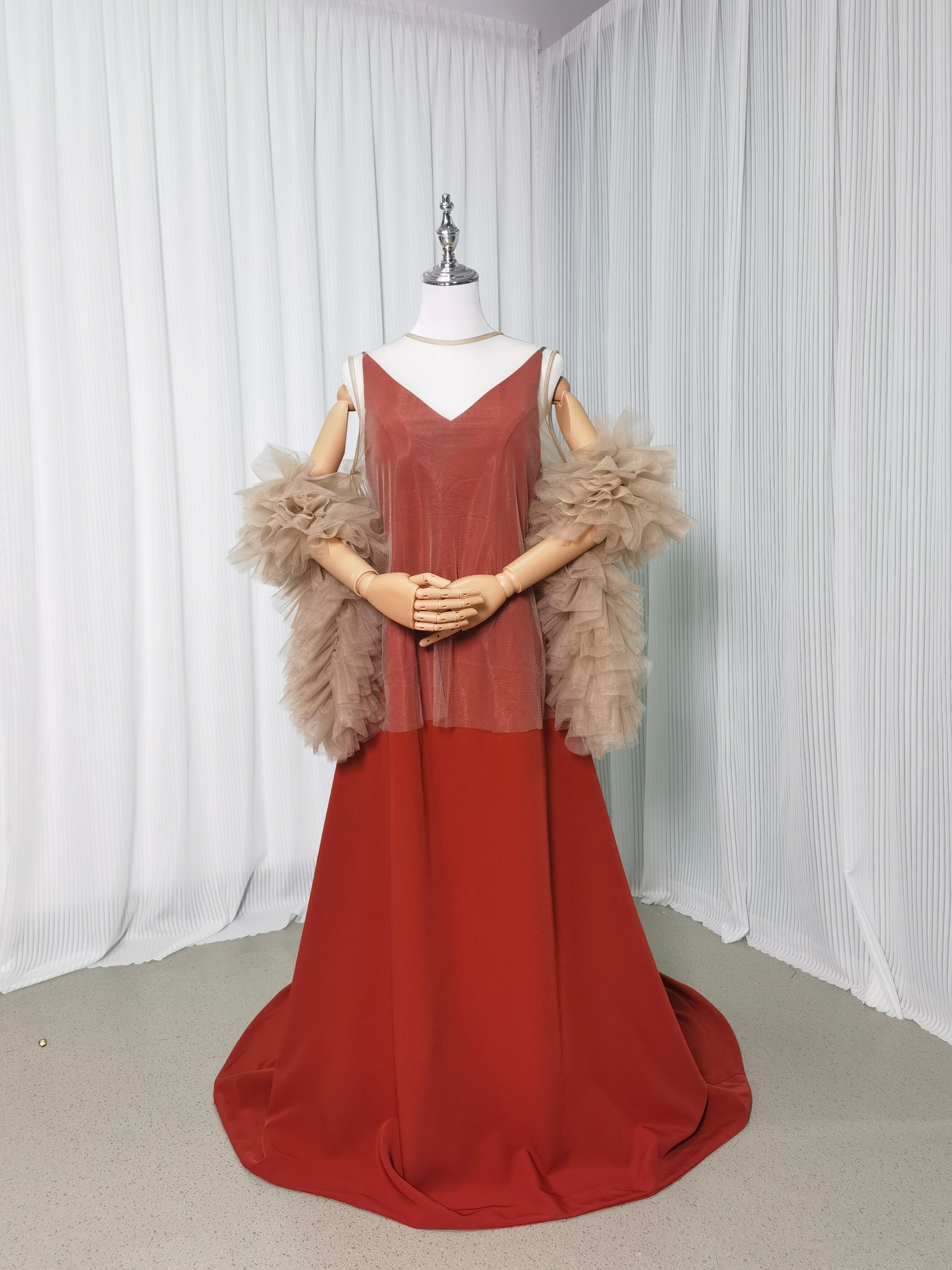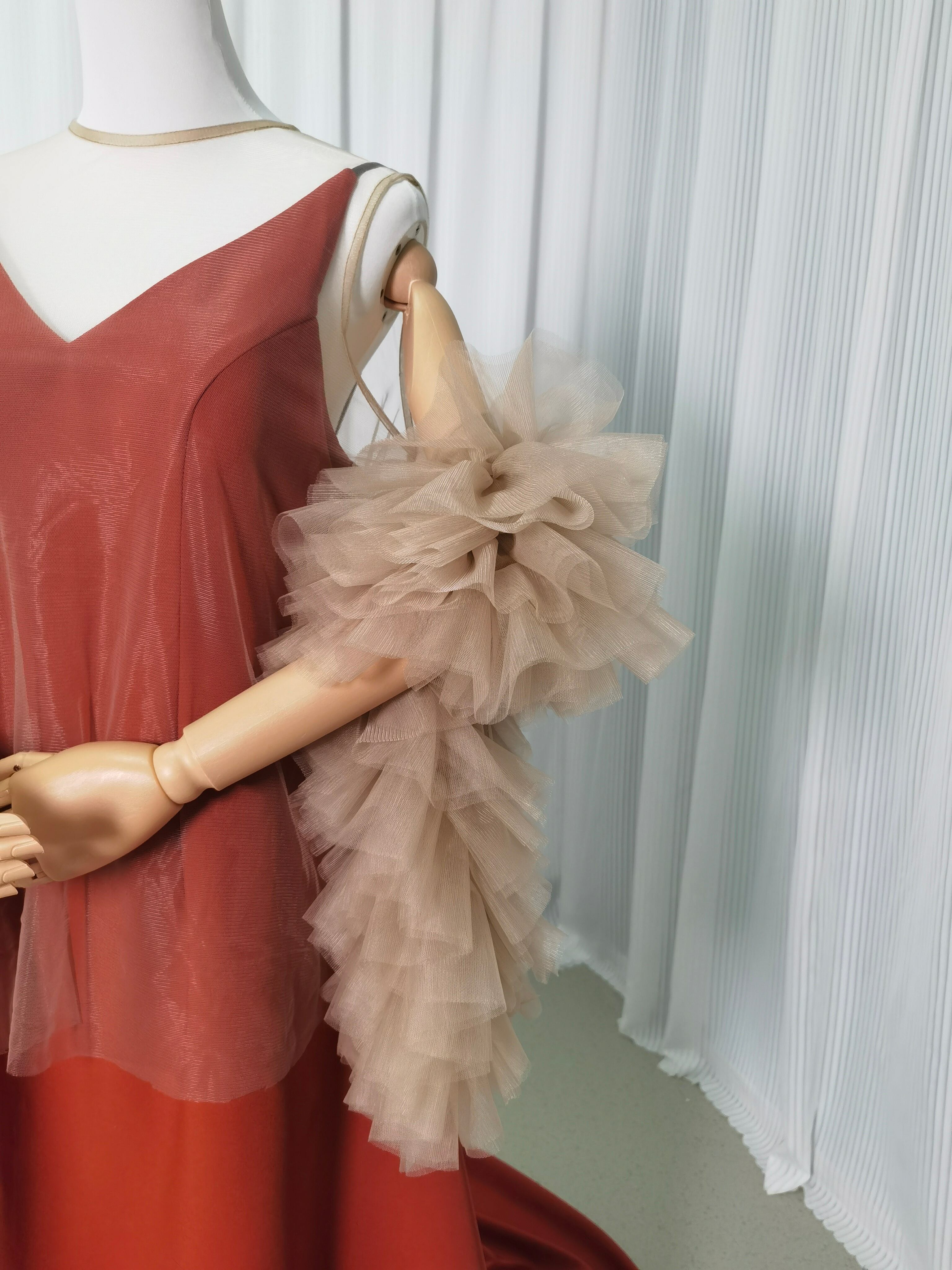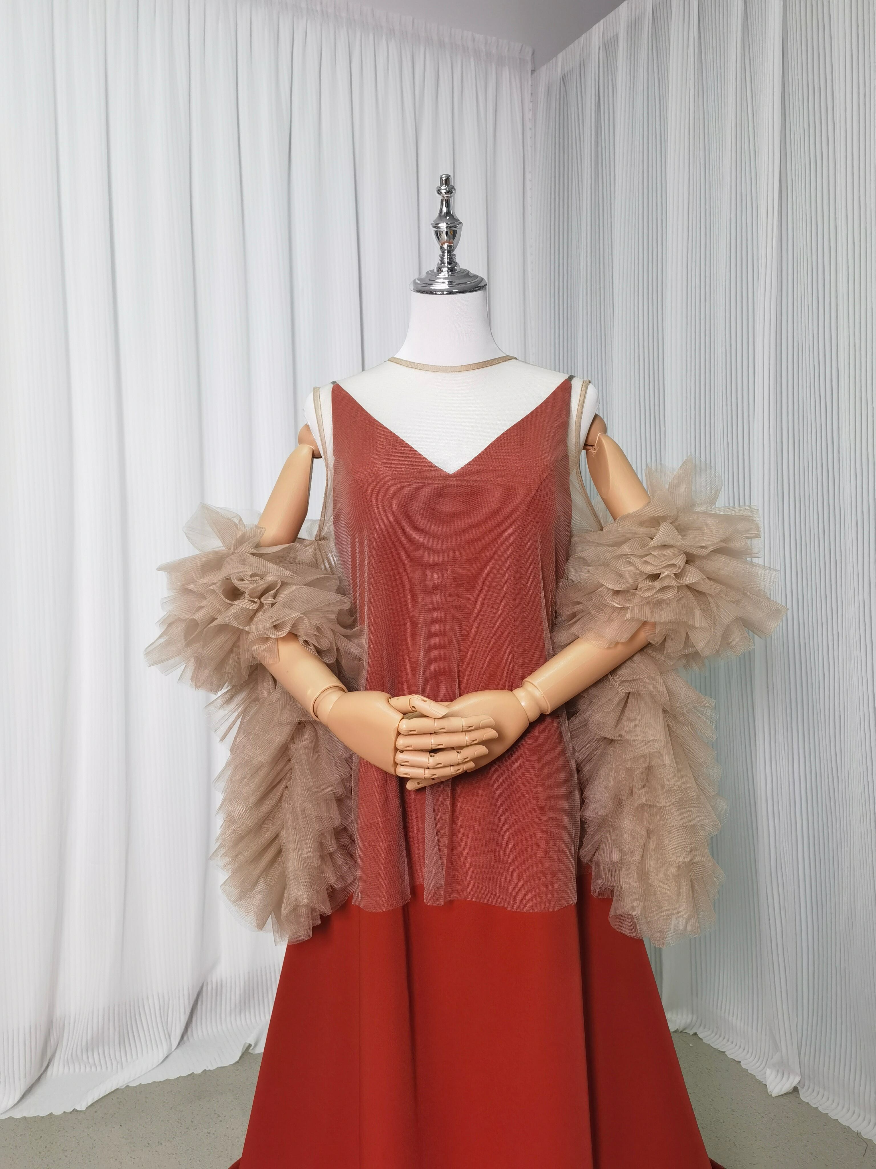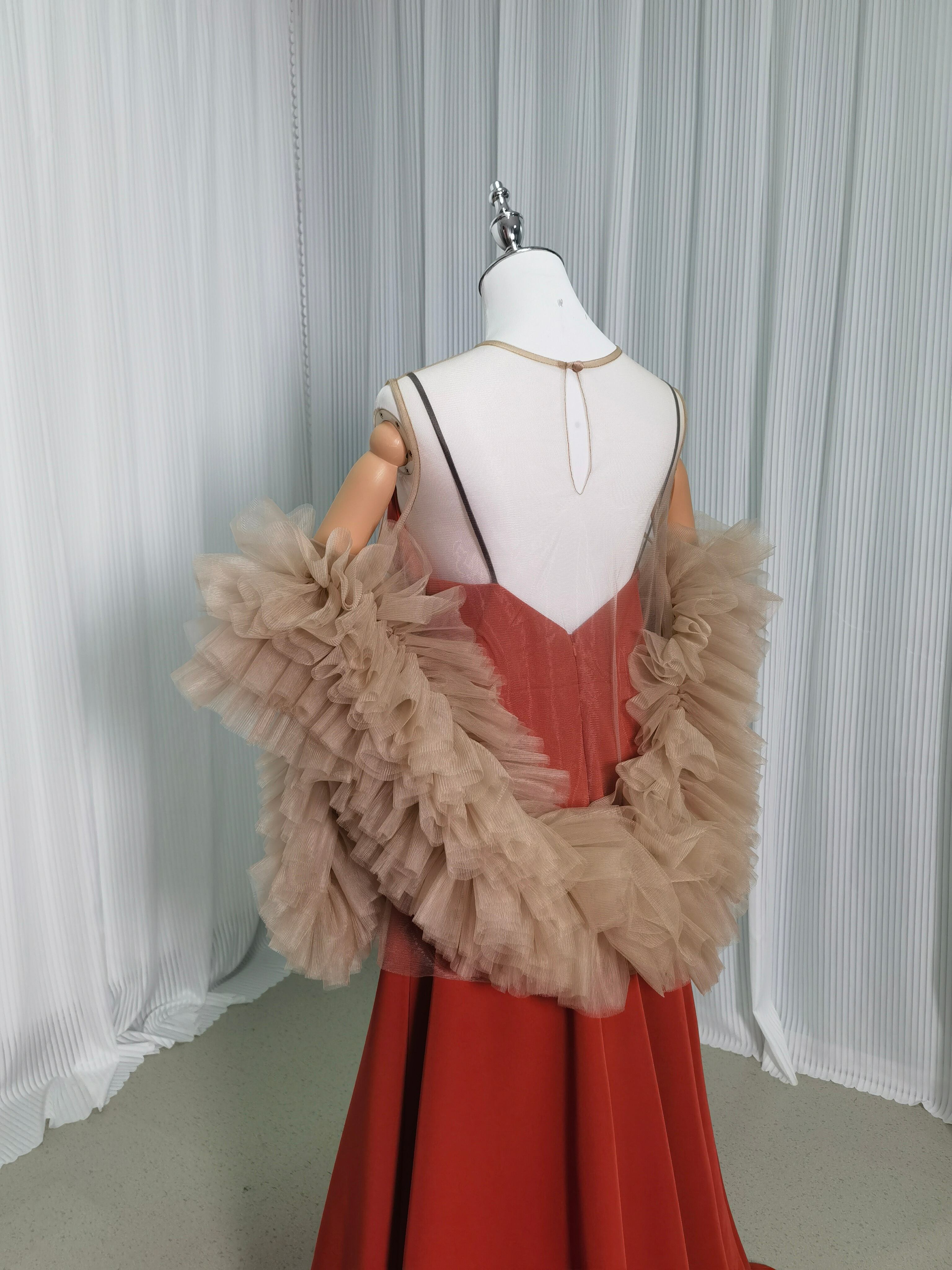 実例写真!抜群のおしゃれ見え テラコッタ色 パーティードレス 2WAY カラードレス トレーン ポンチョ+薄シャンパンの色 ソフトチュール 演奏会 | David1021k Dress(ダヴィドレス)