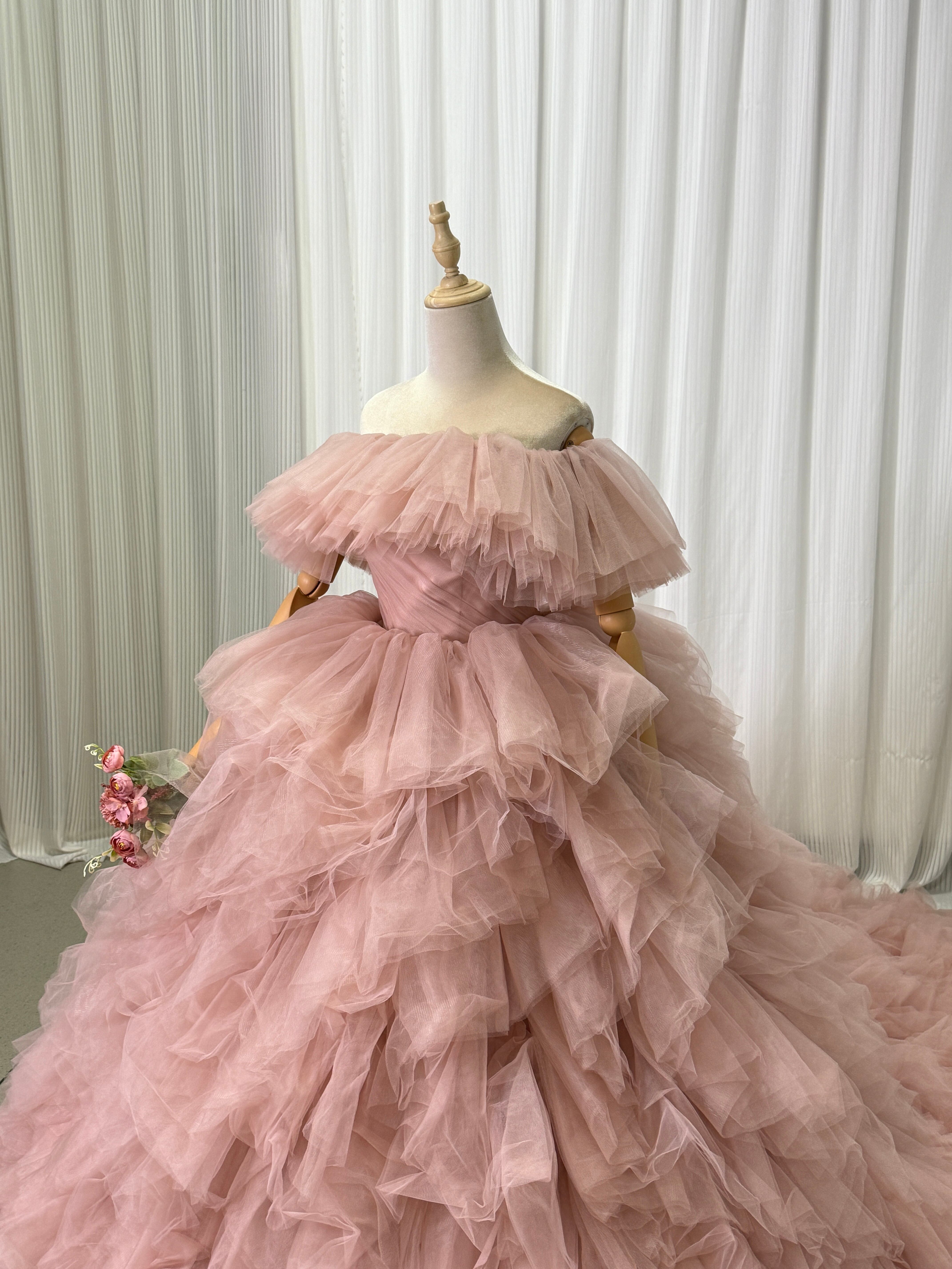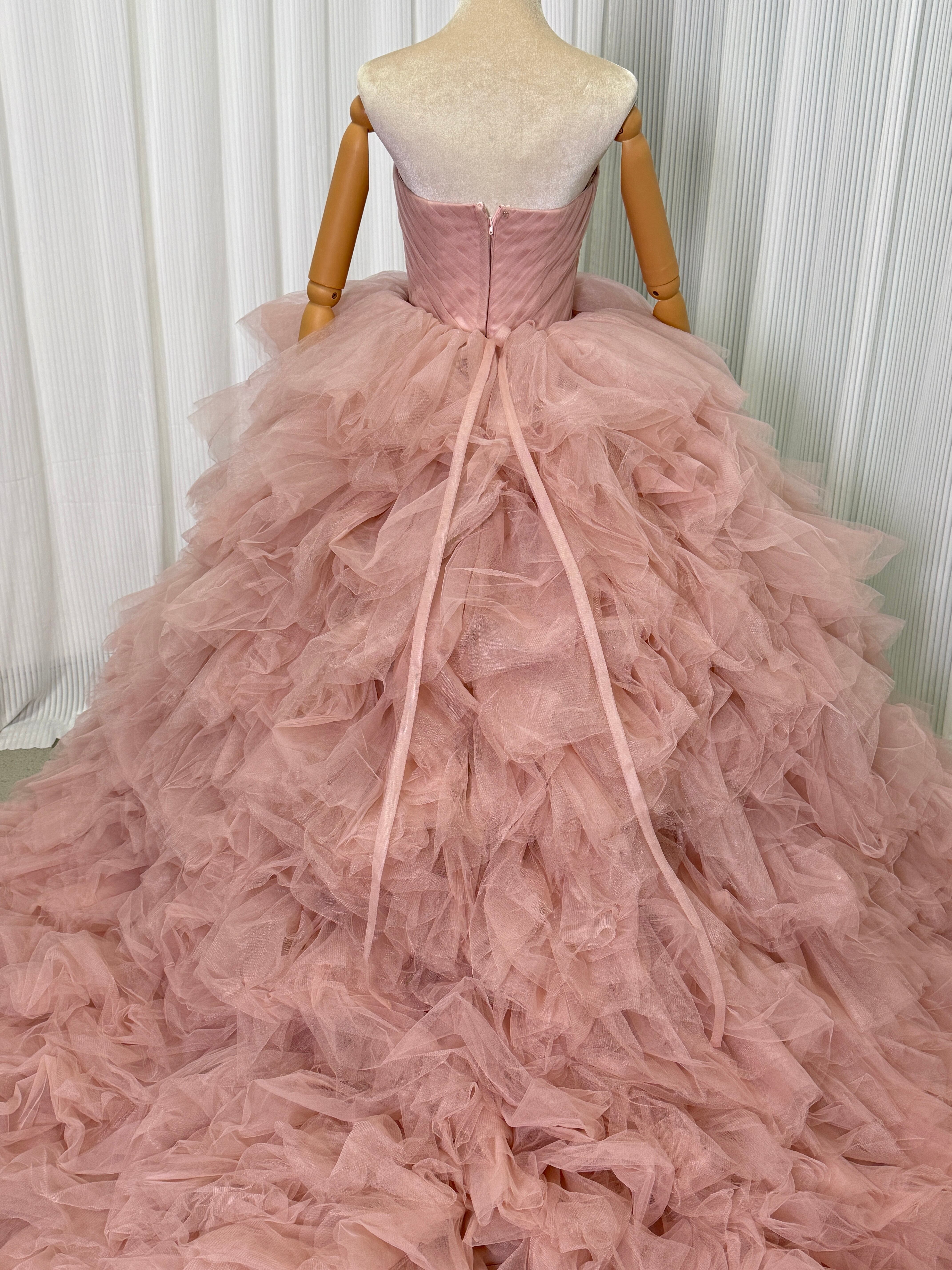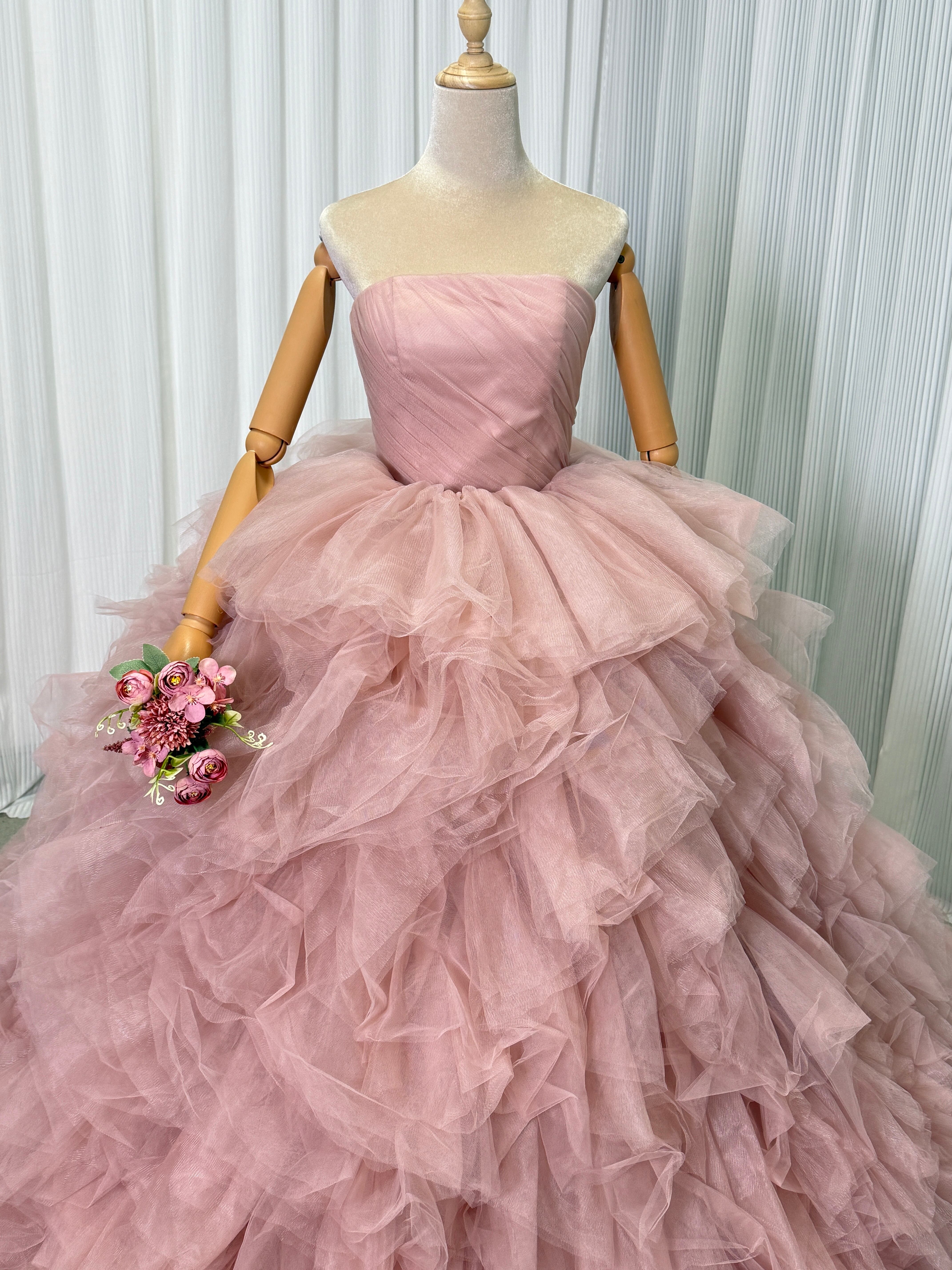 美品!ピンク 取り外しオフショルダー カラードレス ソフトチュール 柔らかく重ねたチュールスカート 3点セット結婚式