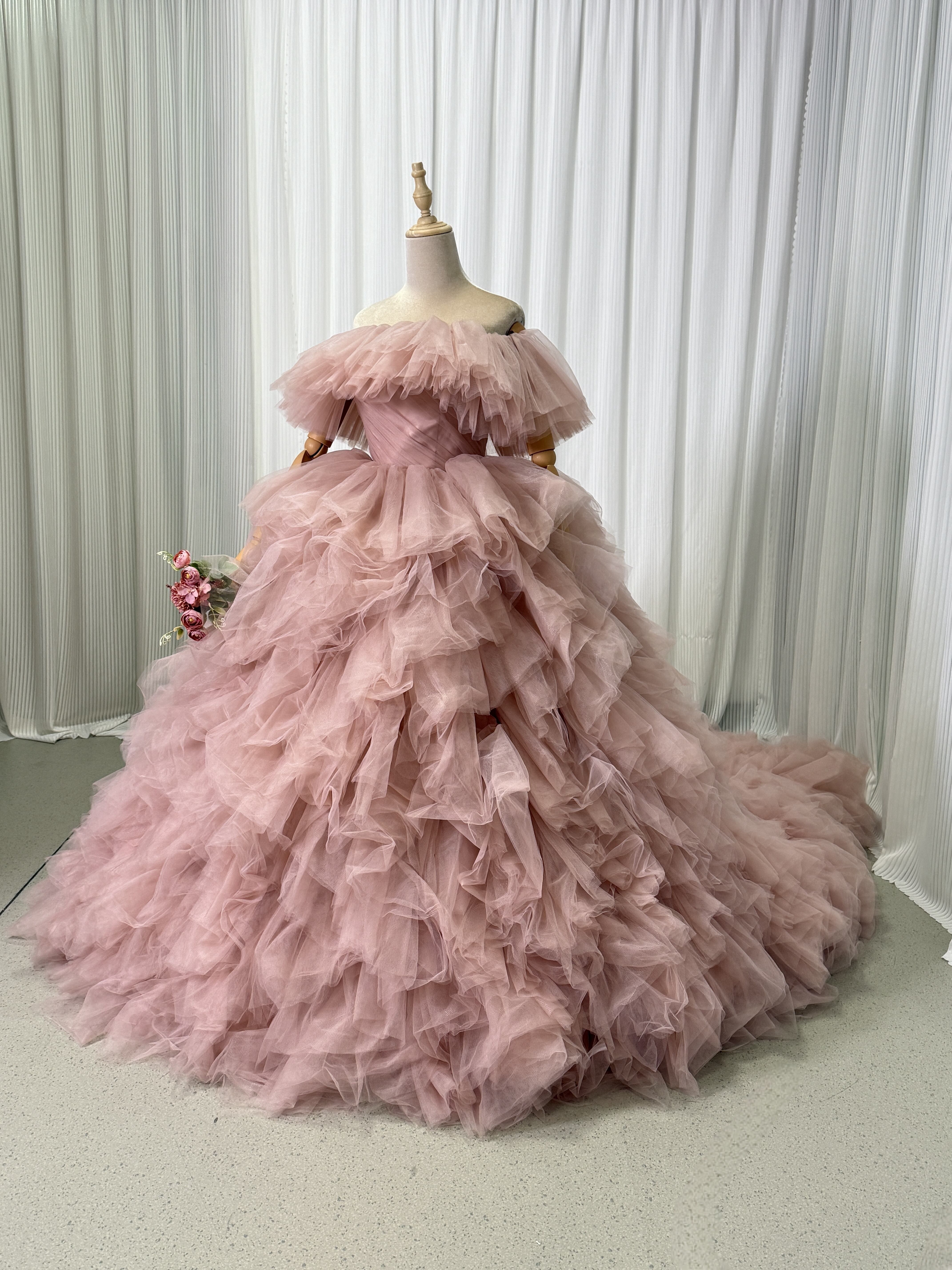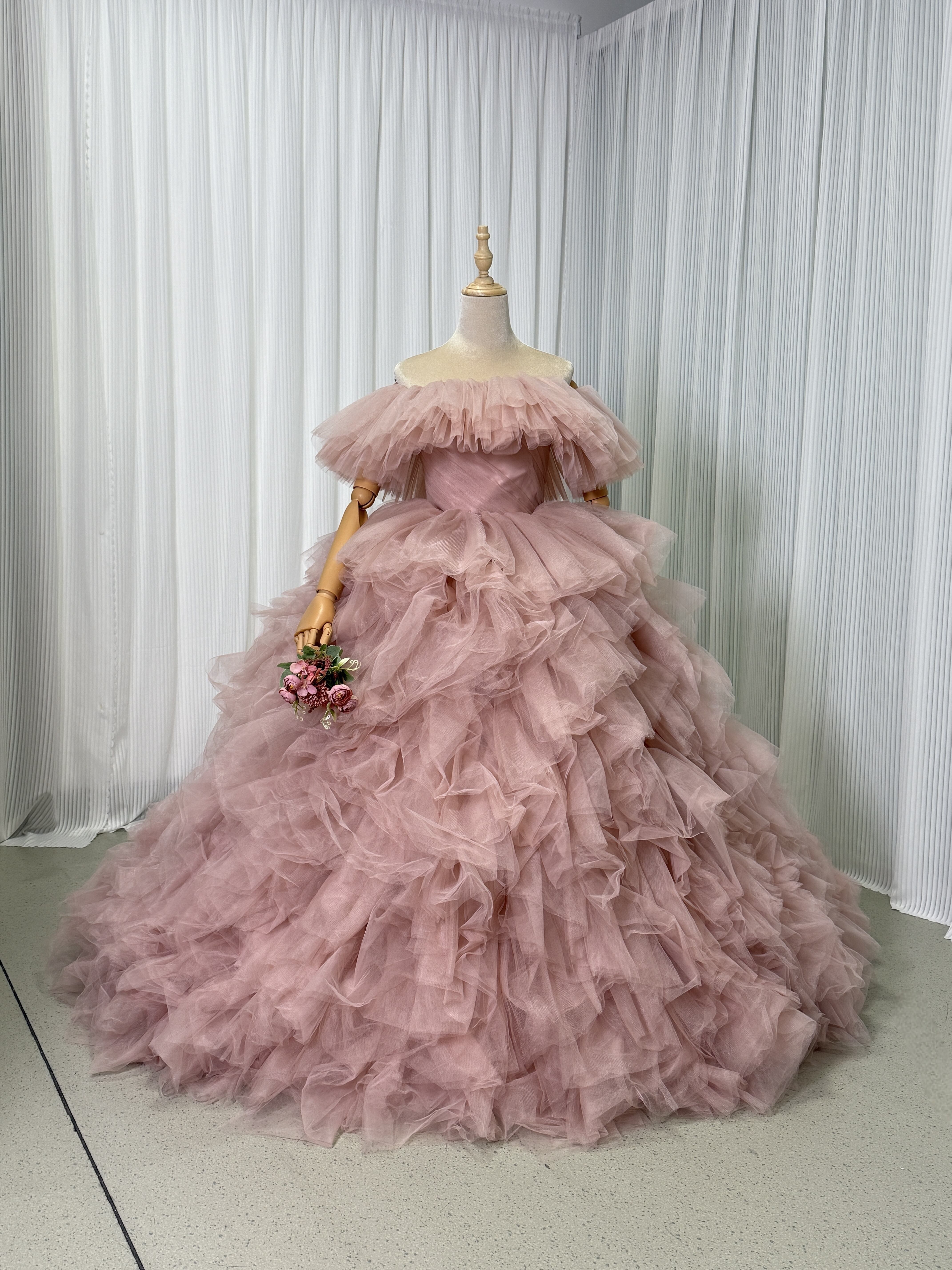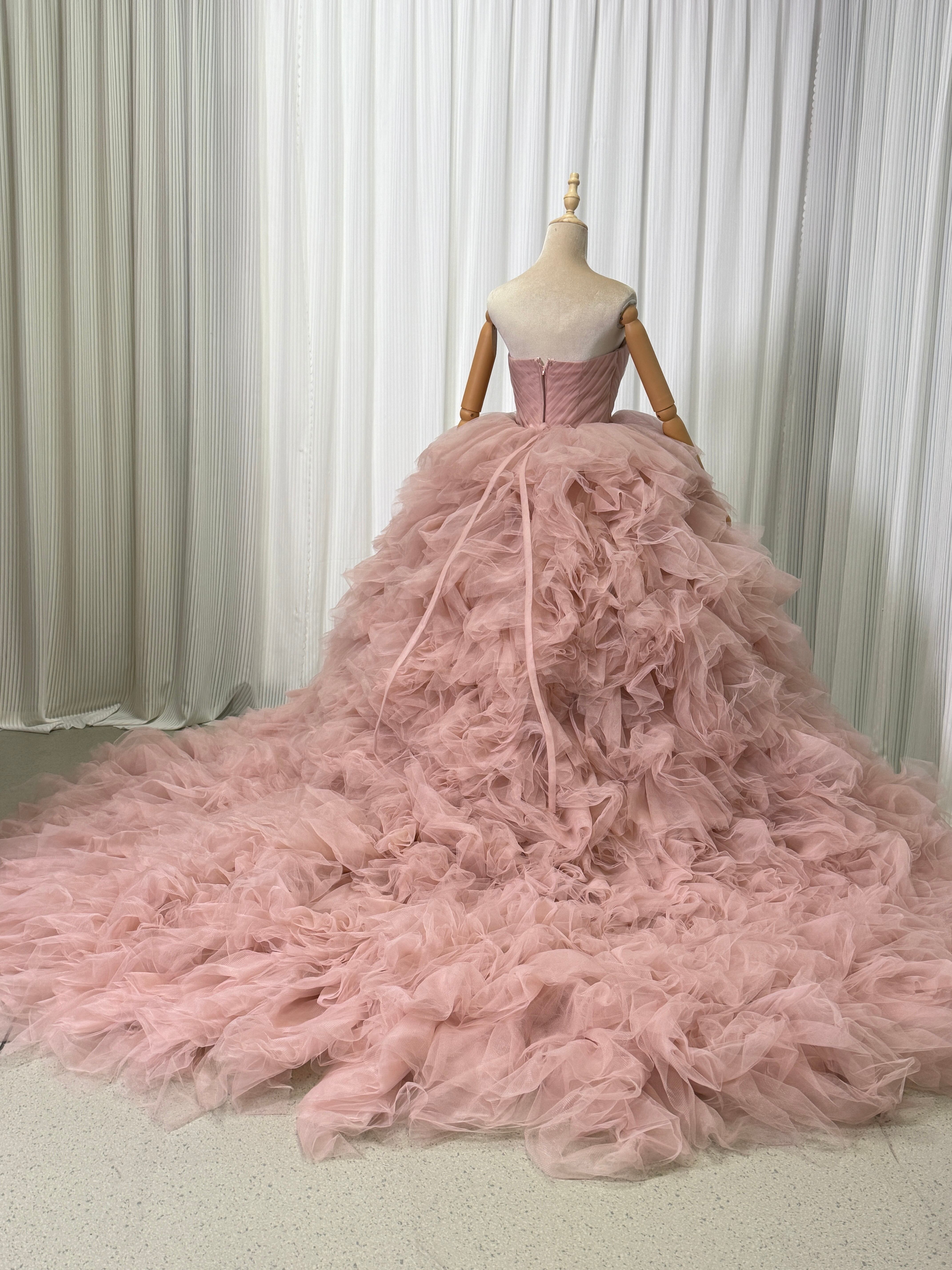 美品!ピンク 取り外しオフショルダー カラードレス ソフトチュール 柔らかく重ねたチュールスカート 3点セット結婚式