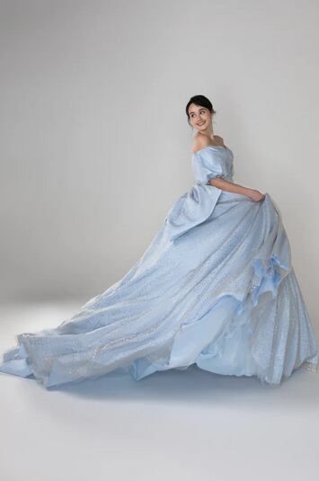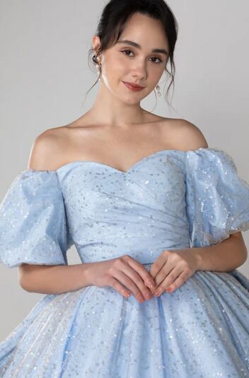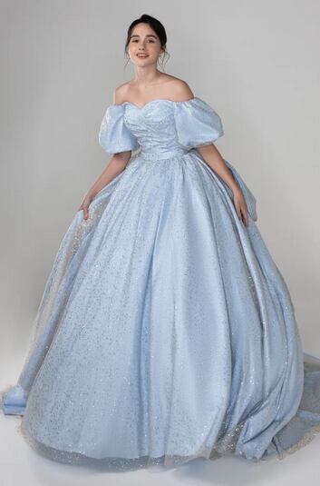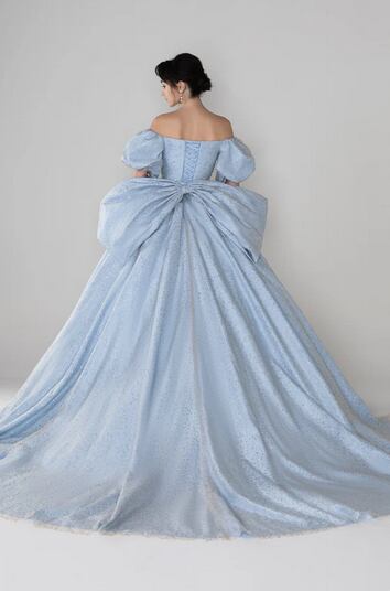 美品!ライトスカイブルー カラードレス バックリボン ベアトップビスチェ ミディアムドレス パーティードレス キラキラグリッターチュール【色変更可能】