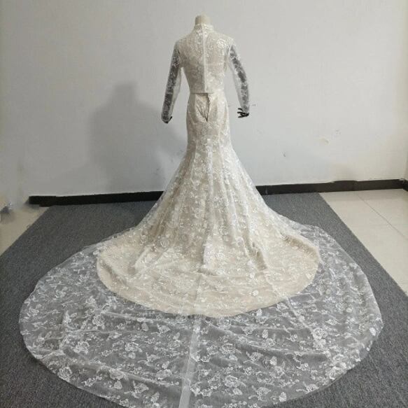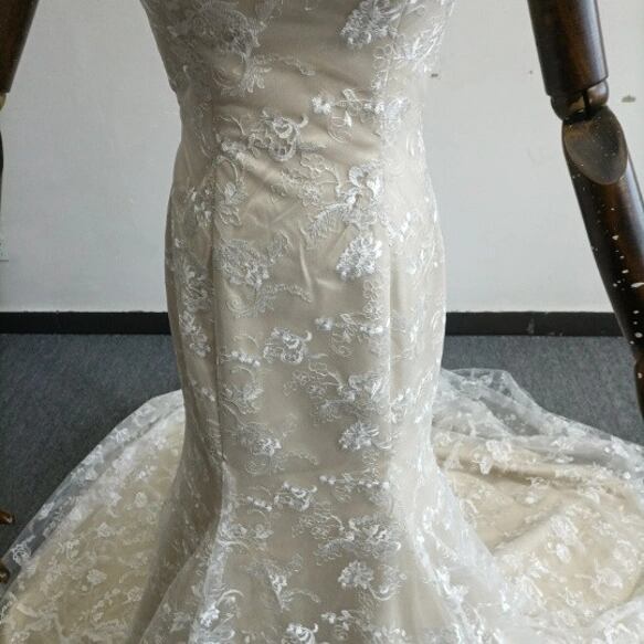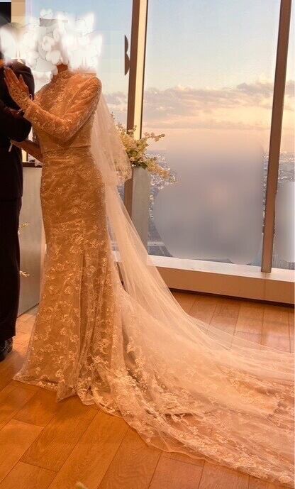実例写真!人気上昇! ベアトップ 薄シャンパンカラードレス ート3D立体レース刺繍 長袖 マーメイドラインパーティードレス お色直し
