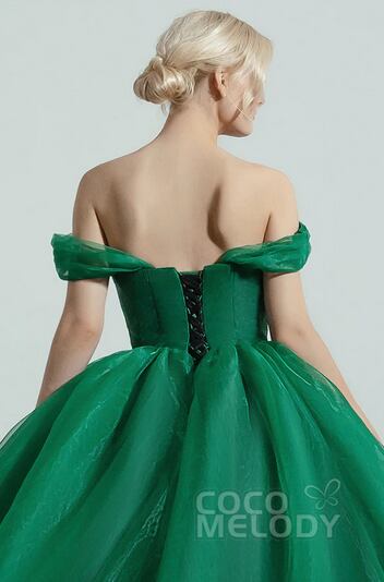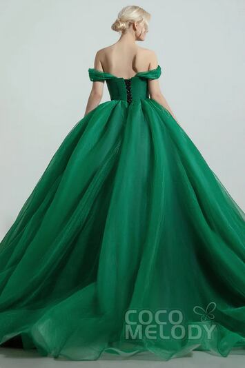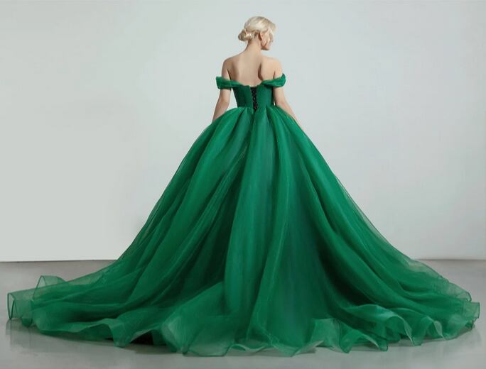 美品!カラードレス 濃いグリーン/緑 オフショルダー 上質オーガンジー ミディアムドレス パーティードレス ダンスドレス【色変更可能】