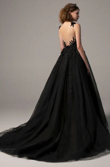 美品!ブラック/黒 カラードレス フロントスリット チュールスカート バックレス キャミソール 繊細レース パーティードレス セクシー【色変更可能】