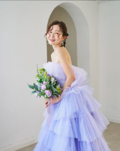 高品質!パープル/紫 カラードレス ベアトップ ボリュームドレス ティアードドレス 高みせ プリーツチュール パーティードレス【色変更可能】