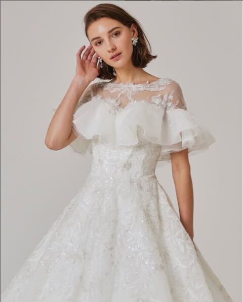 美品!フェミニン ウエディングドレス ラウンドネック かわいい フリル袖 Aラインドレス 繊細キラキラレース パーティードレス【オーダーメイド】