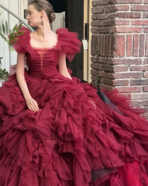 高品質!ワイレッド ボルドー色 カラードレス ラウンドネック ボリュームドレス ランダムなフリルドレス 高みせ ふわふわパーティードレス【色変更可能】