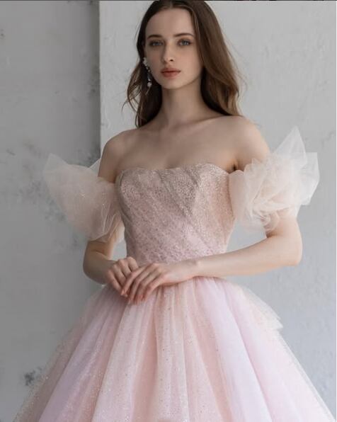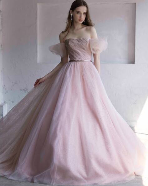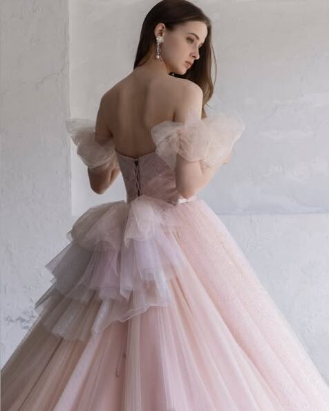 美品!カラードレス ミスティピンク 薄ピンク バックリボン 付け袖 トレンド 編み上げ式 ミディアムドレス パーティードレス 前撮り【色変更可能】