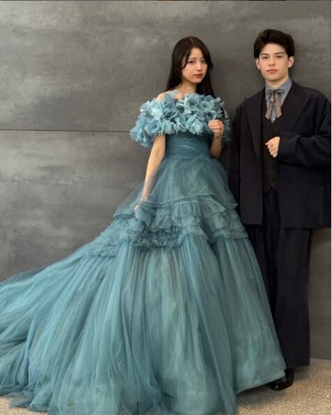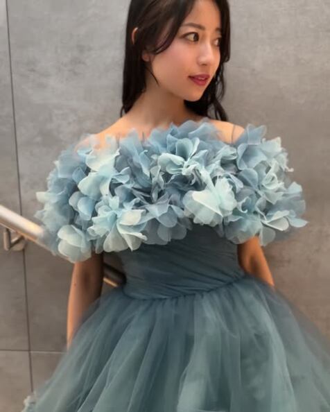 高品質!カラードレス フリルオフショルダー ミスティブルー ラッフルフリル ボリュームドレス 高みせ ふわふわパーティードレス【色変更可能】