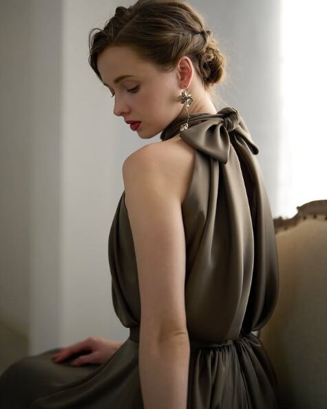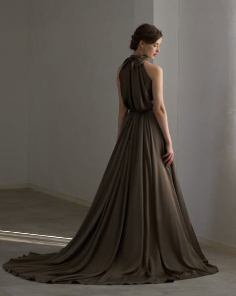 高品質!カーキ色 カラードレス オリーブカラー ホルターネック ストレートスタイル ミディアムドレス 高みせ パーティードレス【色変更可能】