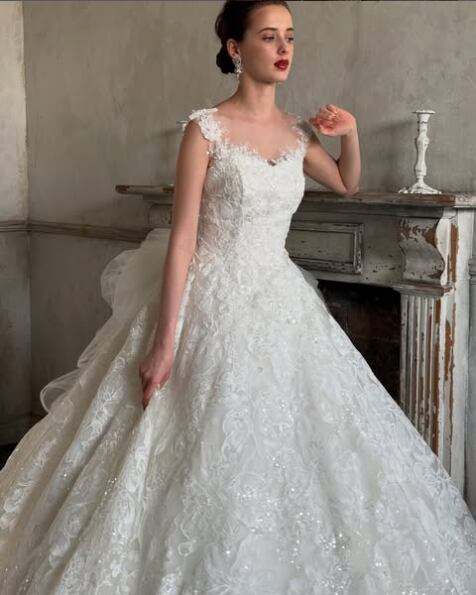 美品!フェミニン ウエディングドレス 総レースドレス かわいい ノースリーブ 繊細レーストレーン プリンセスライン パーティードレス【色変更可能】